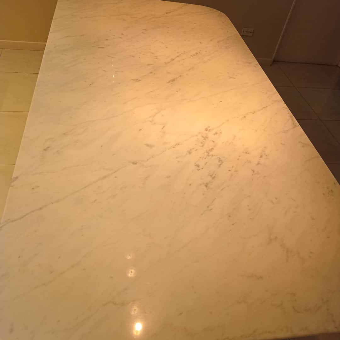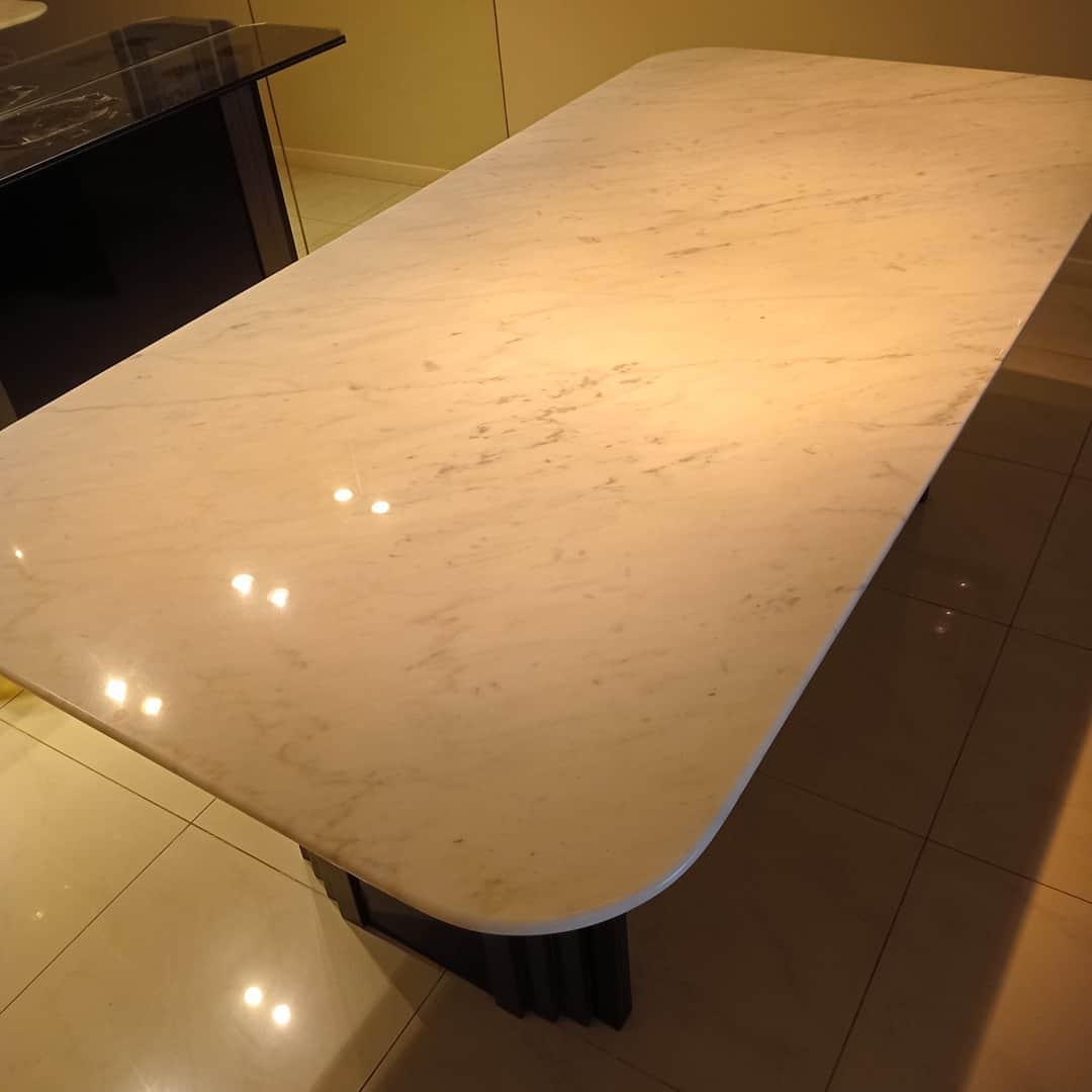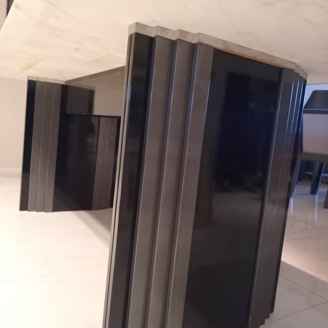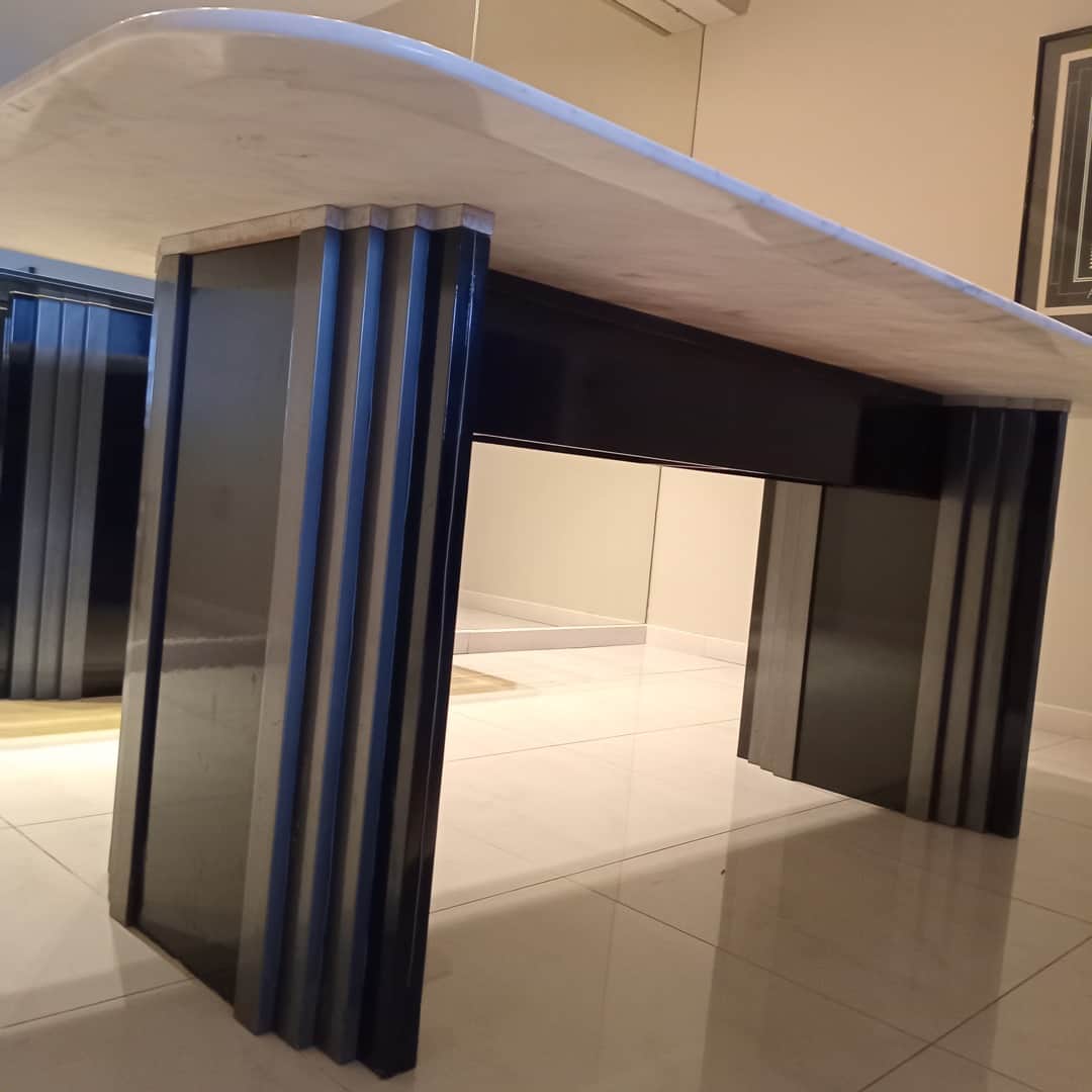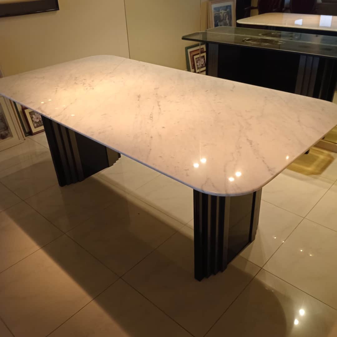 Mesa de comedor con tapa de mármol y 2 apoyos en madera laqueada color negra. 190 x 95 cm. Atención: baja por ascensor.