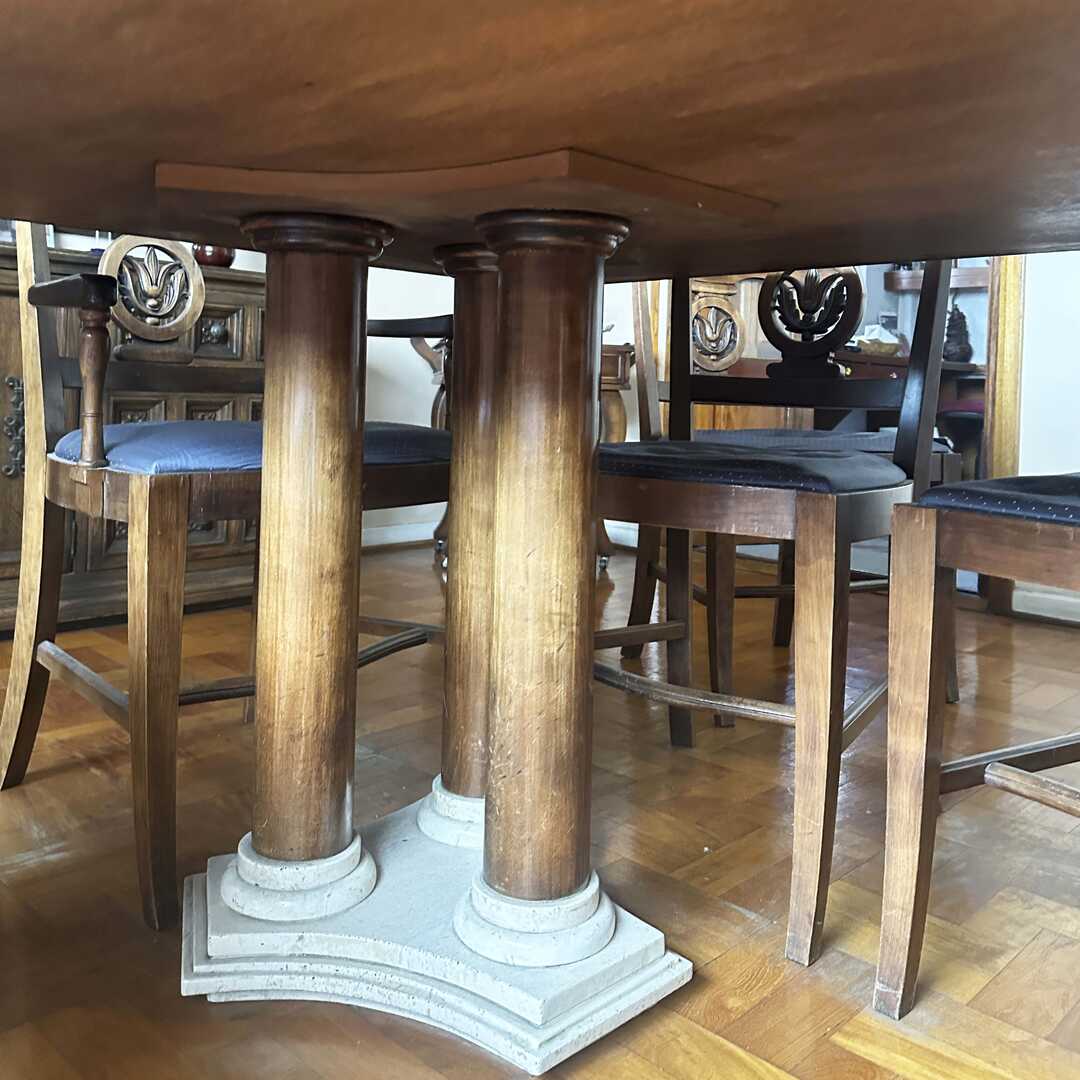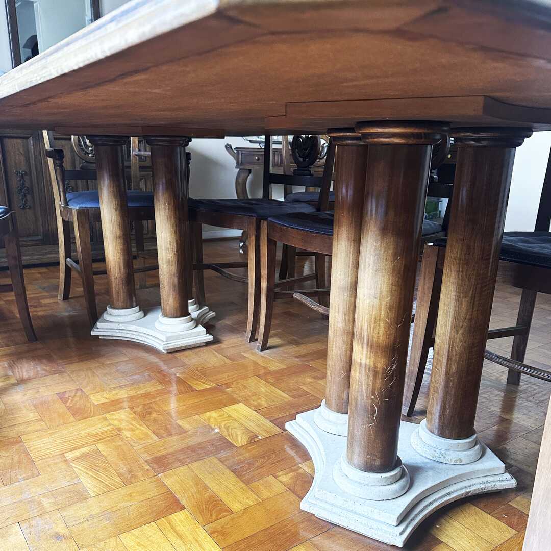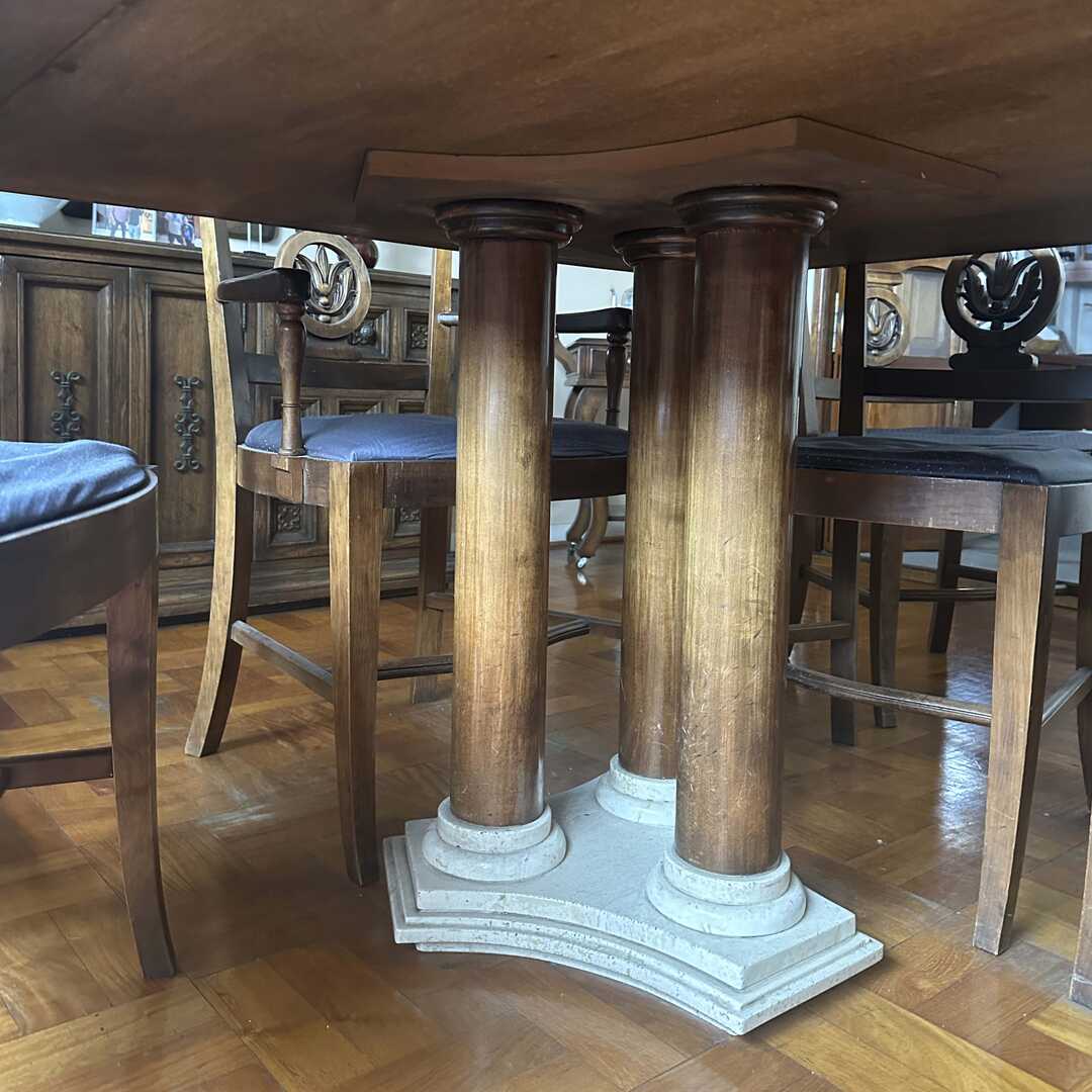 Mesa de comedor de madera con mármol en tapa y patas. Las 2 patas tienen una formación de 3 columnas. La tapa de mármol tiene varias fisuras que no afectan la estructura. Ver fotos de detalle. Largo 205 cm, Ancho 120 cm, Alto 74 cm. Atención: la tapa de la mesa baja por escalera desde un 6to piso.