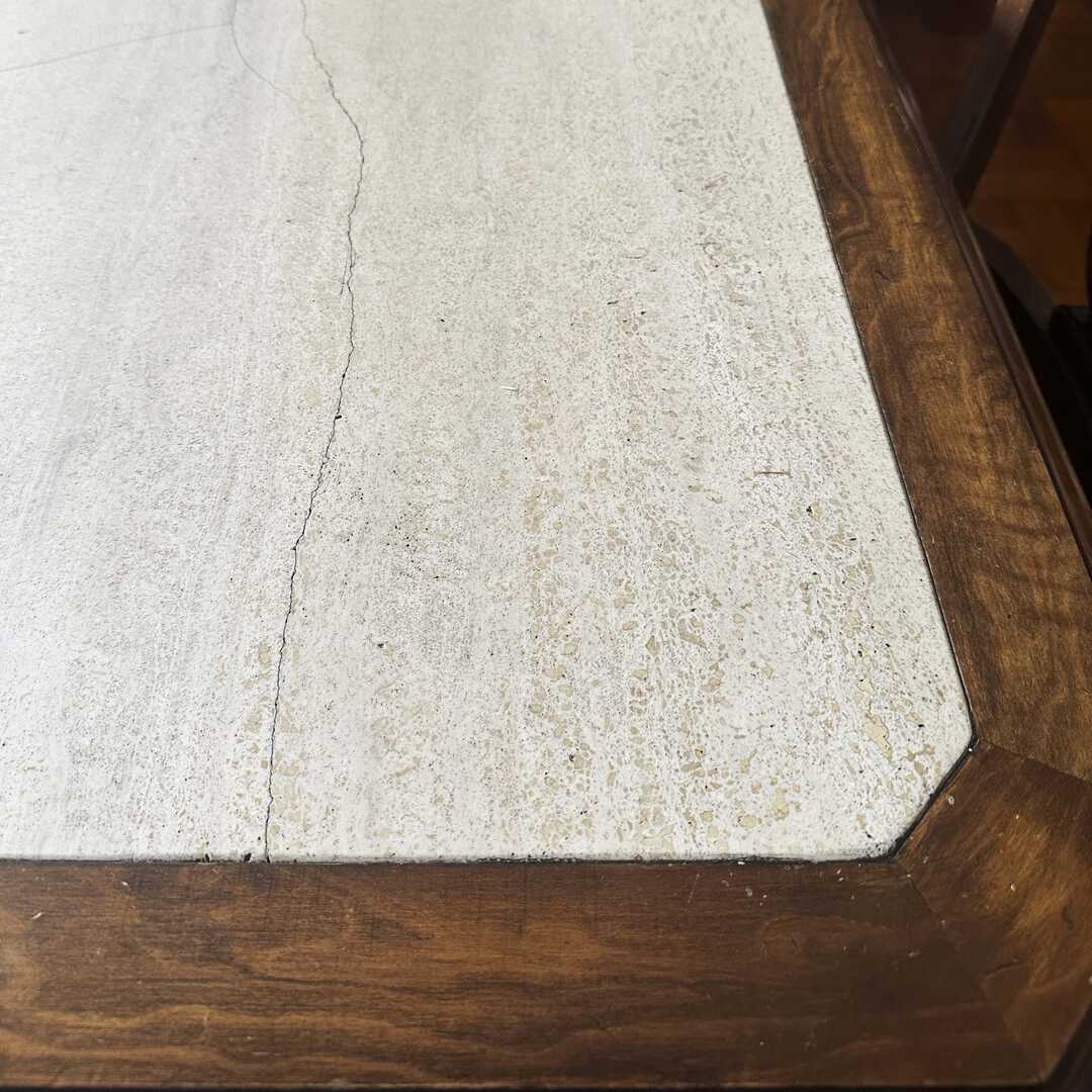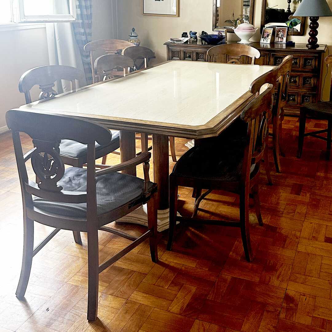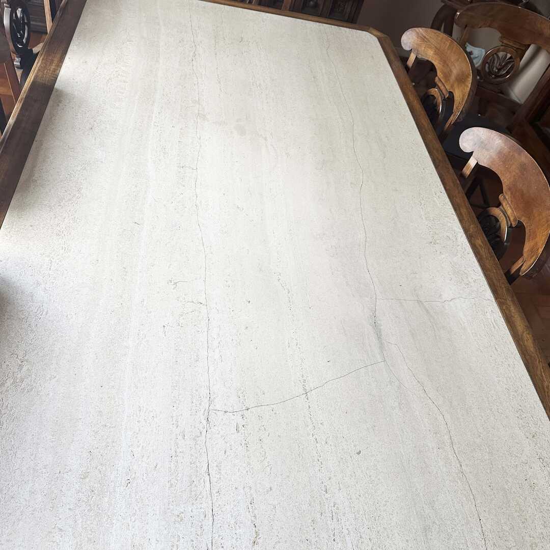 Mesa de comedor de madera con mármol en tapa y patas. Las 2 patas tienen una formación de 3 columnas. La tapa de mármol tiene varias fisuras que no afectan la estructura. Ver fotos de detalle. Largo 205 cm, Ancho 120 cm, Alto 74 cm. Atención: la tapa de la mesa baja por escalera desde un 6to piso.
