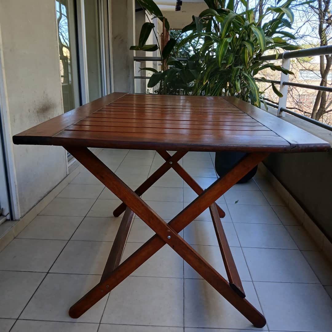 Mesa de exterior en teka con base plegable. 140 x 75 x 73 cm alt.