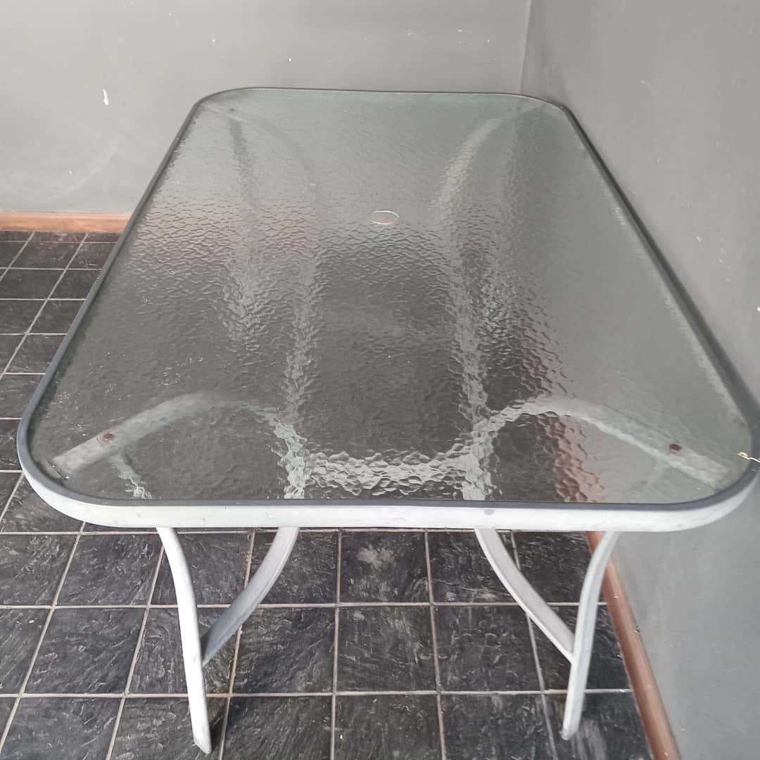 Mesa de jardín con tapa rectangular vítrea y base en mármol. 95 x 150 cm. Alt 72 cm.