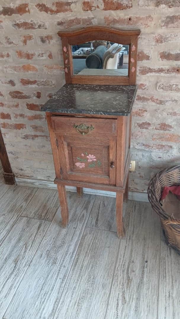 Mesa de luz con alzada espejo, 1 cajón, 1 puerta y tapa en mármol negro. 40 x 37 cm. Alt 110 cm.