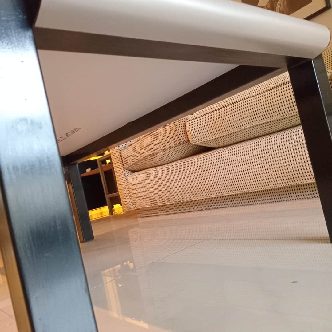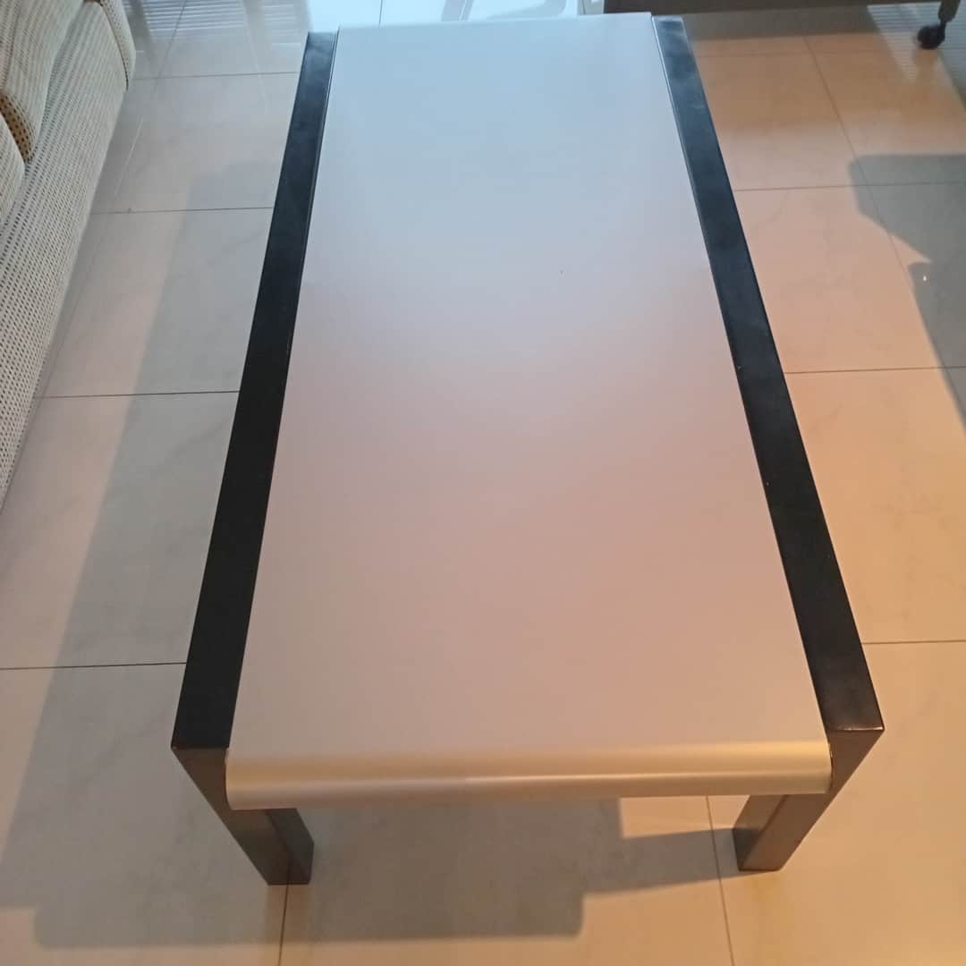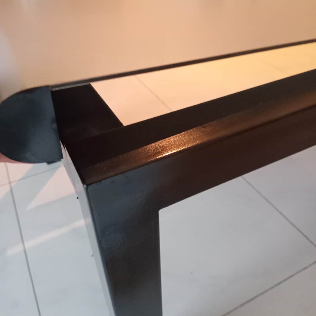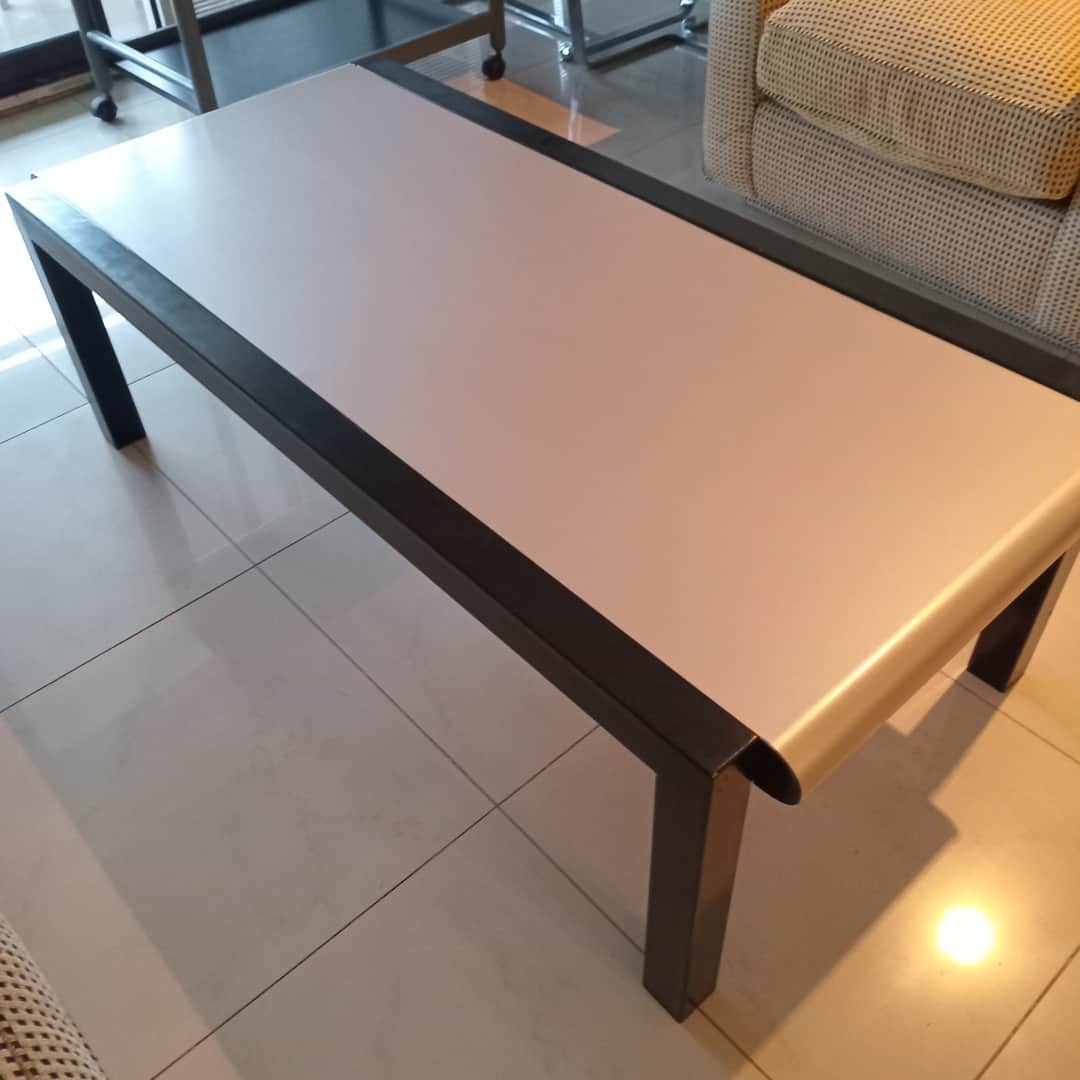Mesa frente sofá en chapa, color negra y gris. 128 x 60 cm. Alt 40 cm.