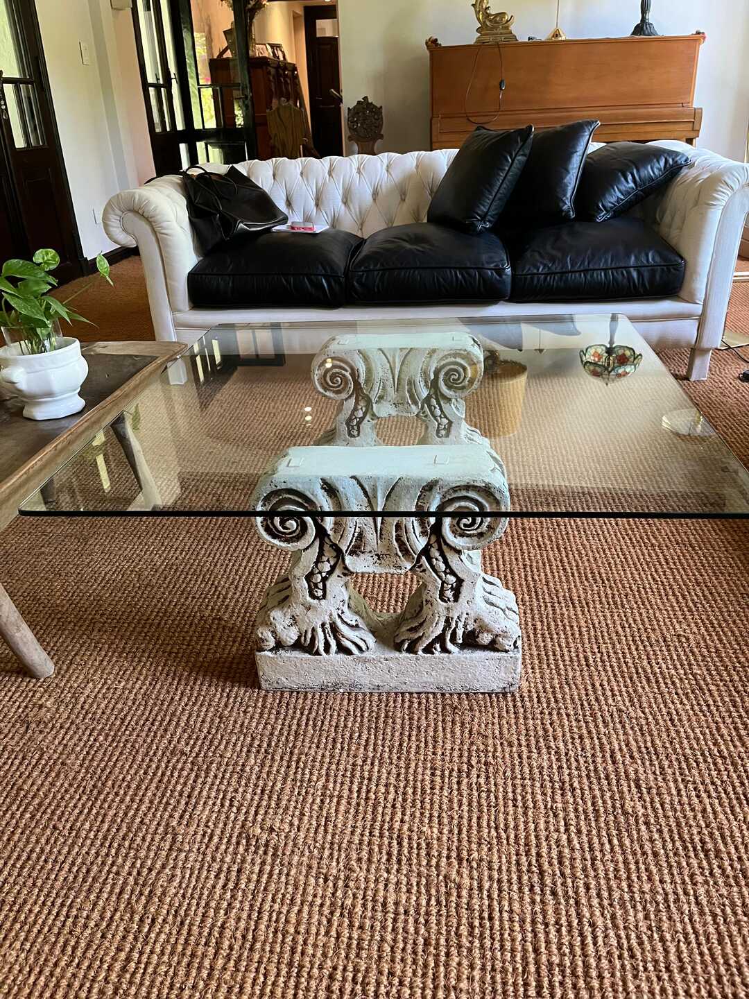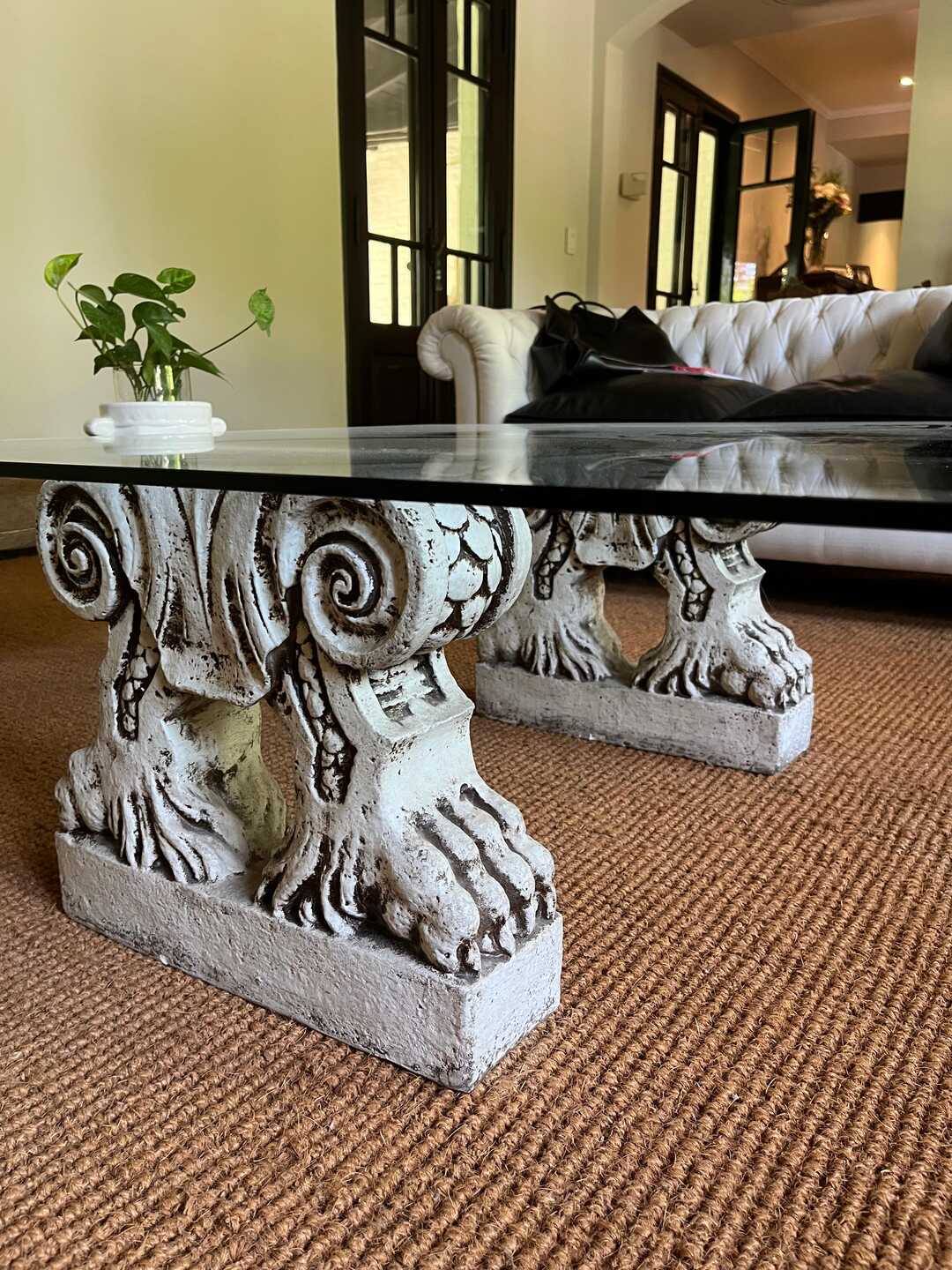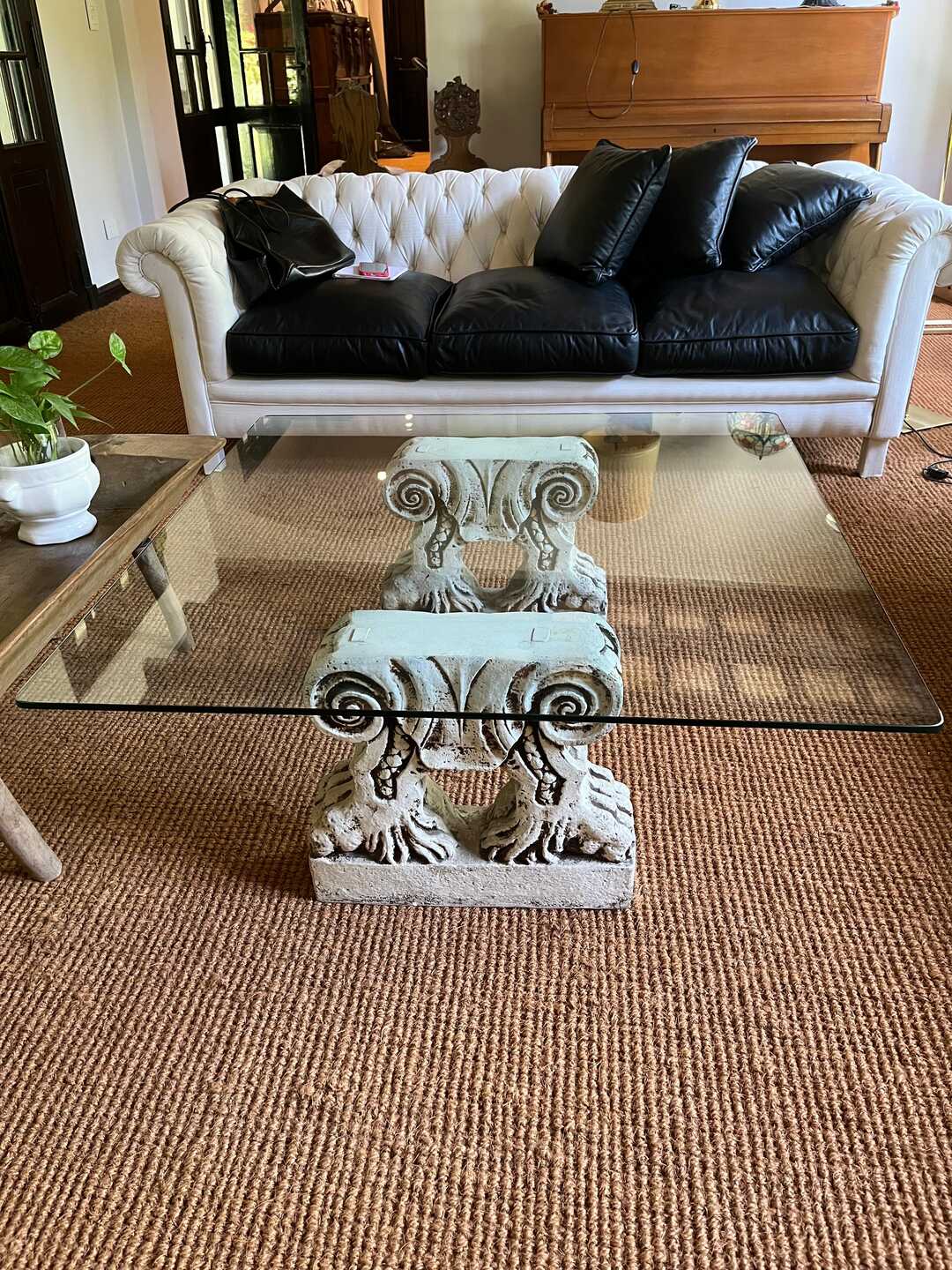 Mesa frente sofá con tapa vítrea y base con columnas talladas en cemento. 100 x 100 cm. Alt 40 cm. Retiro a coordinar por San Isidro.