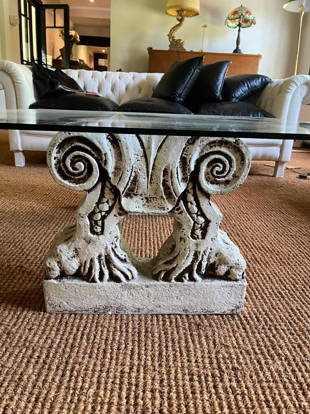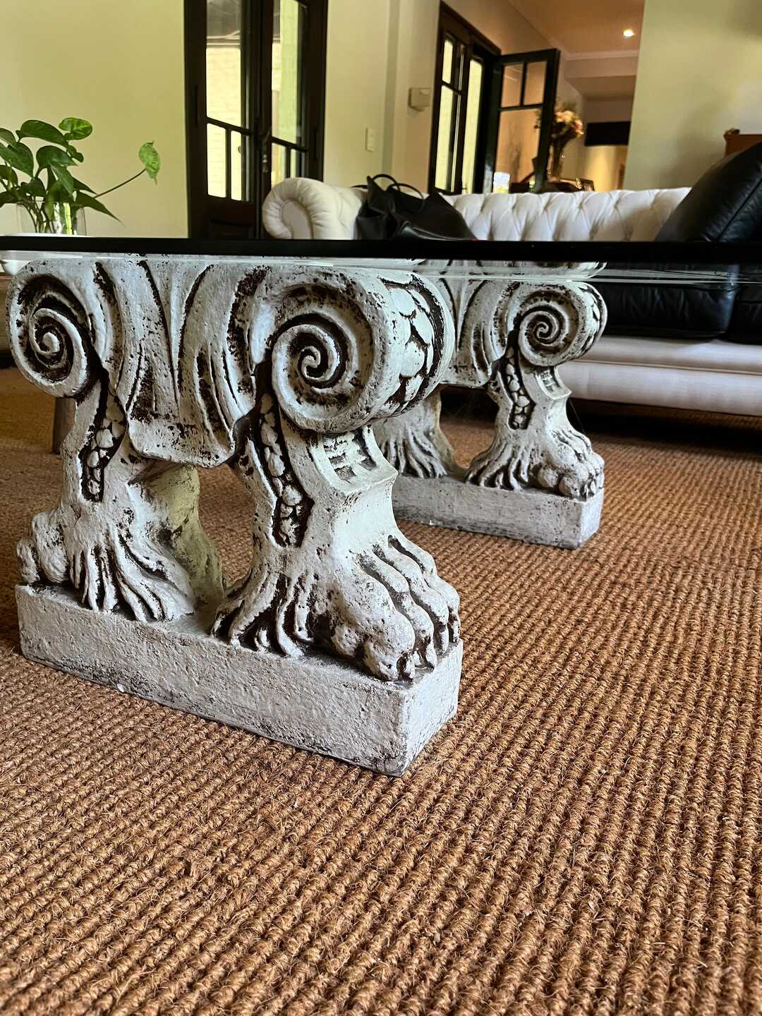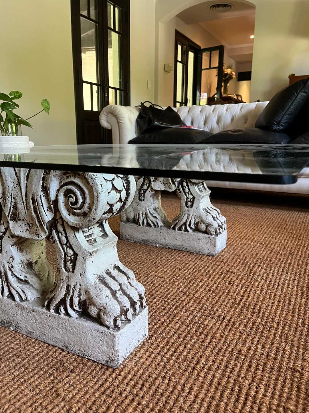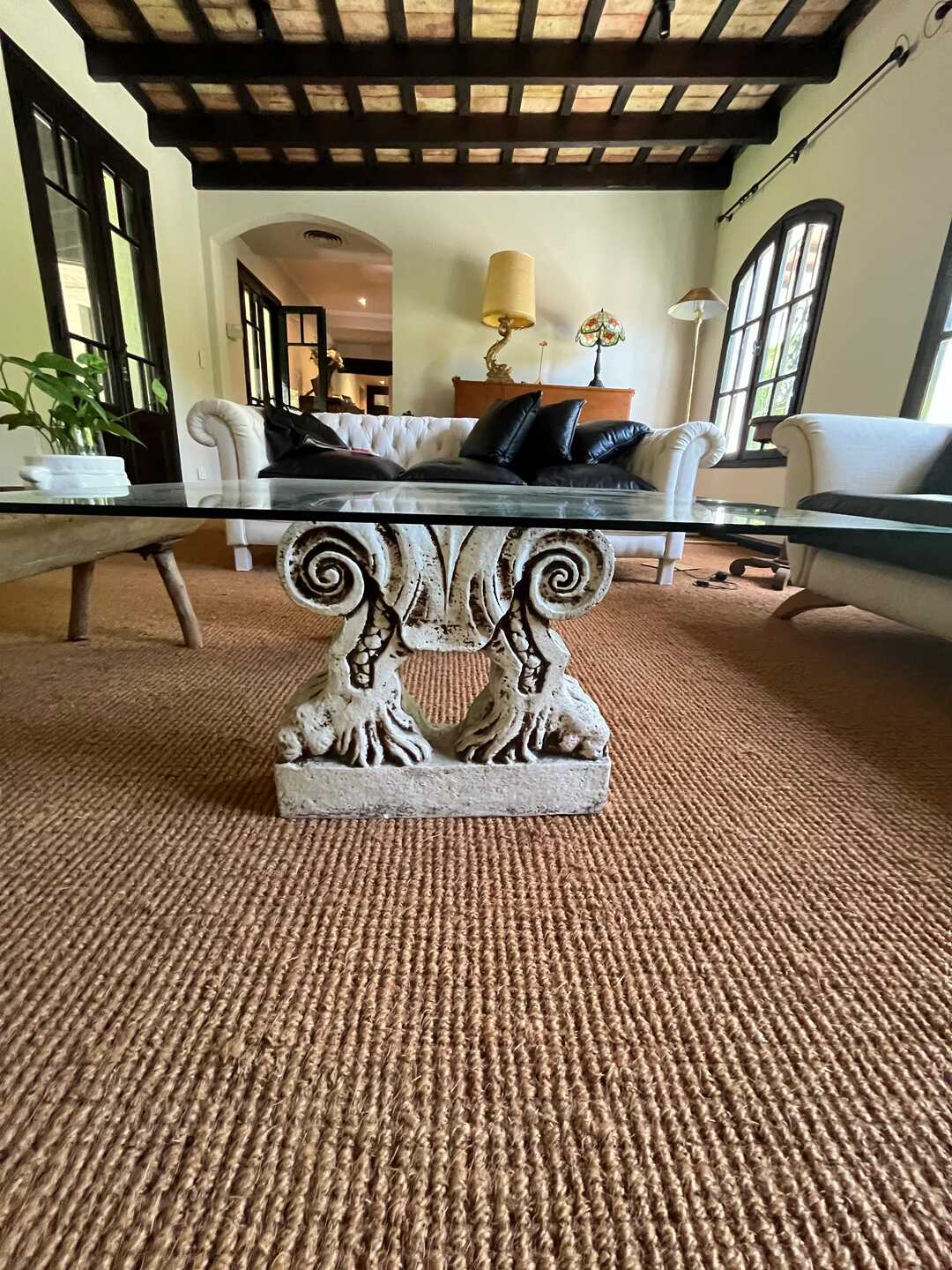 Mesa frente sofá con tapa vítrea y base con columnas talladas en cemento. 100 x 100 cm. Alt 40 cm. Retiro a coordinar por San Isidro.