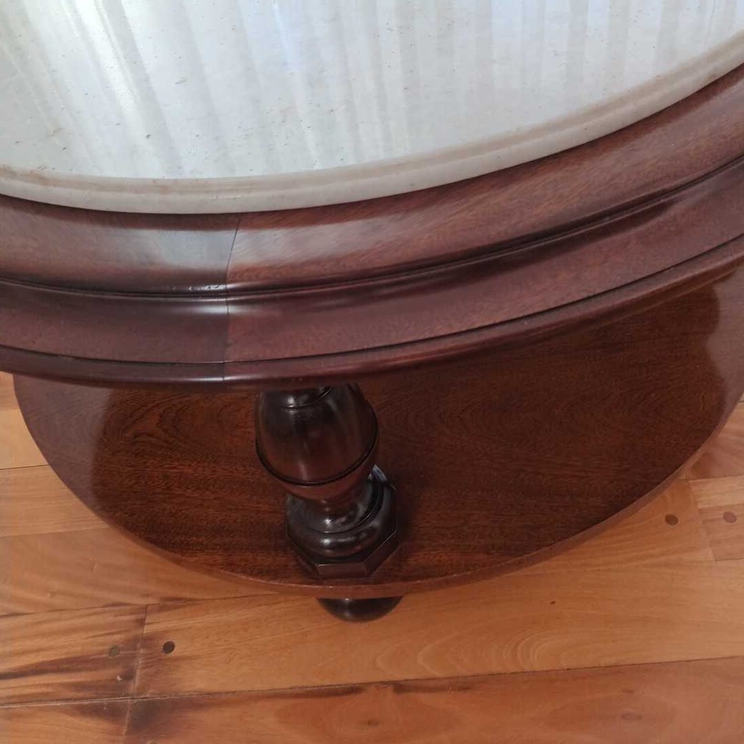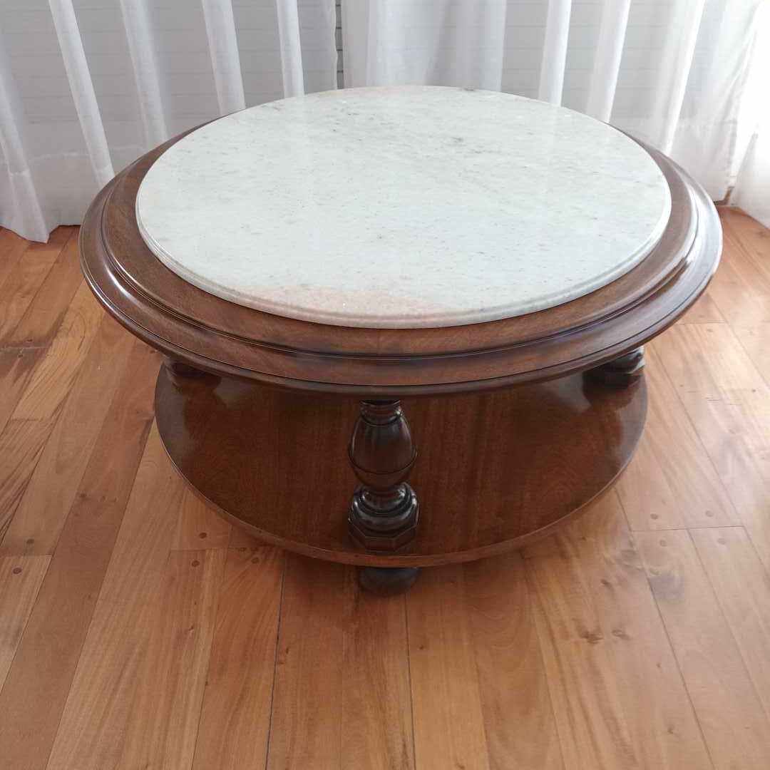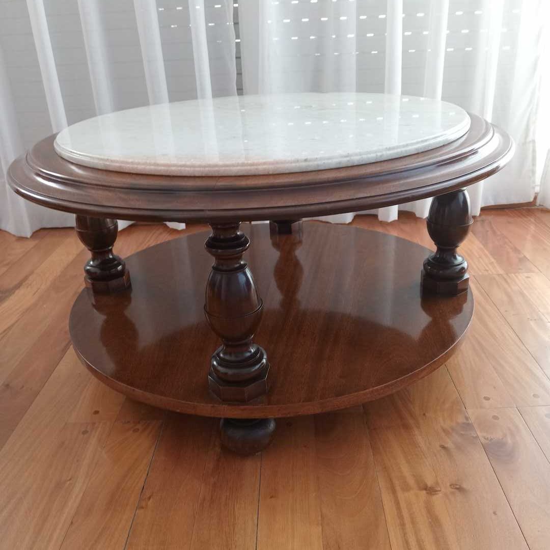 Mesa frente sofá tapa redonda mármol 2 planos. Diám 90 cm. Alt 93 cm. Diám mármol 74 cm.