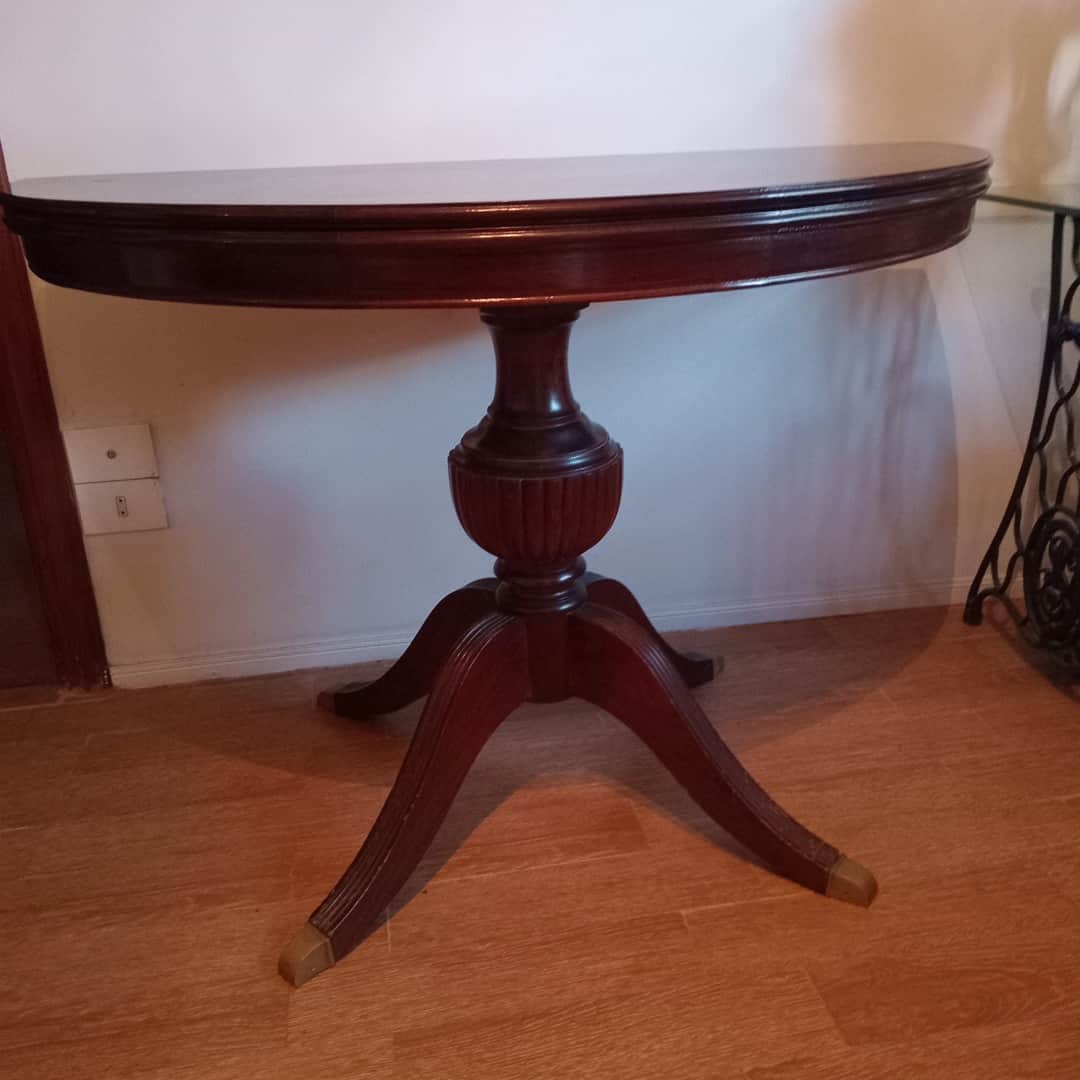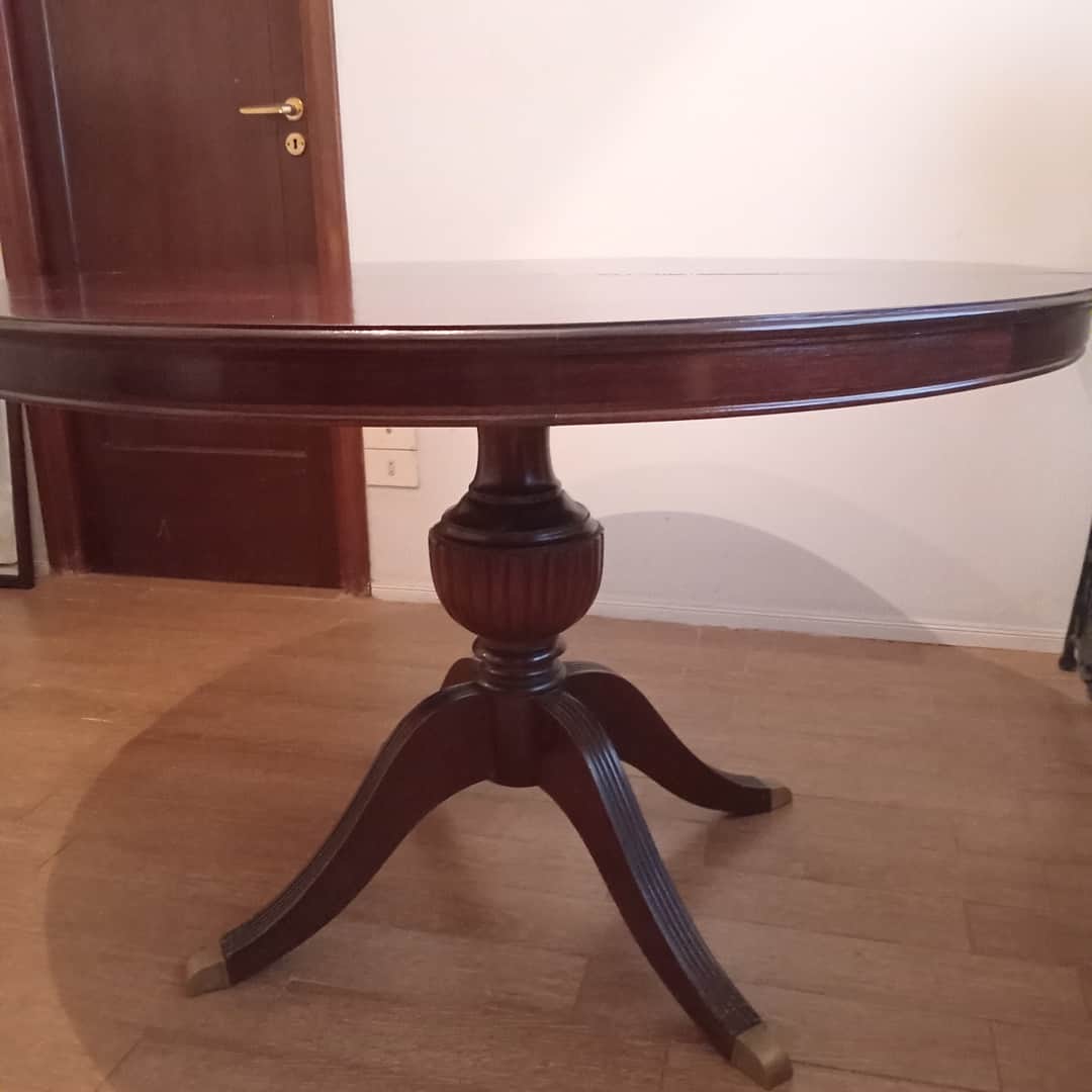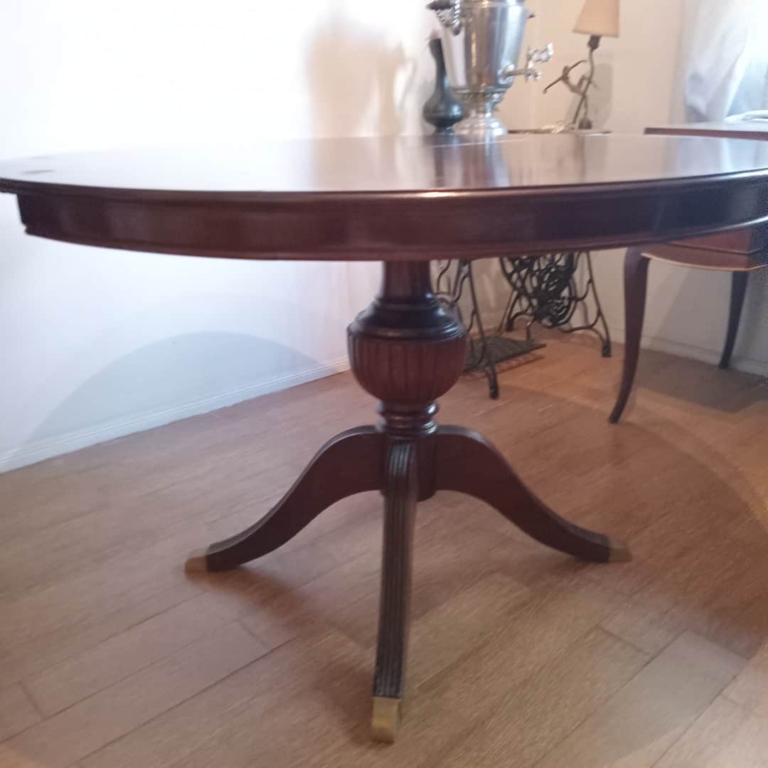 Mesa libro tapa redonda en madera con pata central. Diám 120 cm. Alt 79 cm.