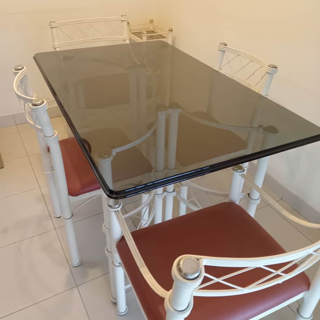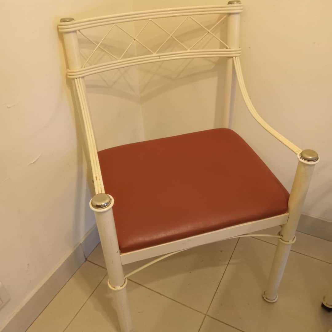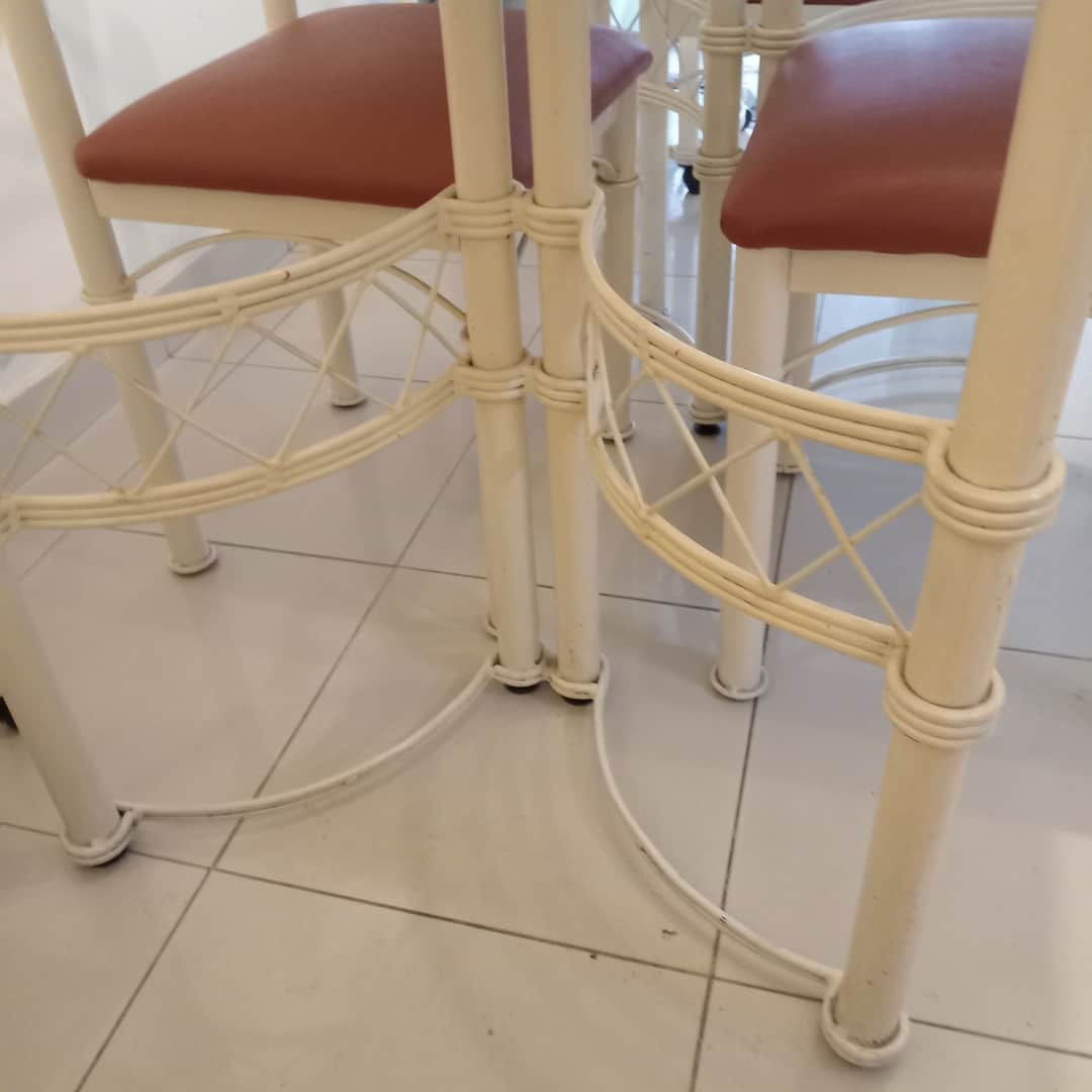 Mesa base metal y tapa vítrea fumé + 2 sillas + 2 sillones cabecera en hirro y asiento tapizado en cuerina rosa.