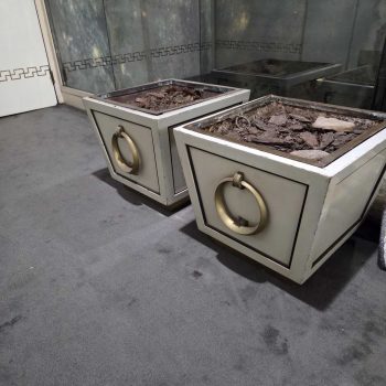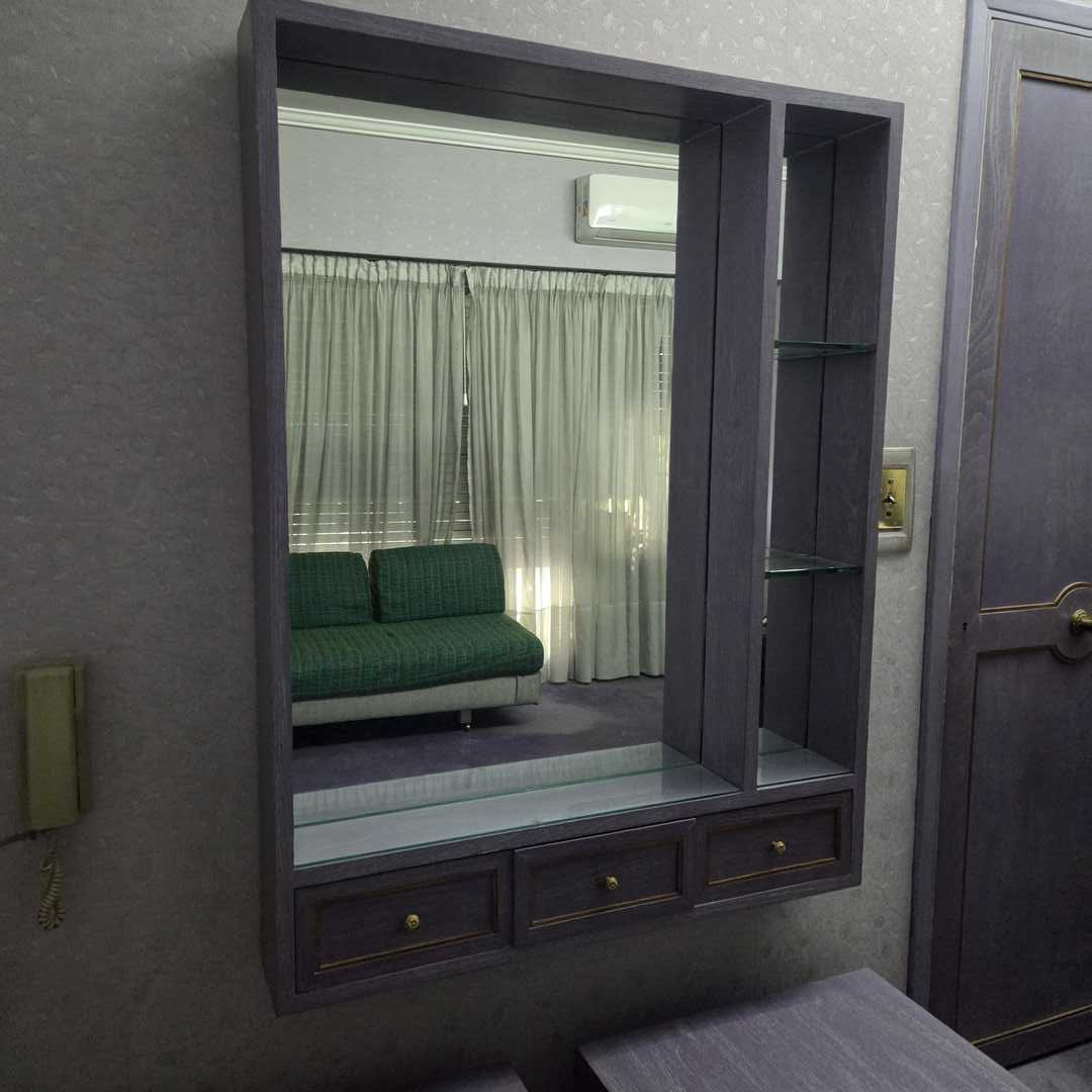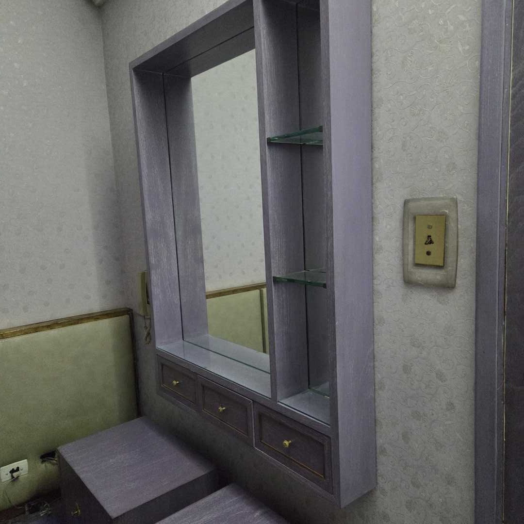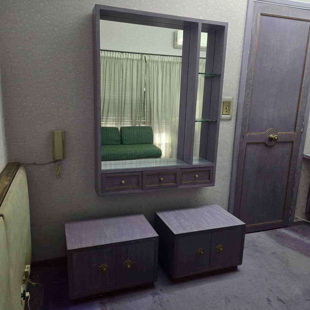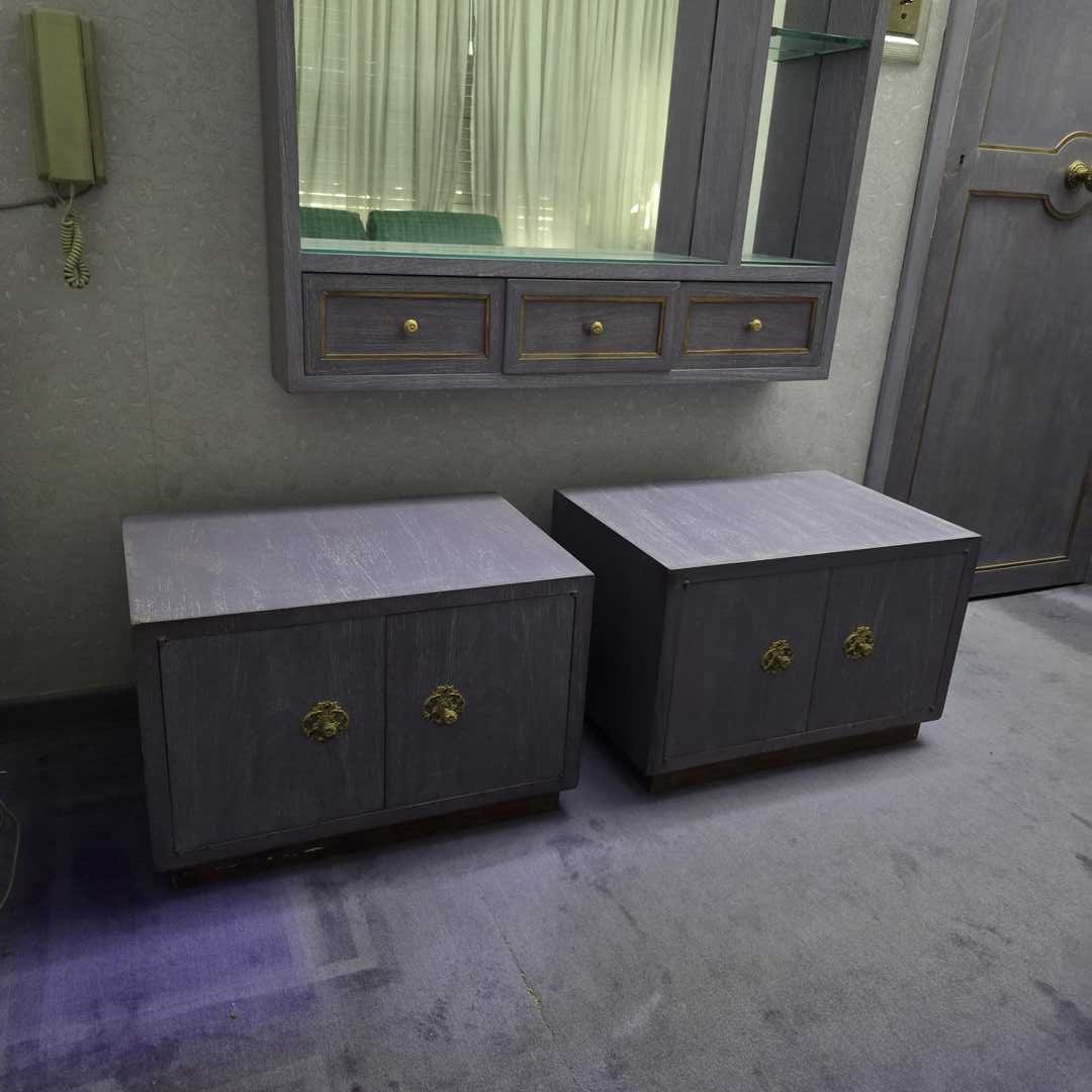 Par de mesas de luz violeta con herrajes en bronce 60 x 40 x 40 cm + Tocador con 3 cajones 100 x 14 x 130 cm.