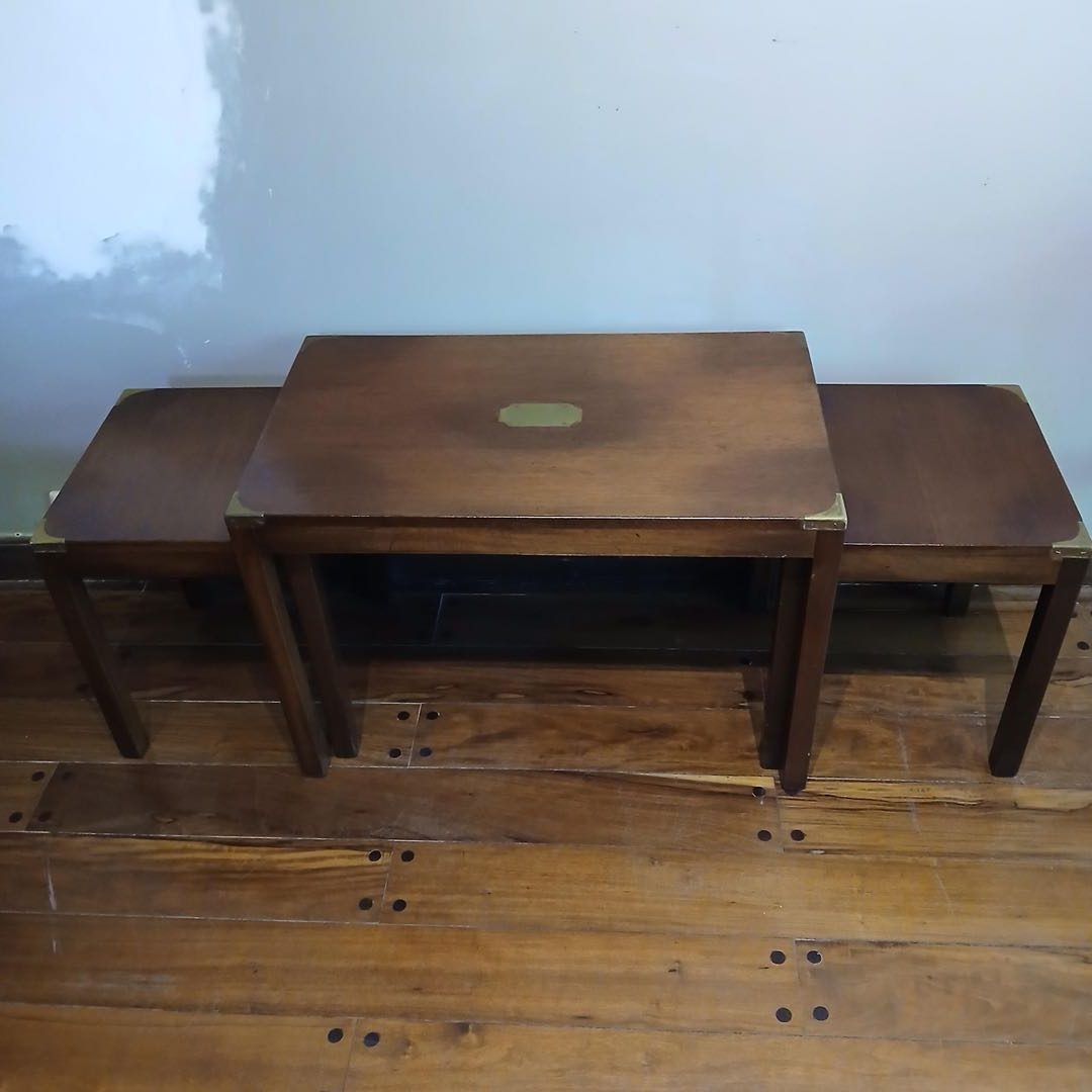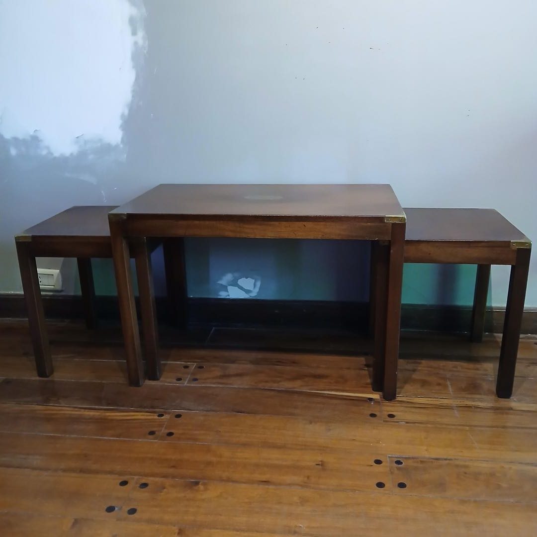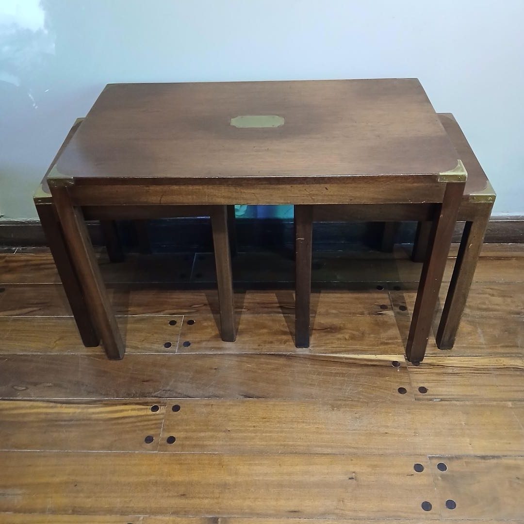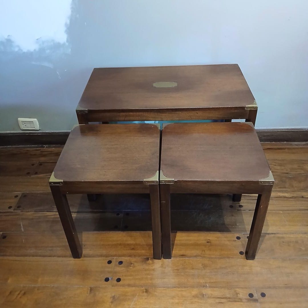 Mesas nido x 3. Con punteras de bronce y chapa central. 76 x 45 x 50 cm alt / 38 x 36 x 44 cm alt.