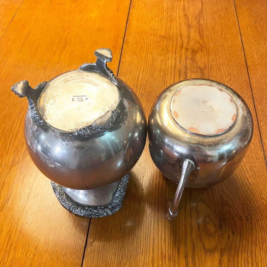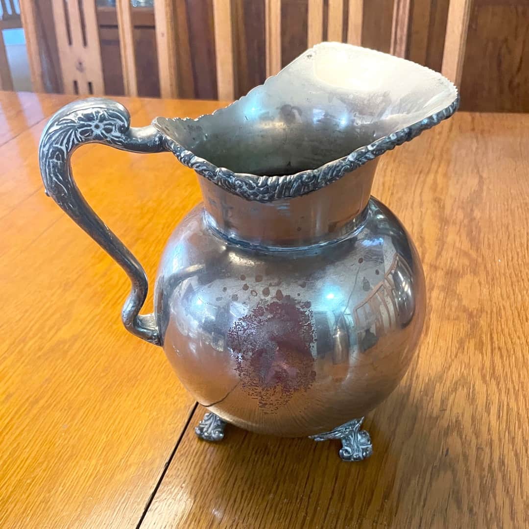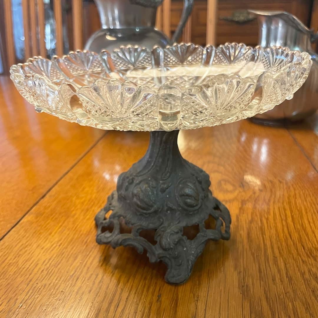 Lote 4 piezas con metal plateado con desgastes de uso. 2 Jarras Rep Sheffield 21 cm y 17 cm, Frutera de vidrio y base cincelada en peltre. Restaurada. Altura 13 cm x 18 Ø, Botellita Casa Escasany 18 cm