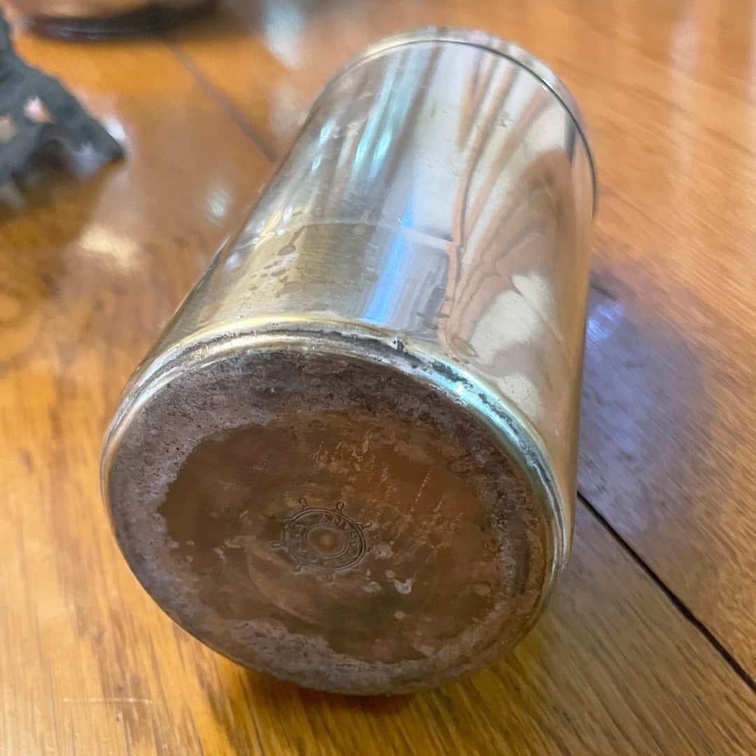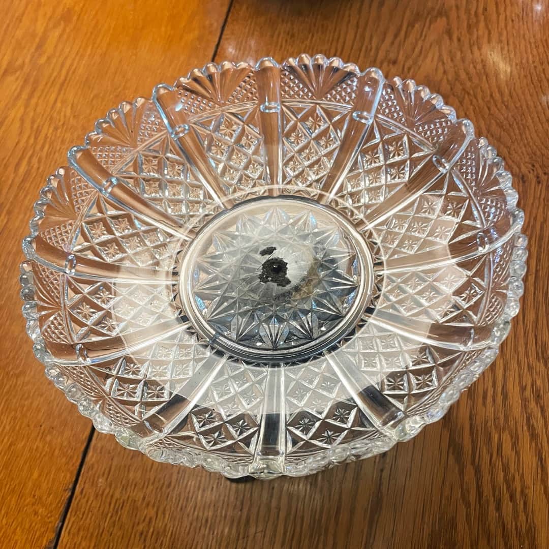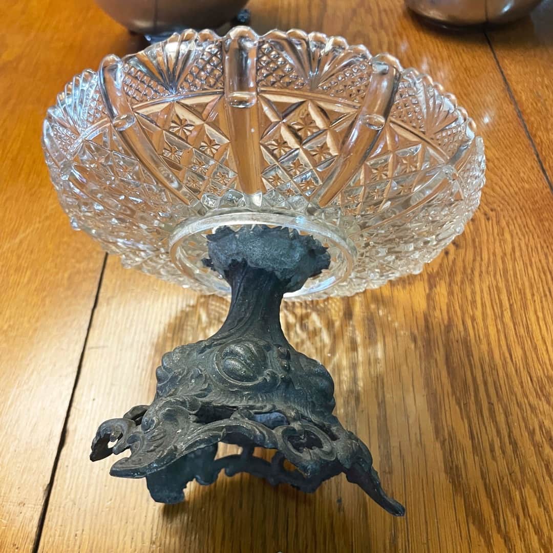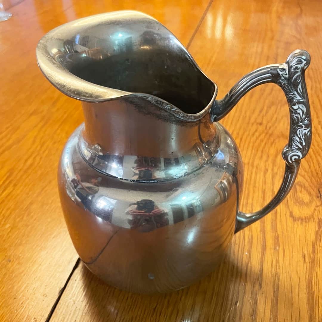 Lote 4 piezas con metal plateado con desgastes de uso. 2 Jarras Rep Sheffield 21 cm y 17 cm, Frutera de vidrio y base cincelada en peltre. Restaurada. Altura 13 cm x 18 Ø, Botellita Casa Escasany 18 cm