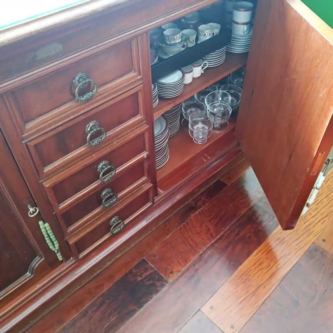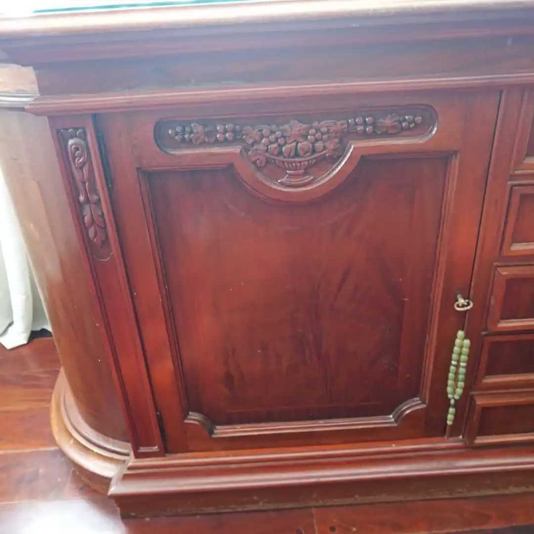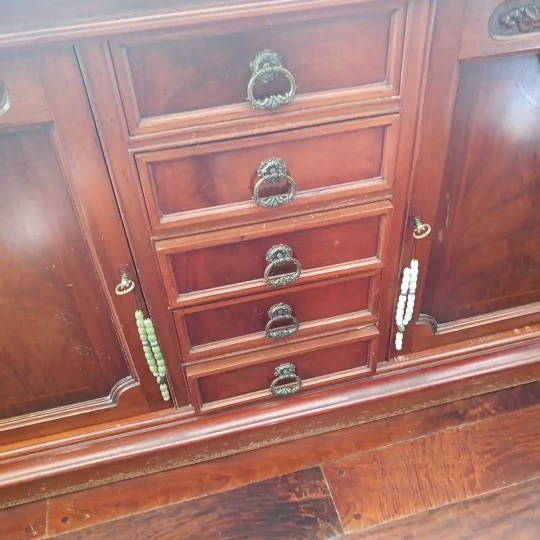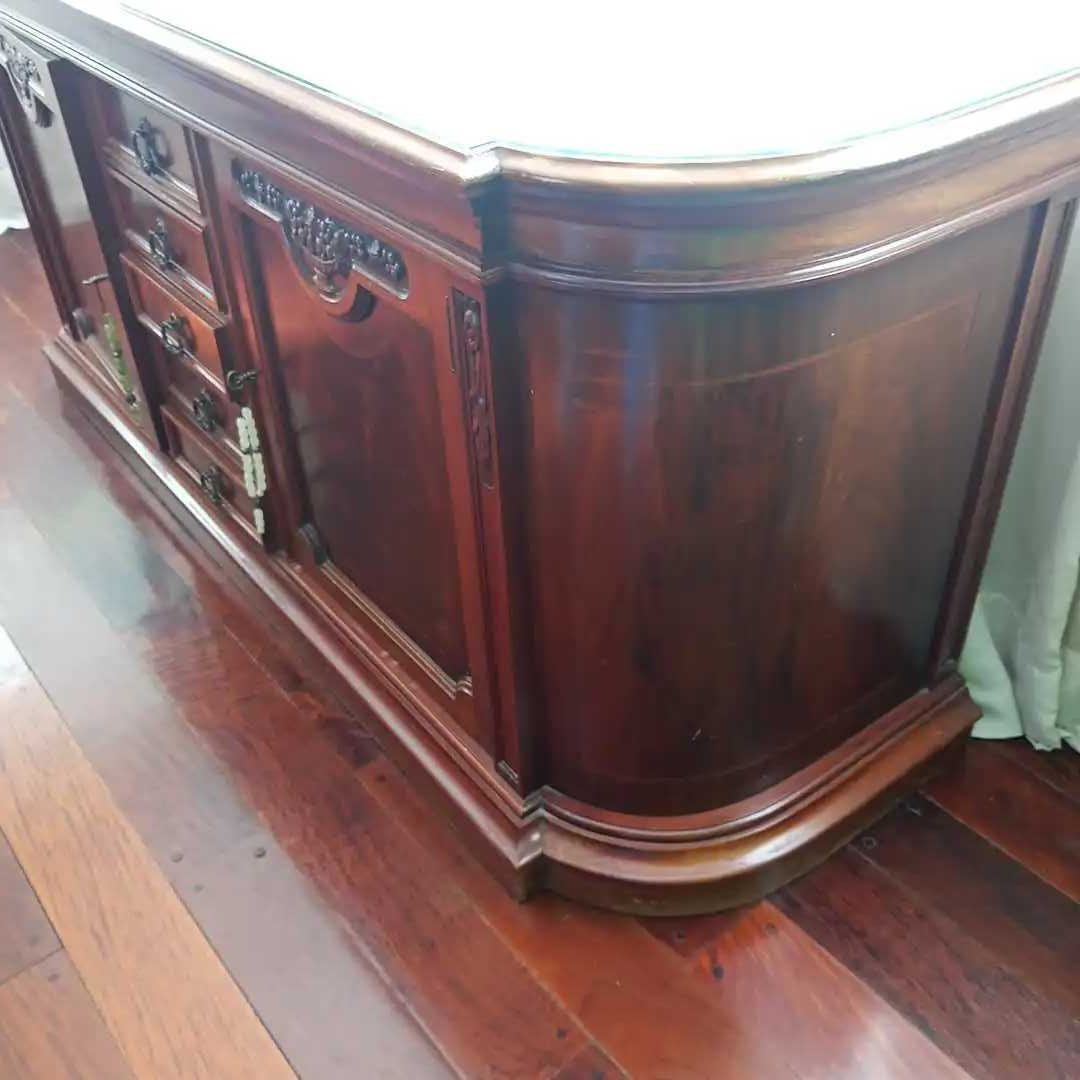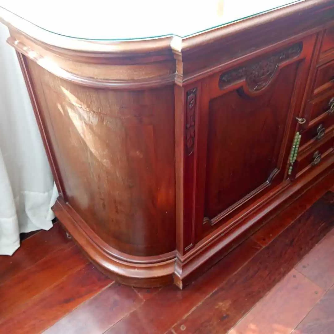 Mueble bajo 5 cajones y 2 puertas. Parte superior protegida con un vidrio. No se incluye el contenido. 207 x 62 cm. Alt 92 cm.
