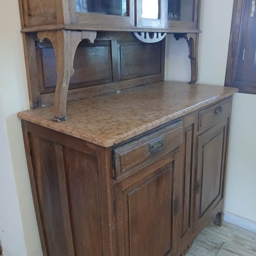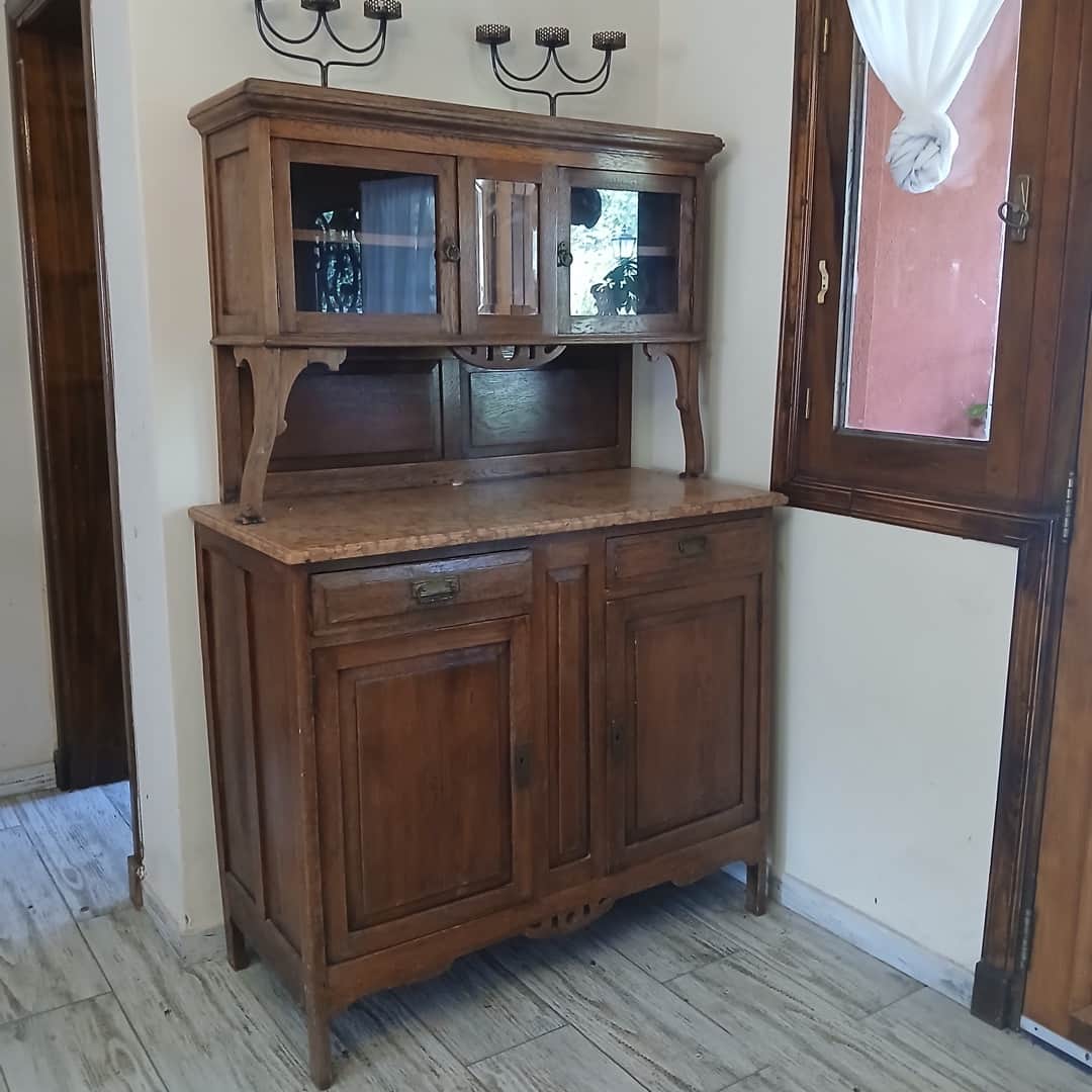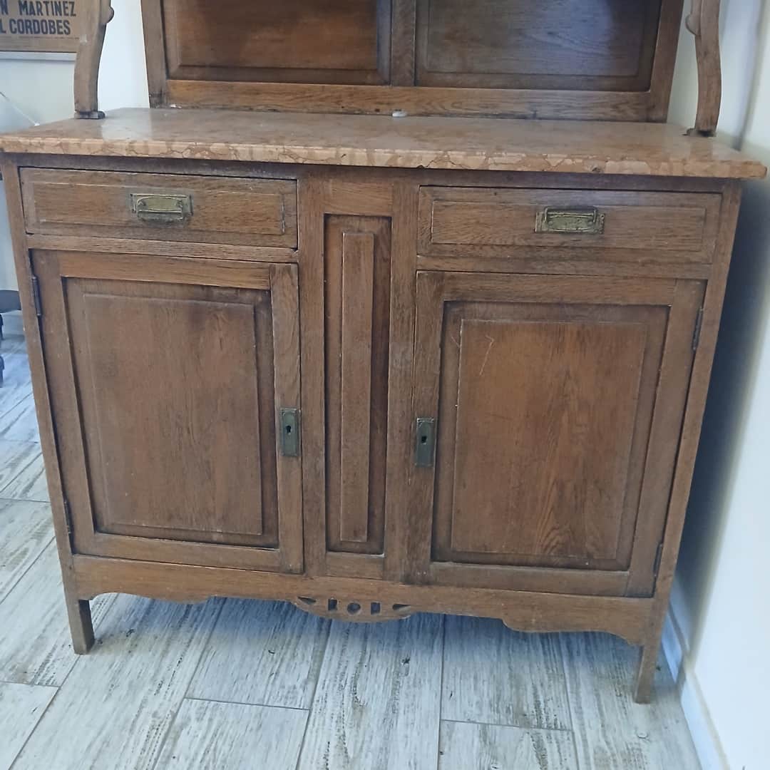 Mueble de campo con alzada en roble rústico y tapa de mármol rosa. 110 x 50 cm. Alt 168 cm.