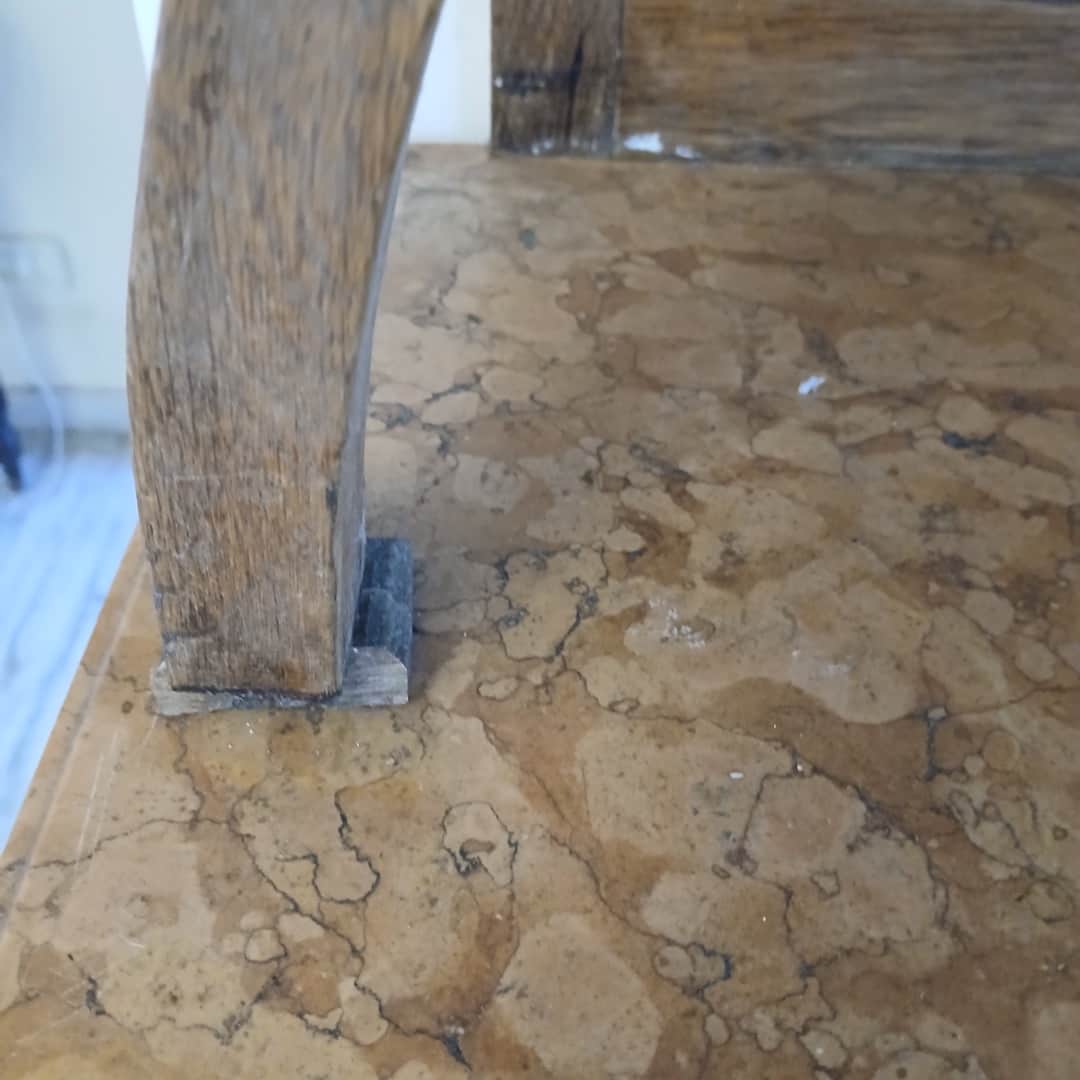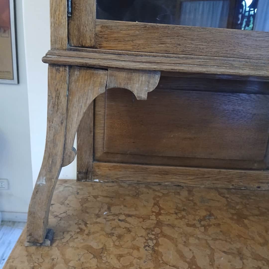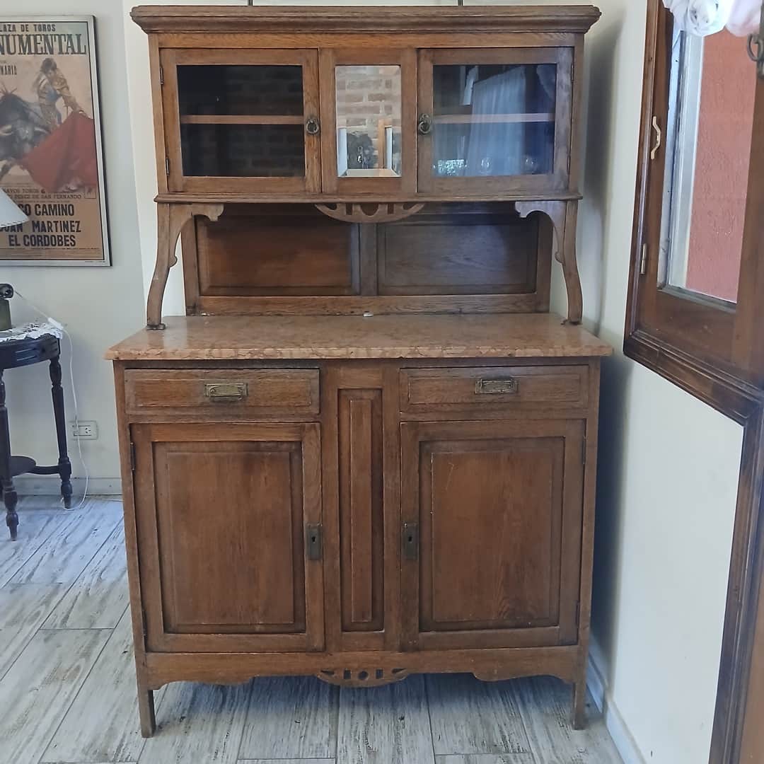 Mueble de campo con alzada en roble rústico y tapa de mármol rosa. 110 x 50 cm. Alt 168 cm.
