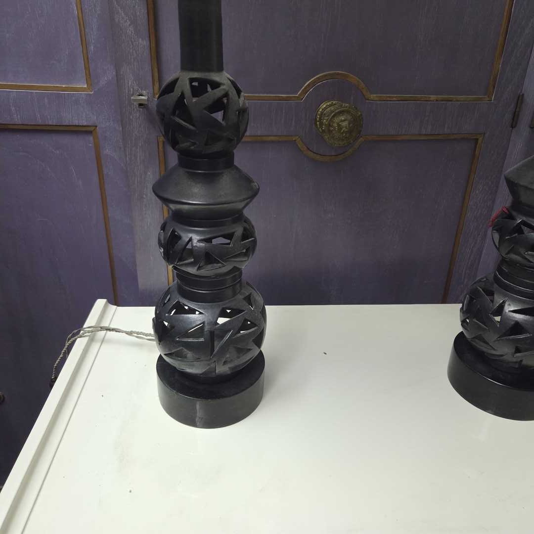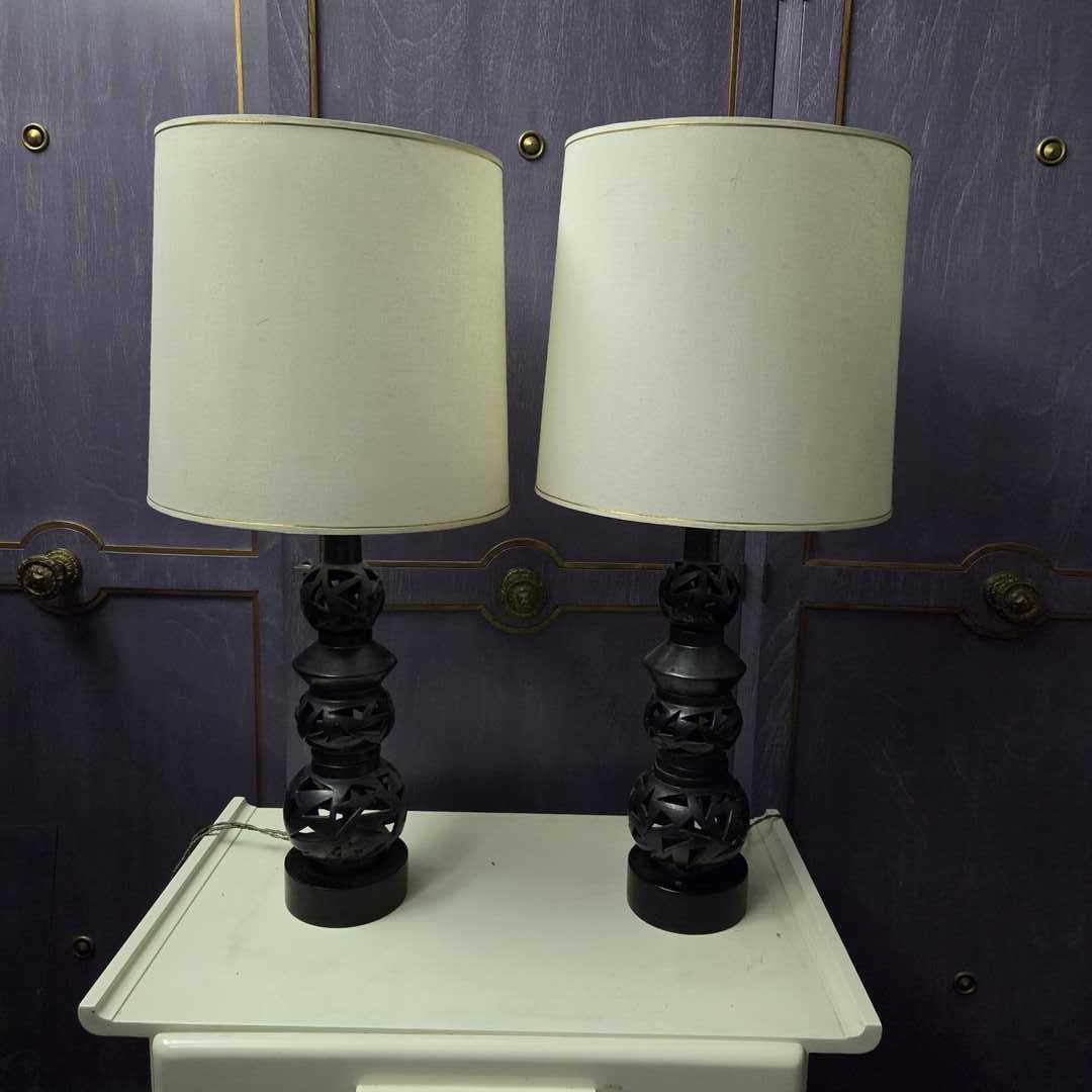 Par de lámparas caladas en hierro. Diám 13 cm. Alt total 80 cm.