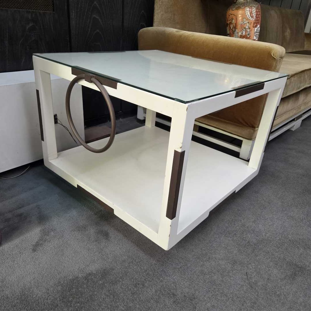 Par de mesas auxiliares laqueadas en blanco con detalles en bronce y vítrea ¡. 66 x 65 x 50 cm.