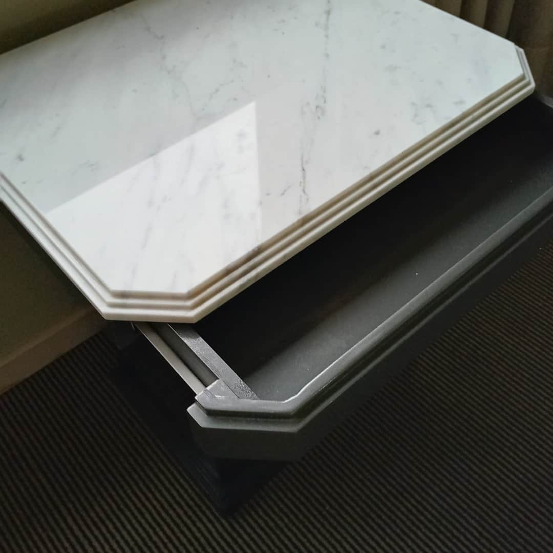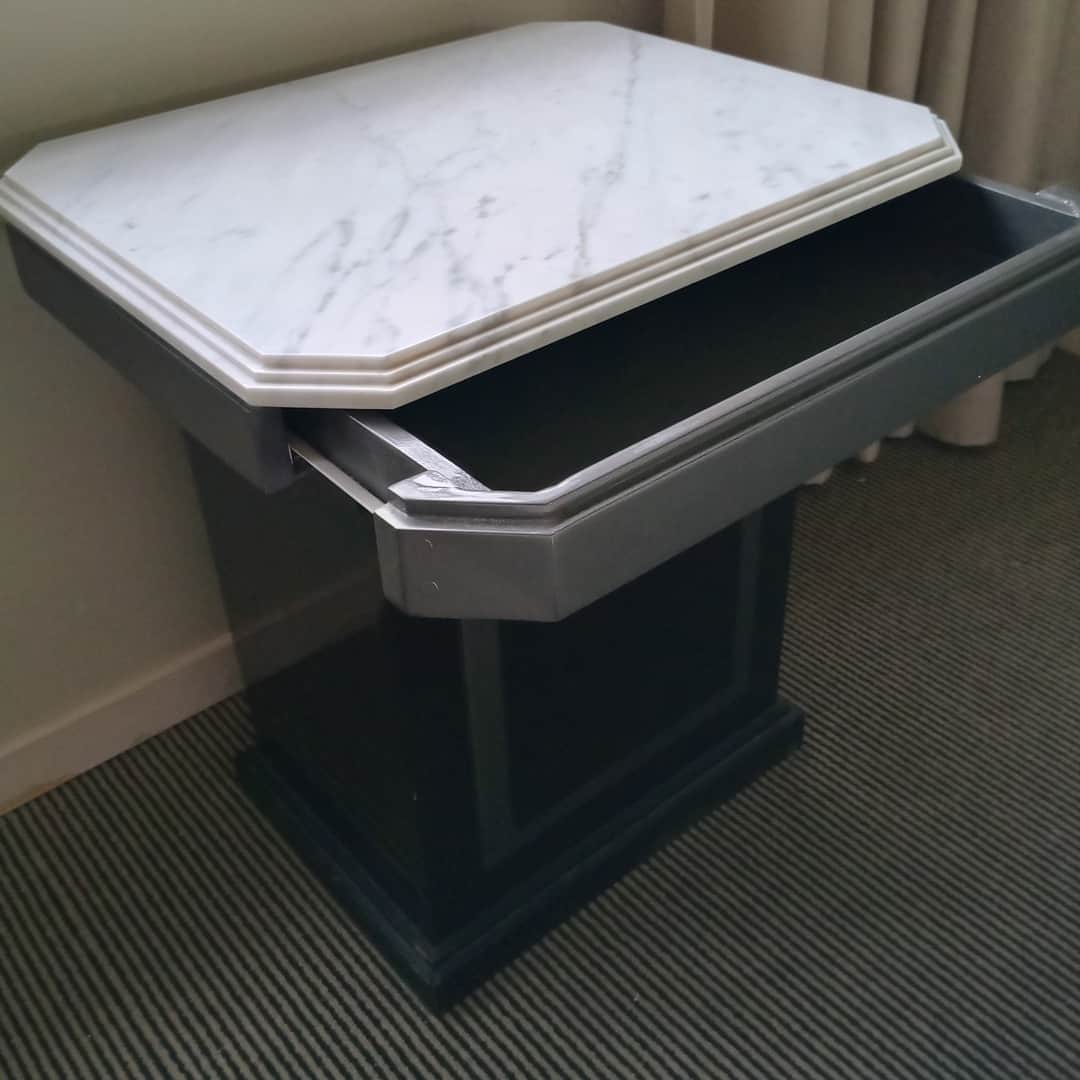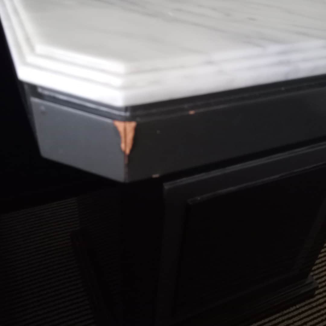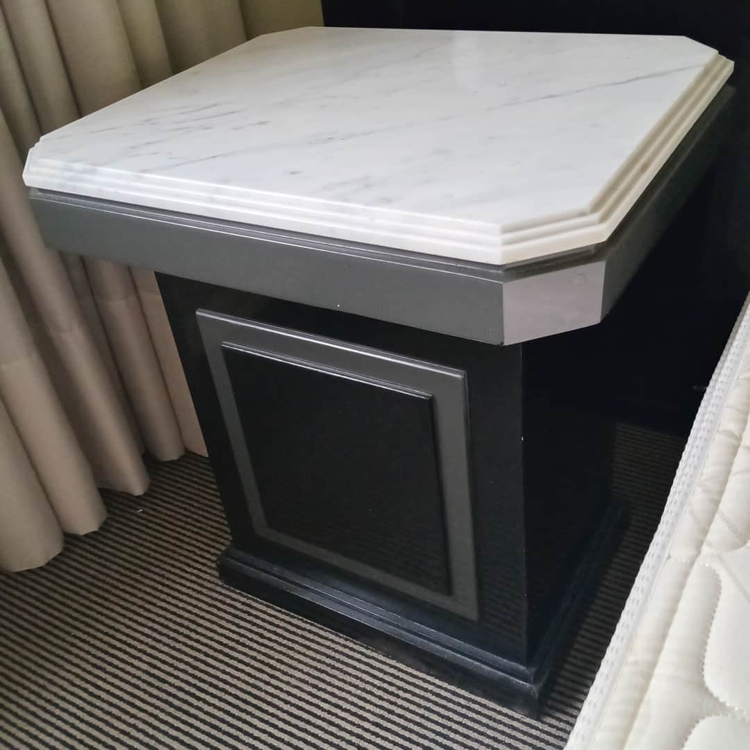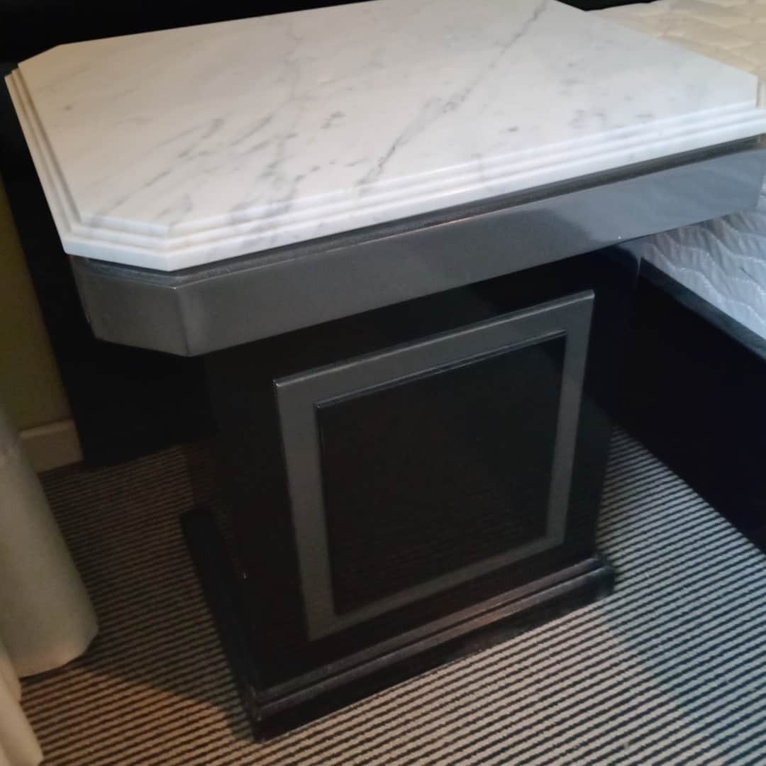 Par de mesas de luz con base en fórmica y tapa de mármol, 1 cajón. Con desgaste de uso (ver fotos). 45 x 45 cm. Alt 55 cm.