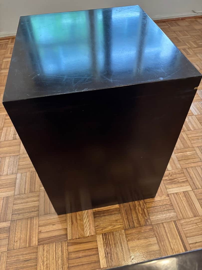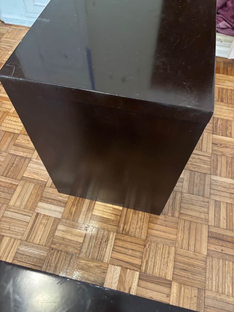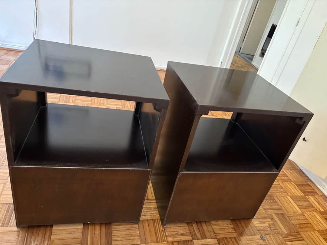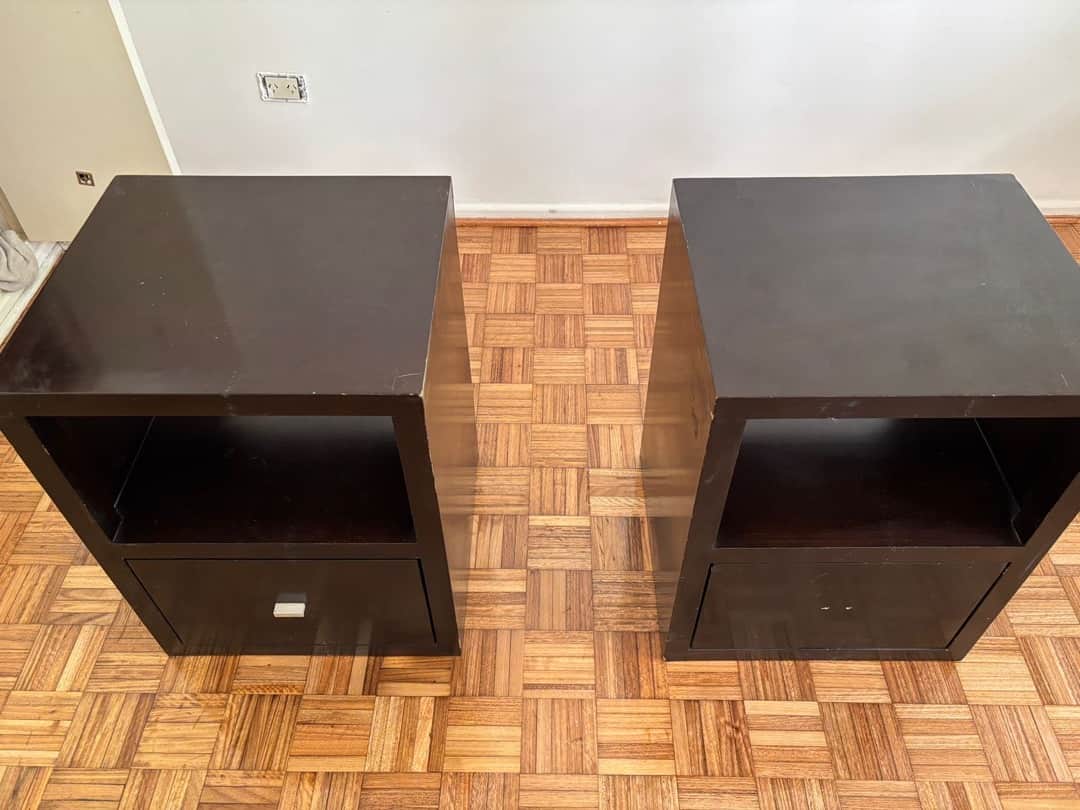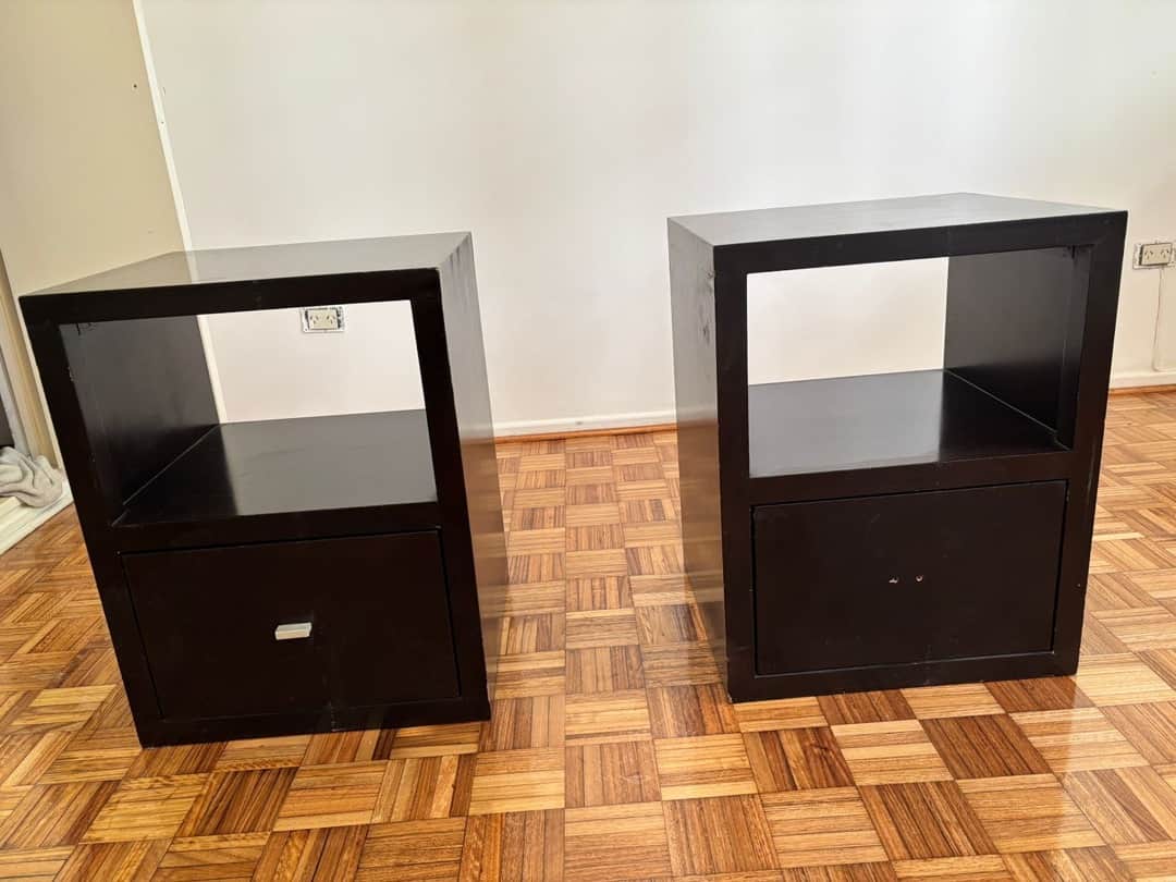 Par de mesas de luz en madera. Con pequeñas marquitas de pintura (para limpiar). Un cajón sin herraje. 45 x 45 cm. Alt 66 cm. Retiro el miércoles 29/10 de 10 a 12 hs por Recoleta.