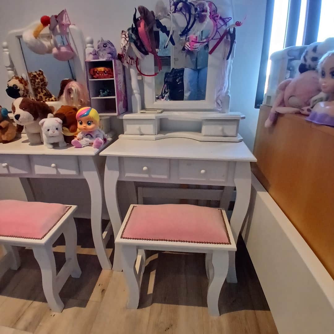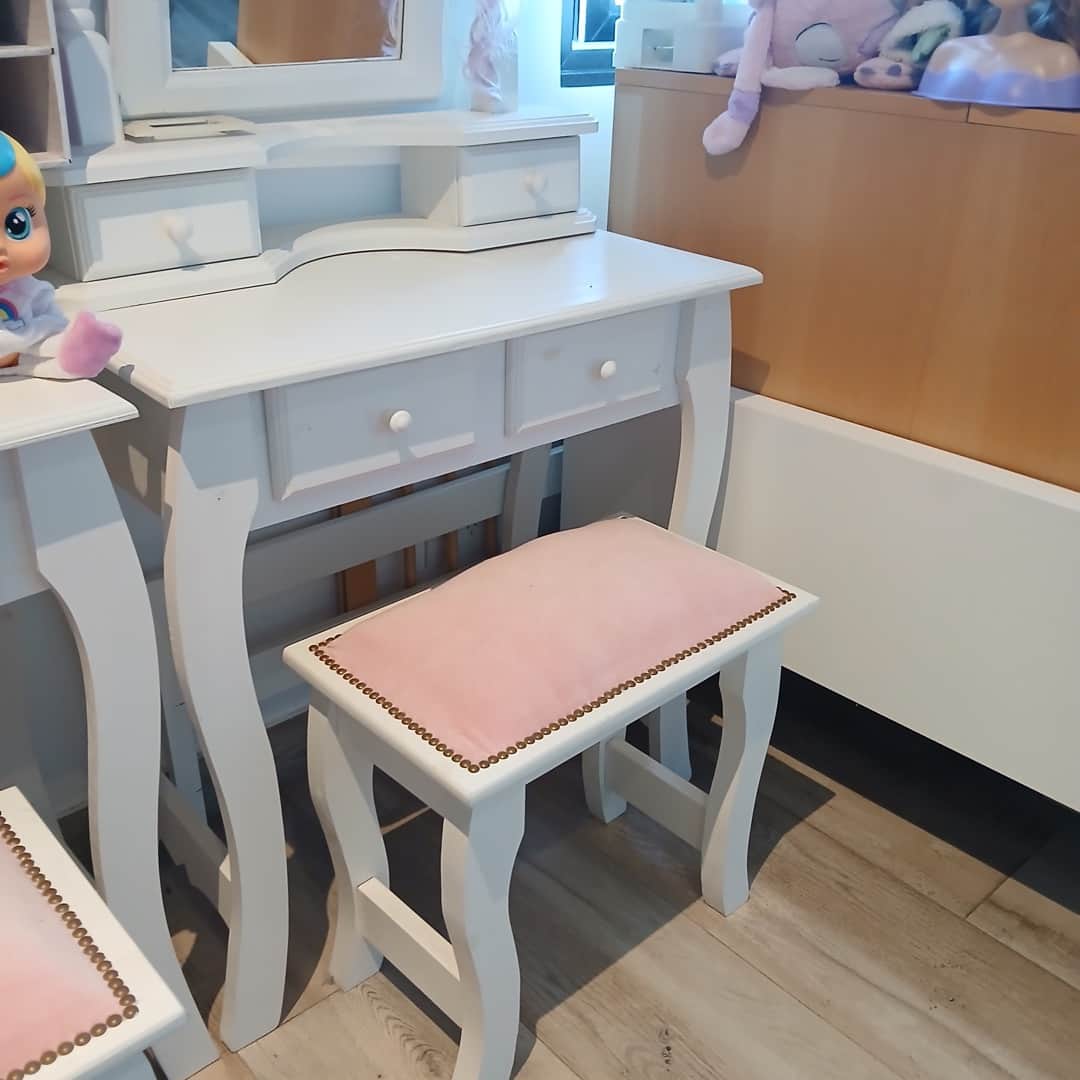 Par de muebles tocadores con 2 cajones y espejo rebatible 70 x 40 cm. Alt 75 cm. Alt alzada con espejo 63 cm.+ Par de pequeñas banquetas rosas.