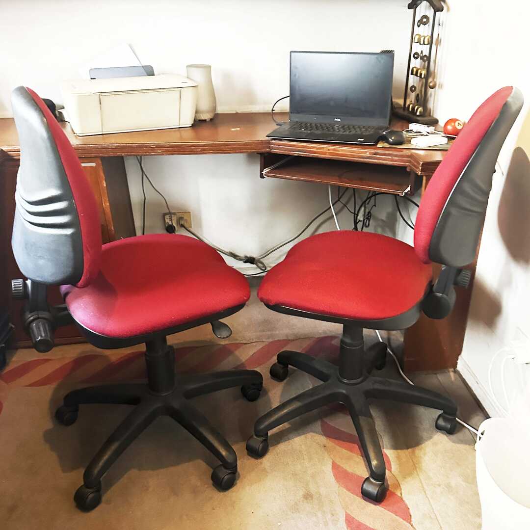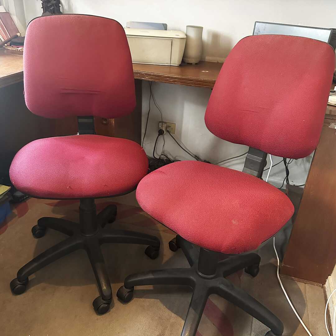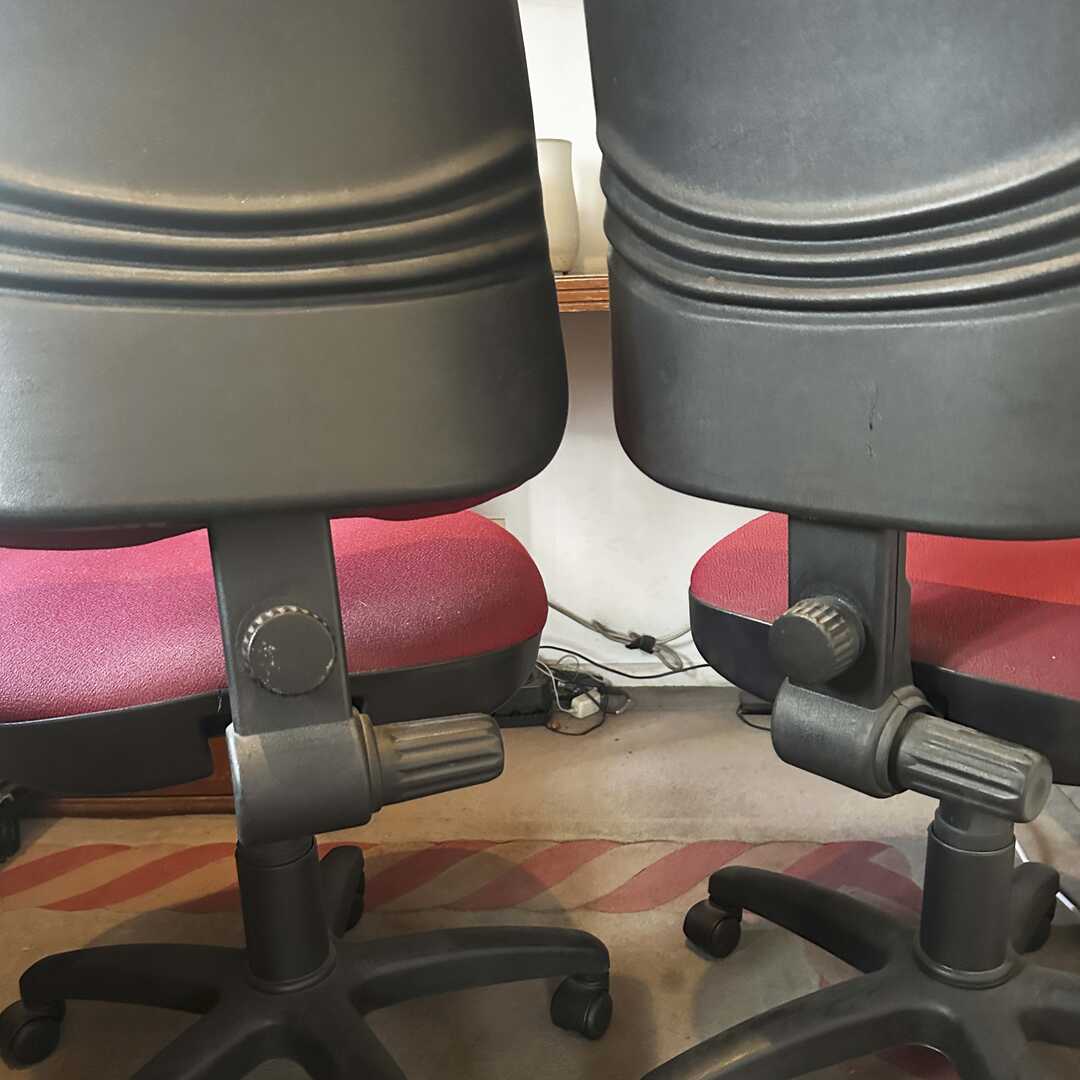 Par de sillas de escritorio ergonómicas color rojo, sin apoya brazos, con ruedas.