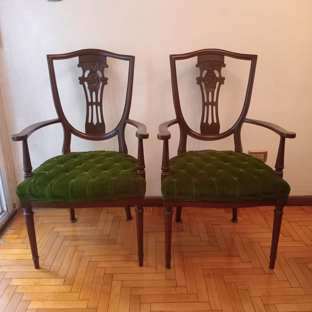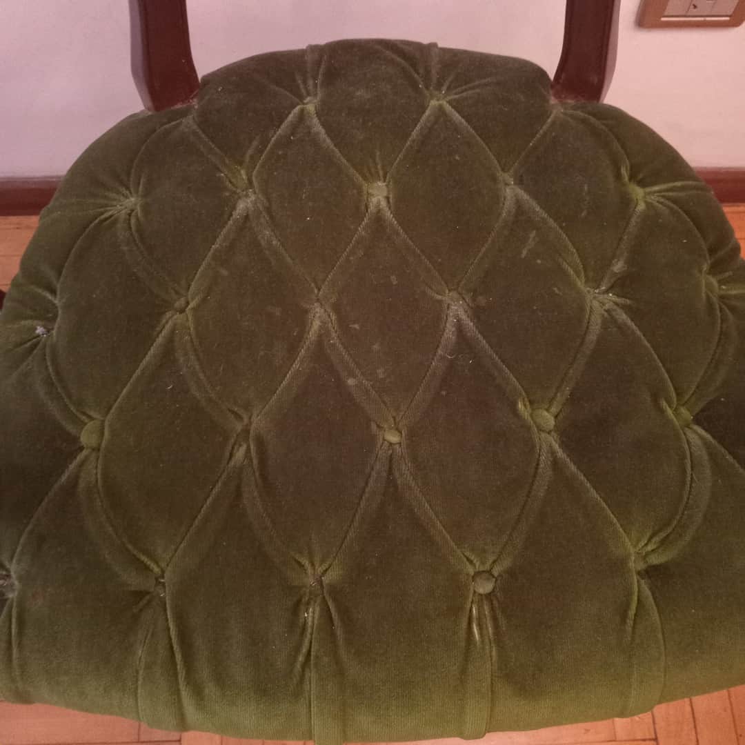Par de sillones tapizados en pana, con desgaste de uso y faltantes de botones en capitoné (ver fotos). 57 x 51 x 100 cm.