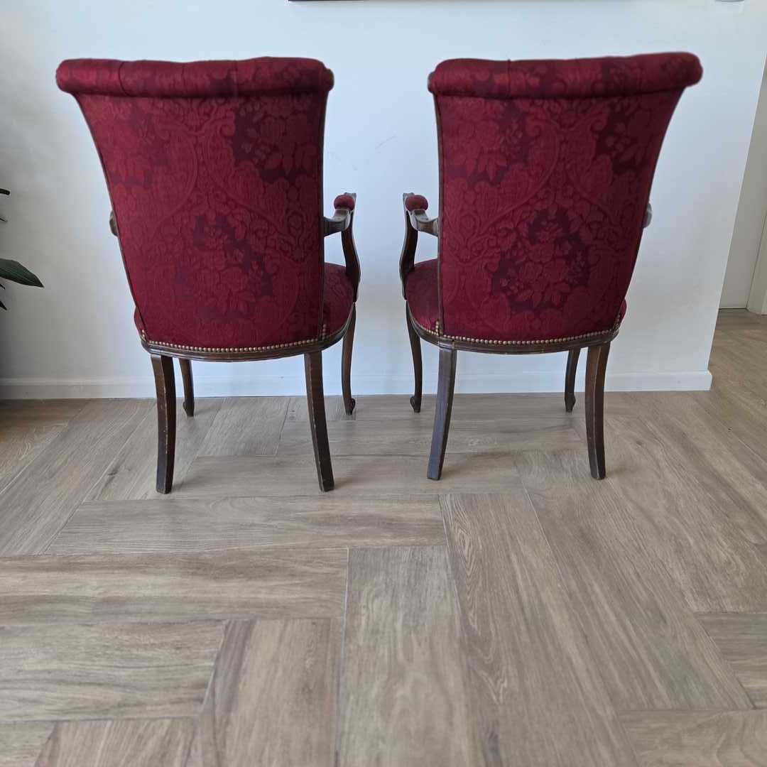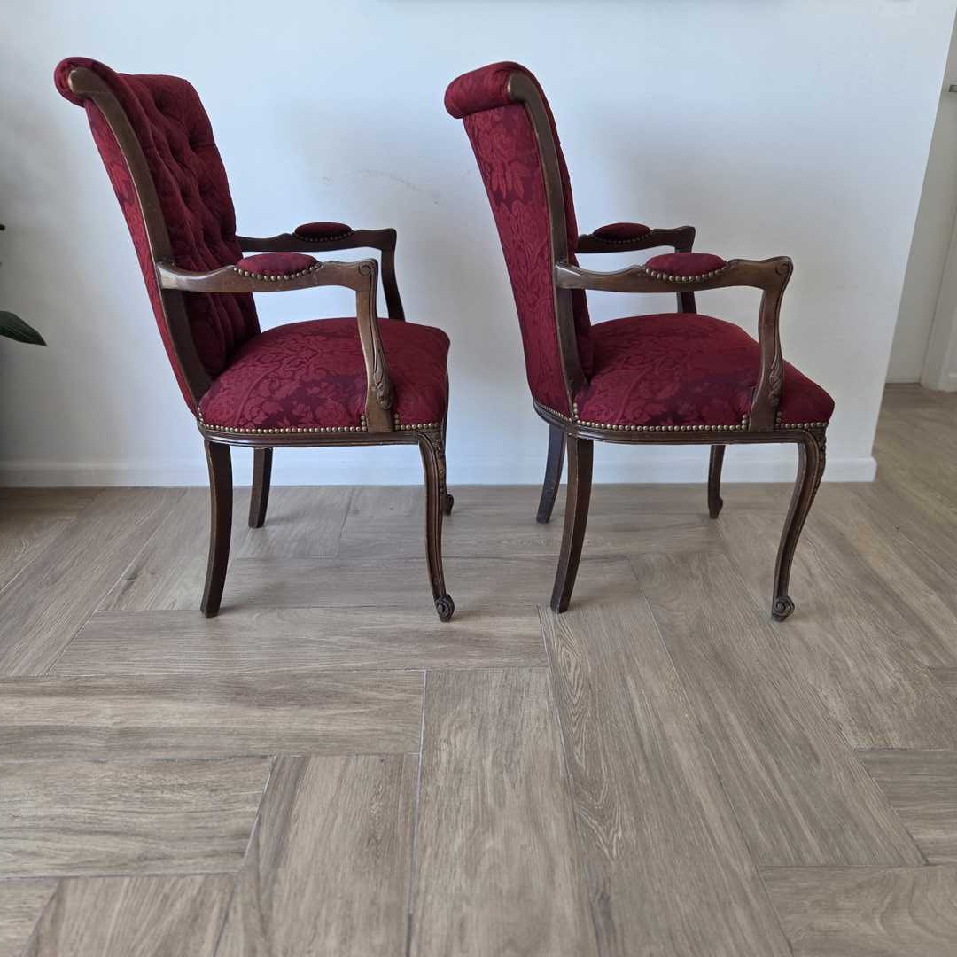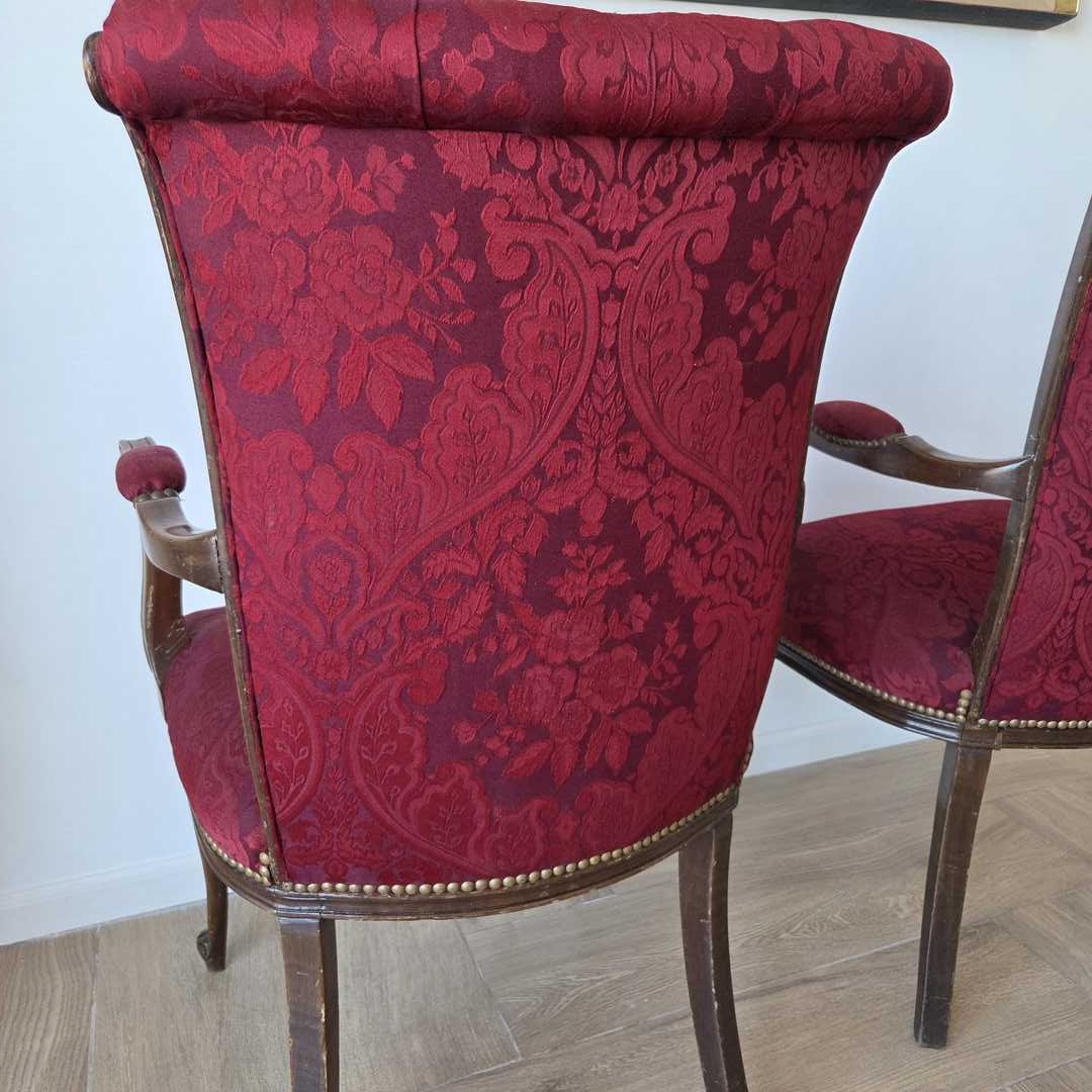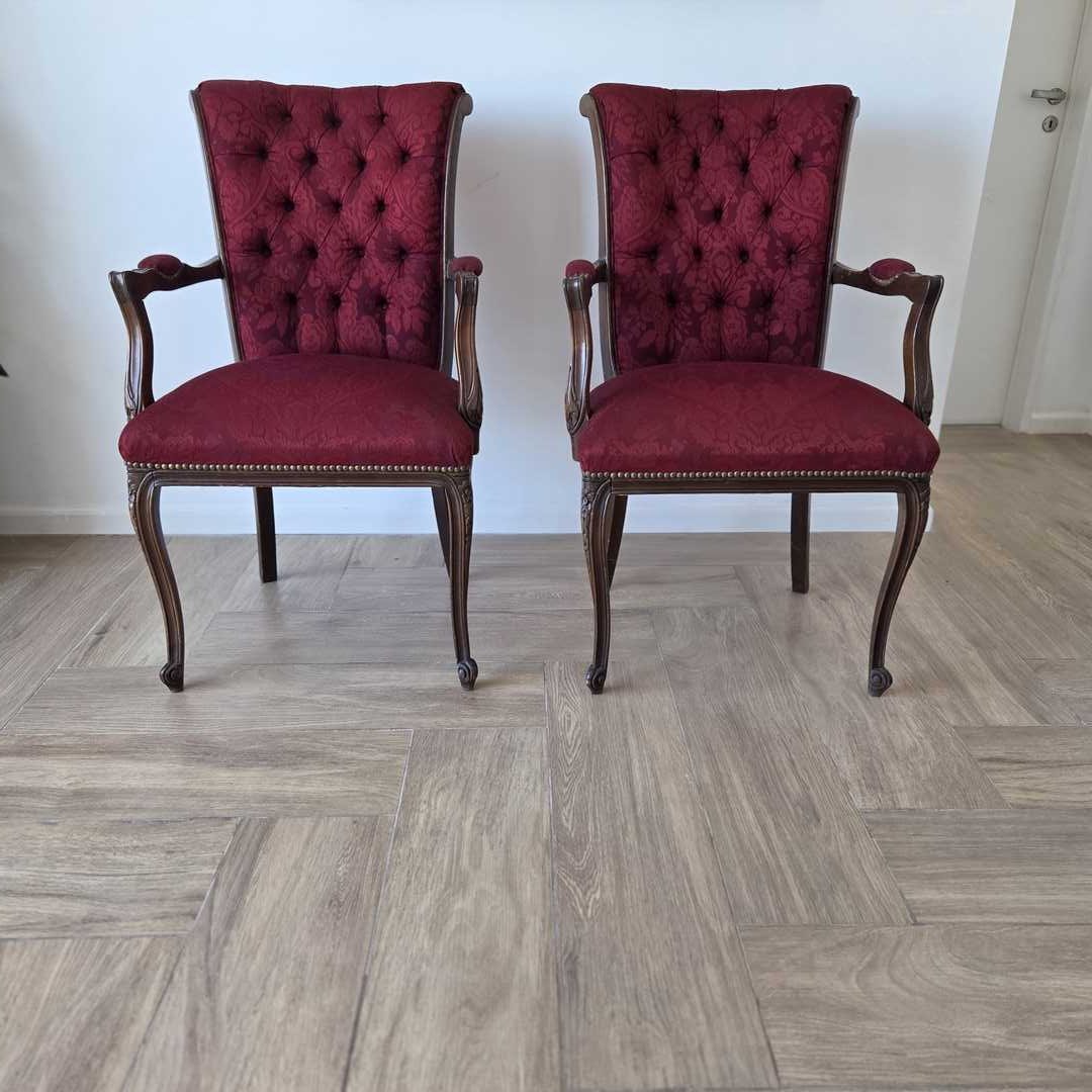 Par de sillones estilo francés con respaldo en capitoné, tapizados en Jacquard satinado color bordó + 2 almohadones.