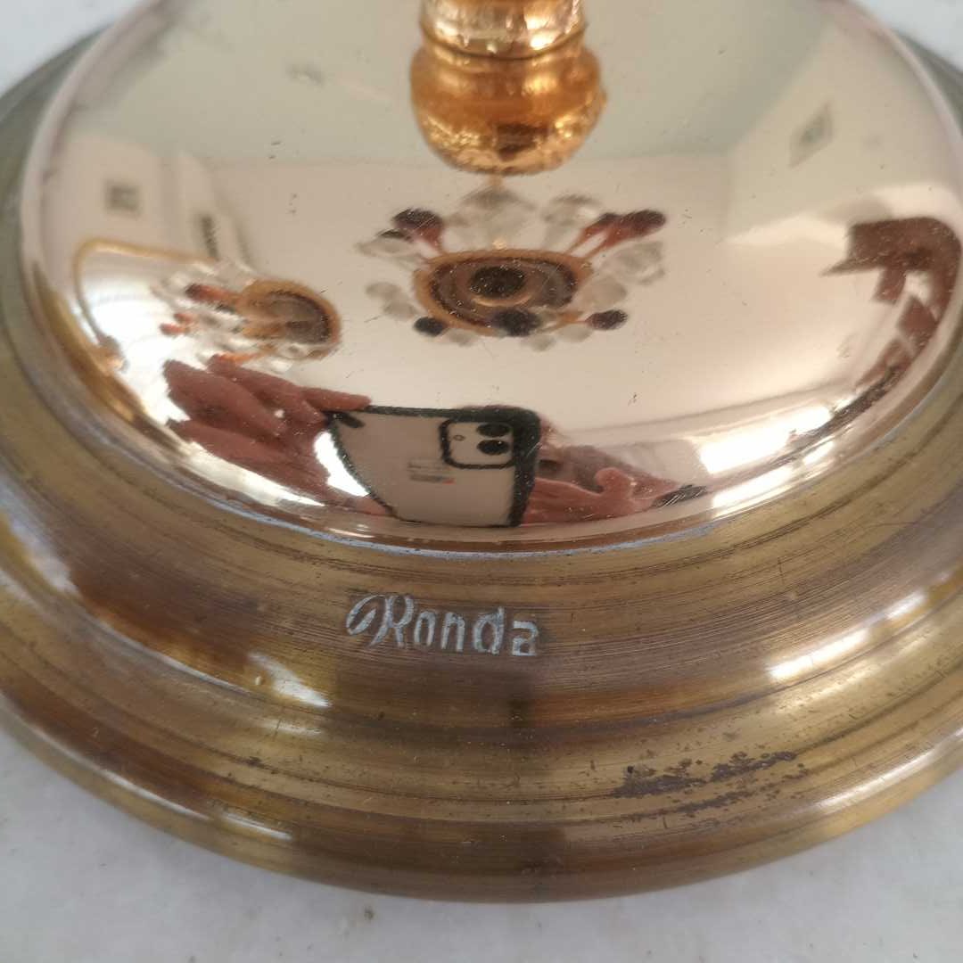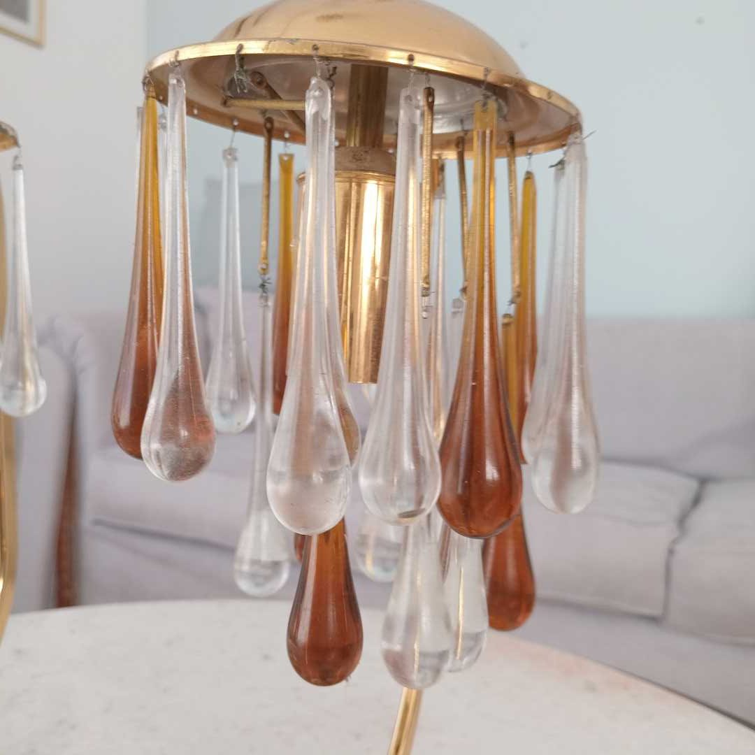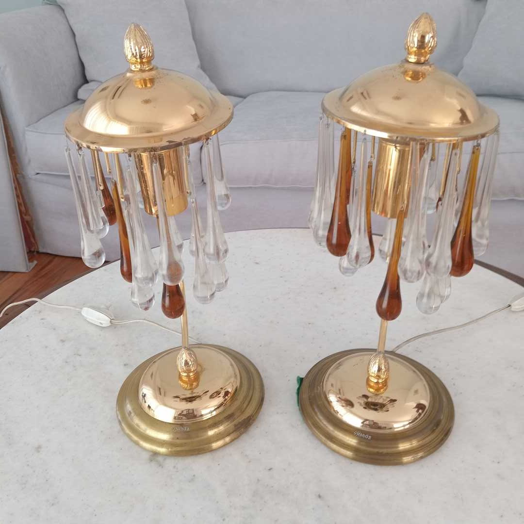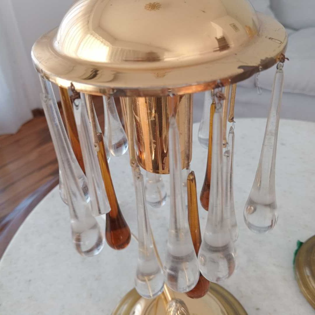 Par de veladores en bronce con gotas de cristal hialinas y ámbar marca Ronda. Con avería, faltantes y detalles (ver fotos). Alt 35 cm. Diám base 15 cm.
