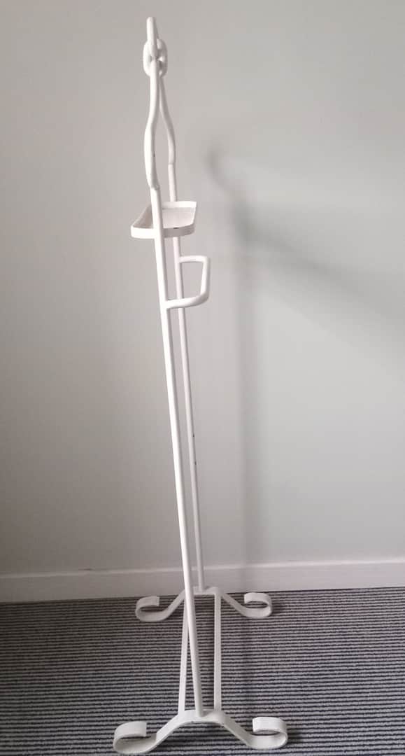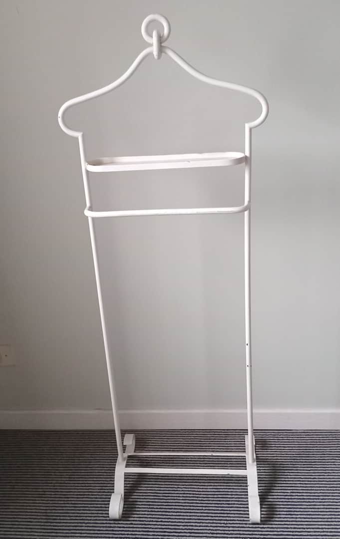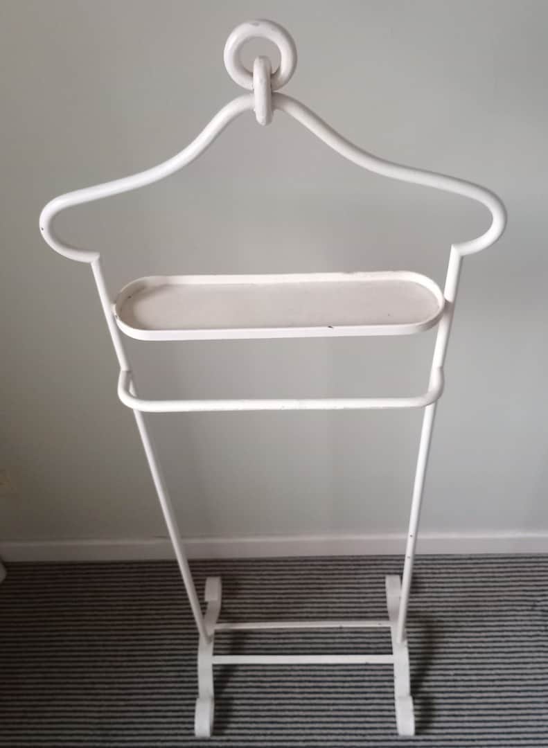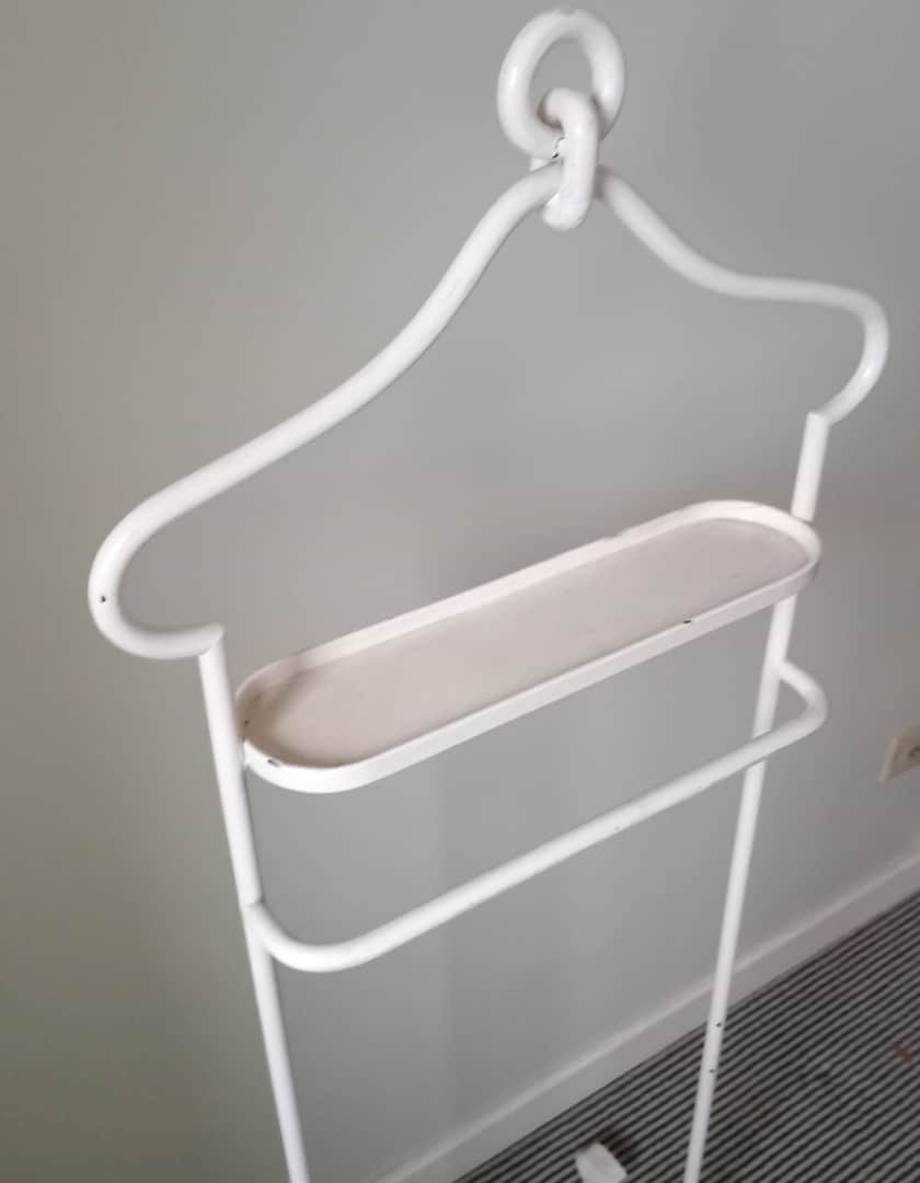 Percha valet en hierro pintado de blanco. Con detalle (ver fotos). Ancho 44 cm. Alt 117 cm.