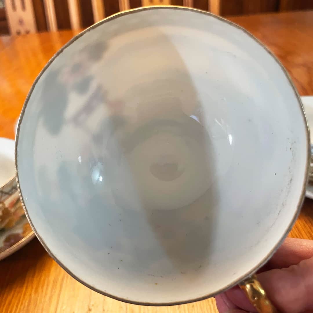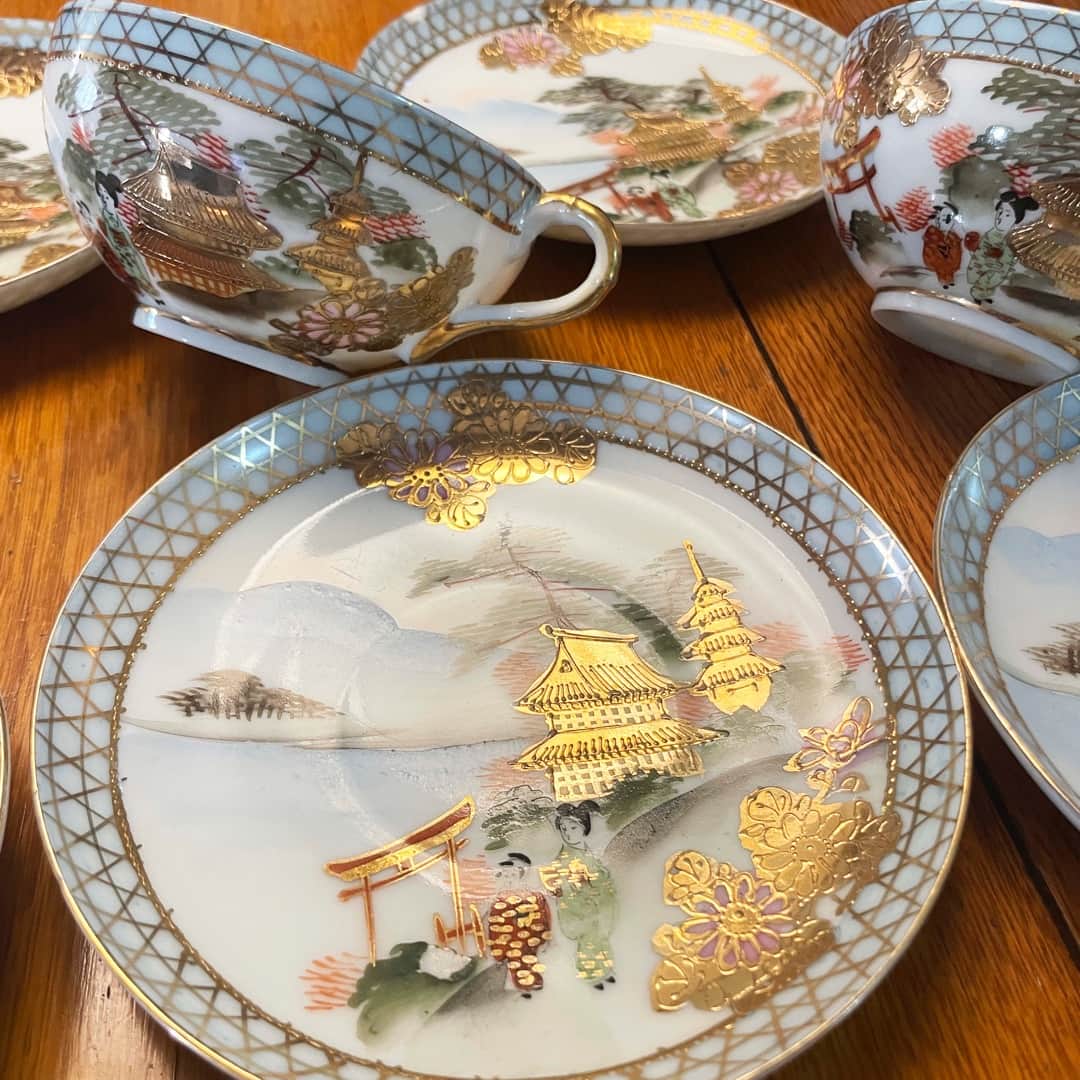 Porcelana japonesa, cáscara de huevo con decoración en oro, 3 duos de té + 2 platos. Altura tazas 5 cm, Ø 14 cm platos. Un plato con cachadurita.