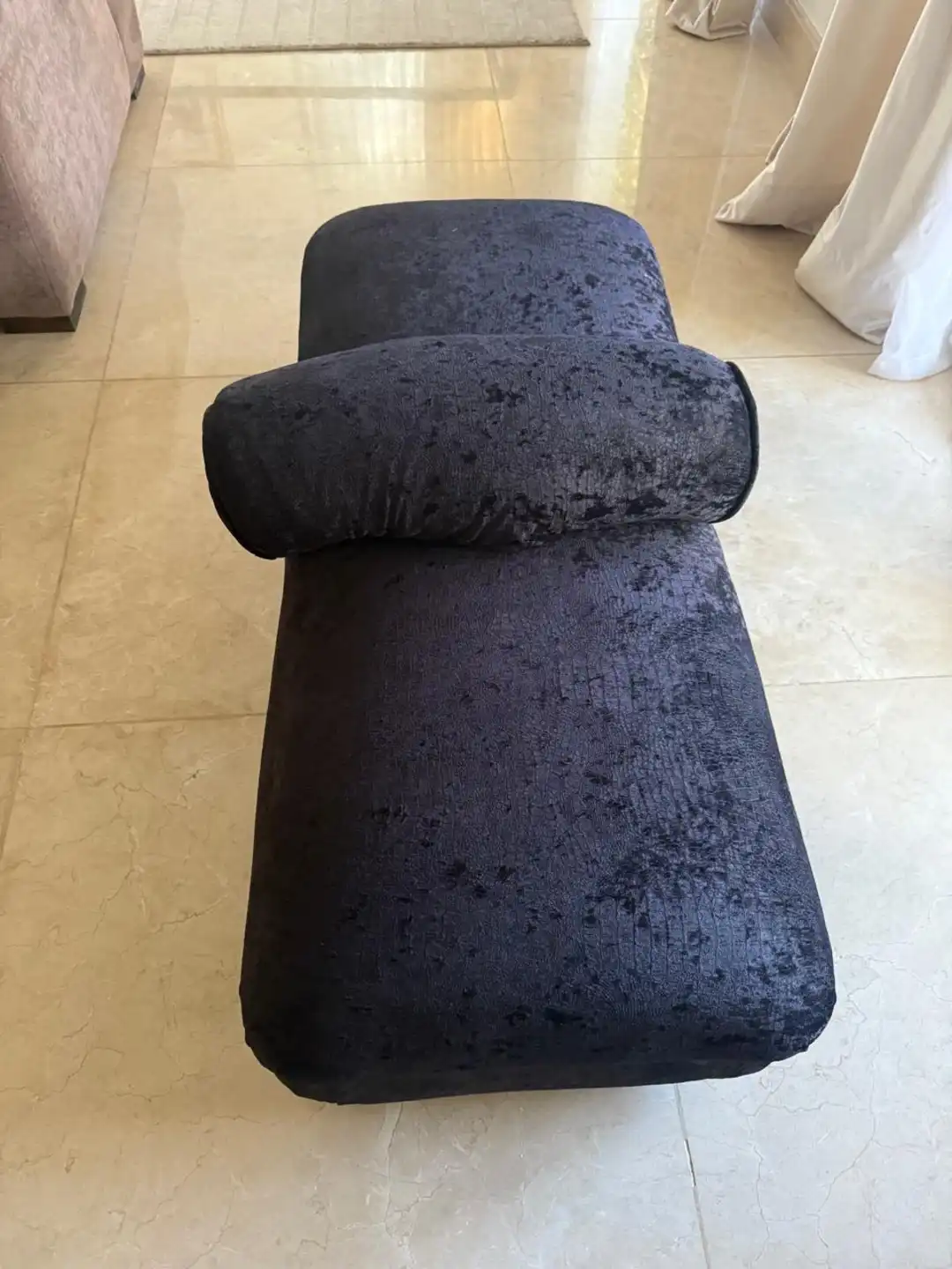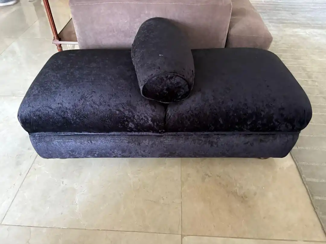 Puff 2 cuerpos tapizado en pana color negro, con almohadón divisorio. Medidas: 125 x 55 cm. Alt 37 cm.