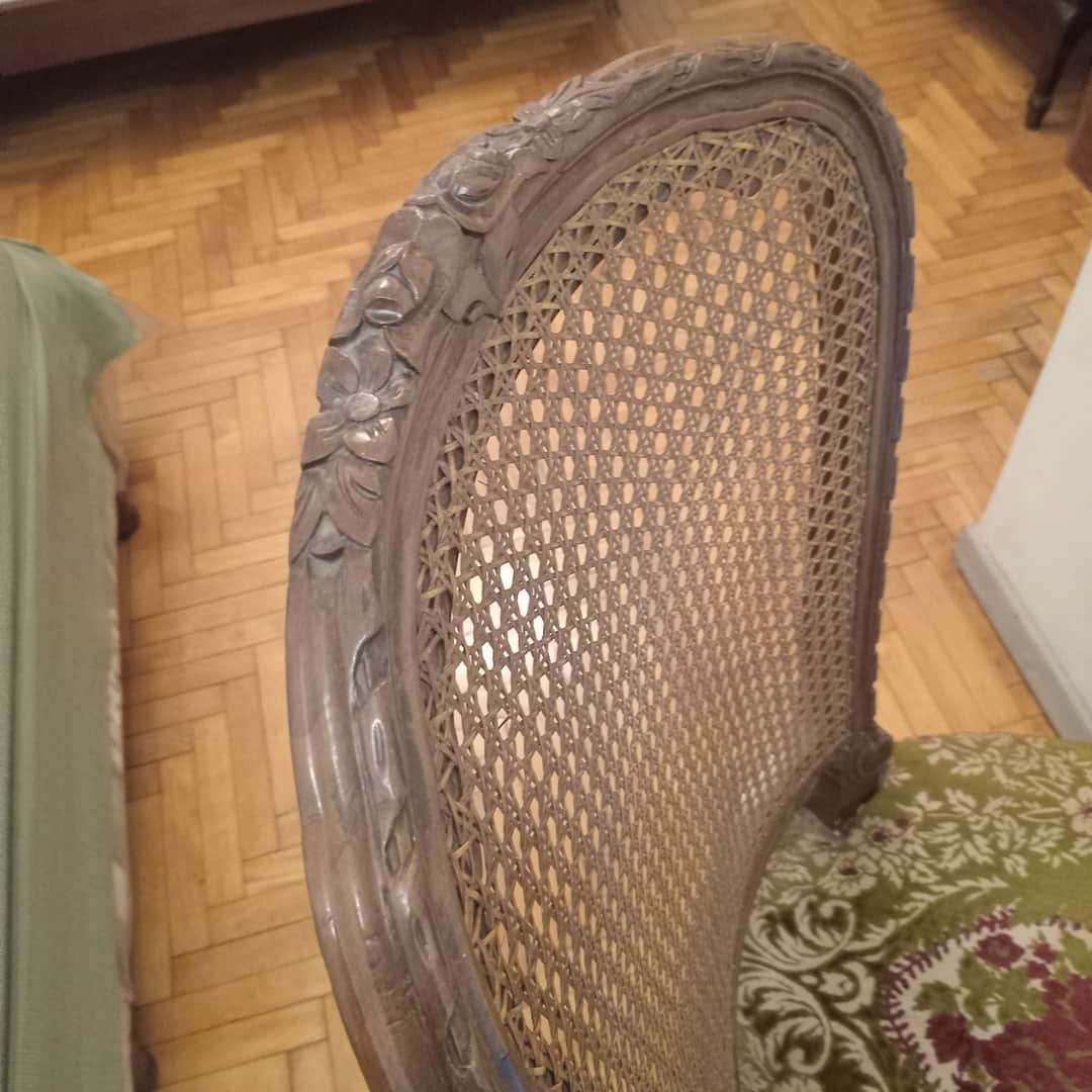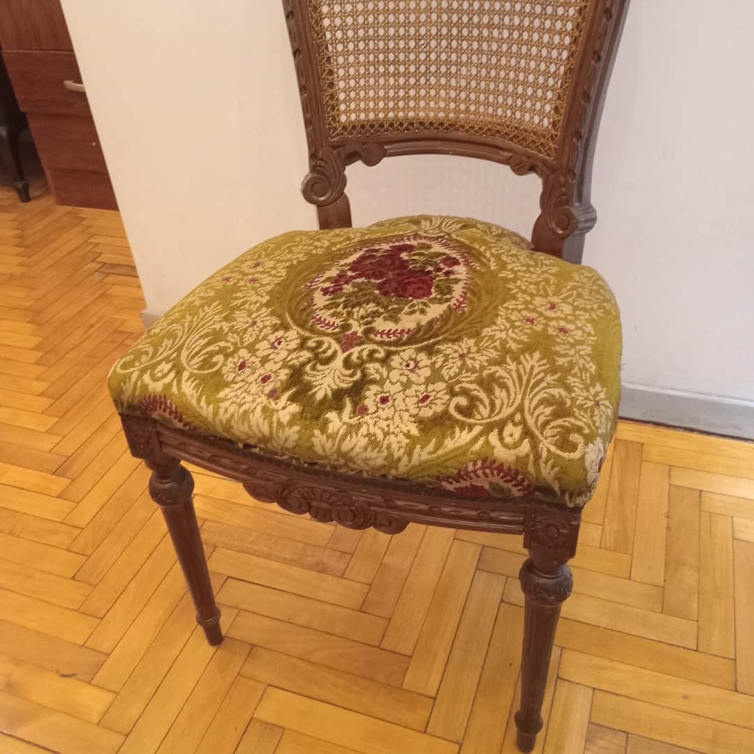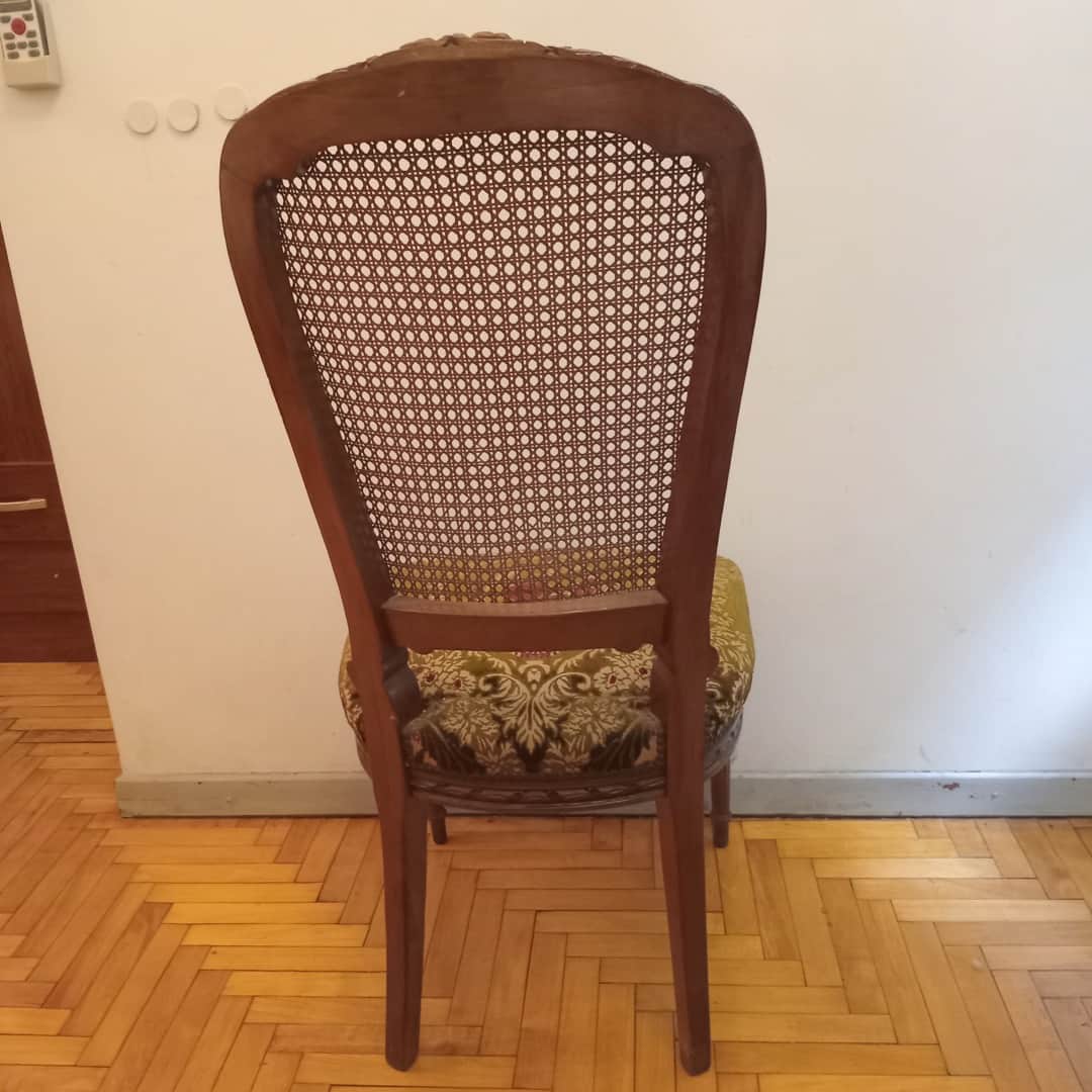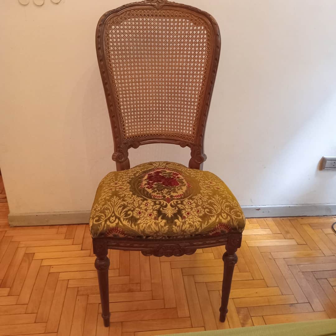 Silla tapizada en bordó y verde con respaldo esterillado. 49 x 47 x 105 cm.