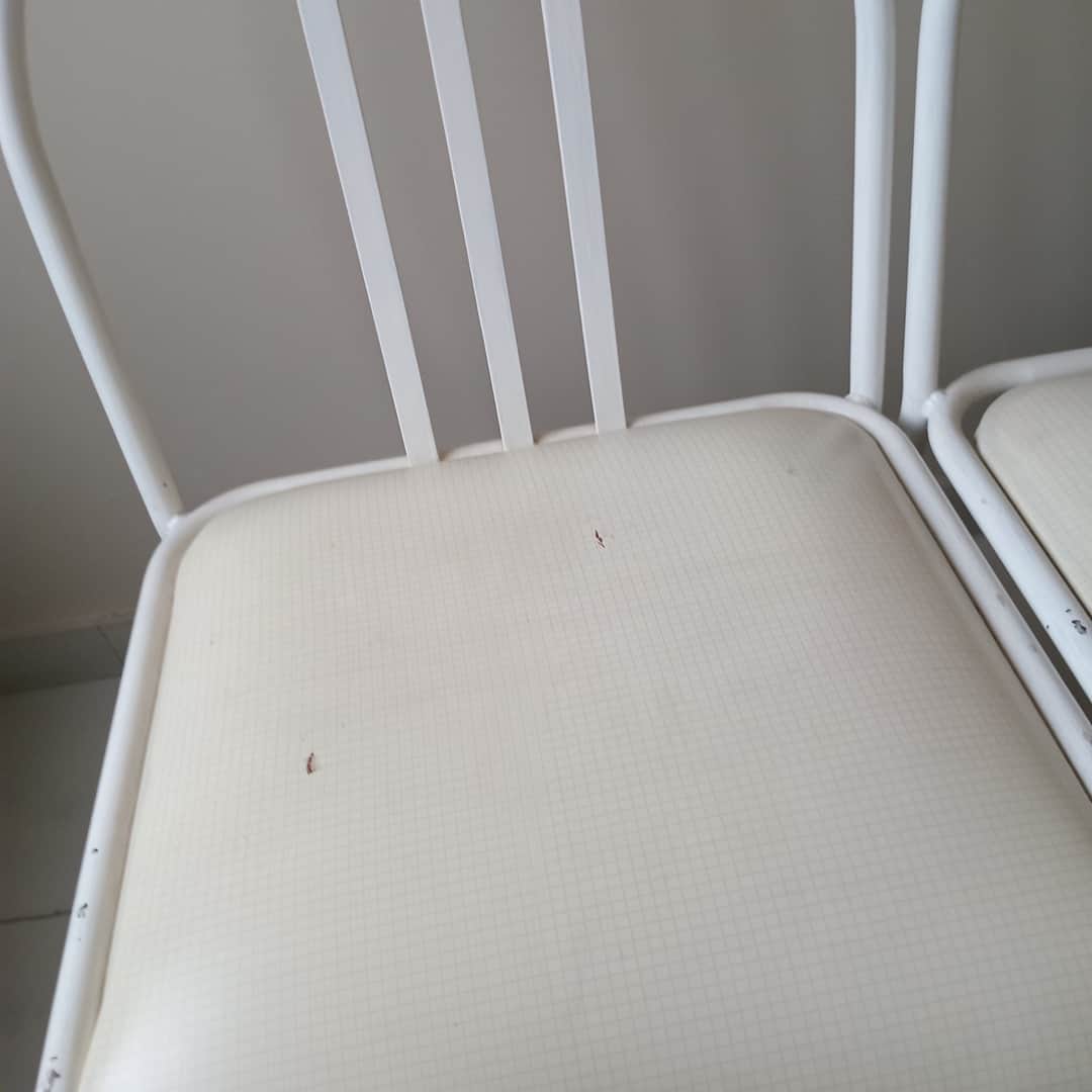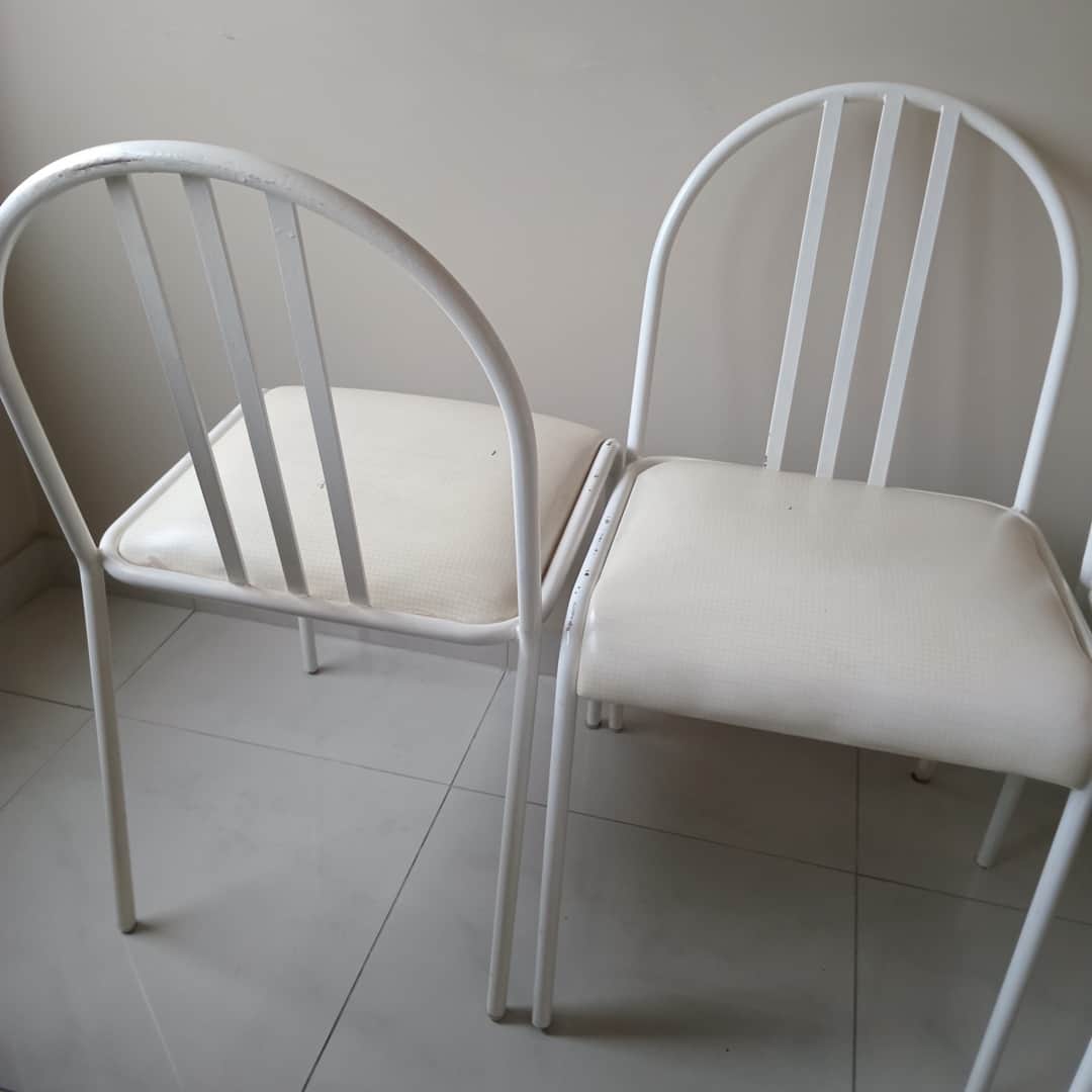 4 sillas de caño blanco con cuerina a cuadrillé en natural. Con desgaste y detalles (ver fotos). 45 x 42 cm. Alt 84 cm.