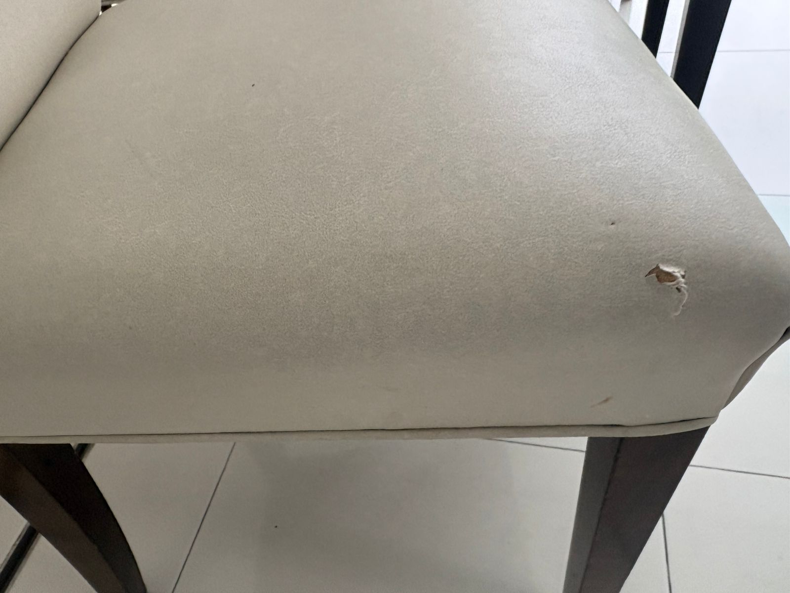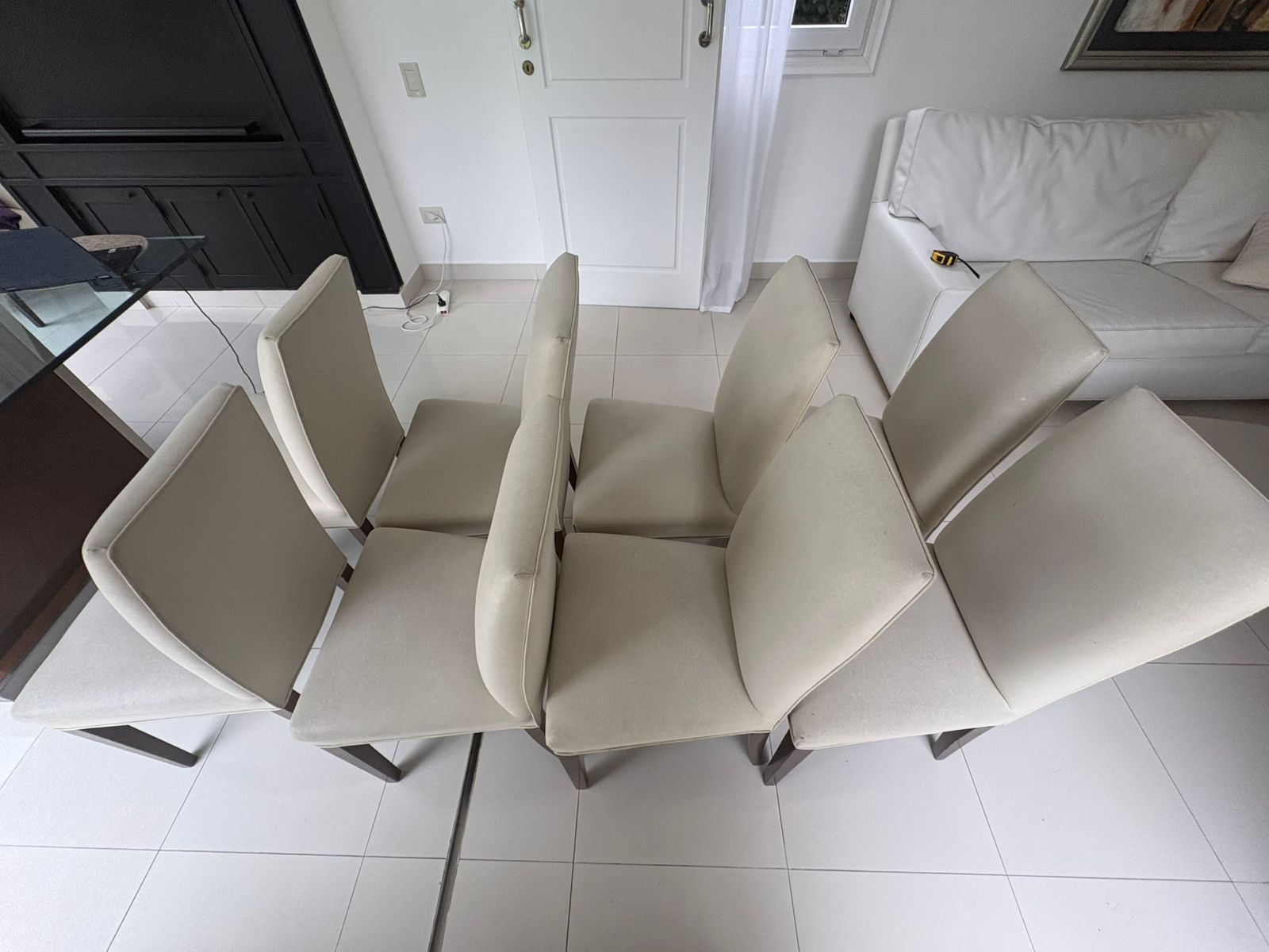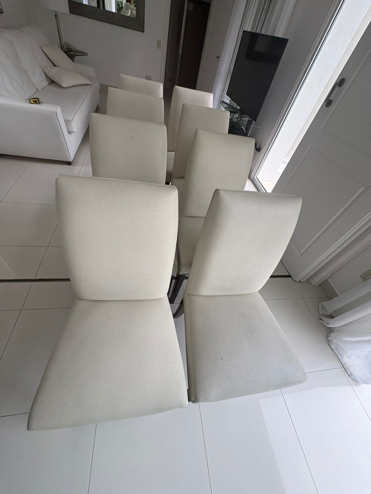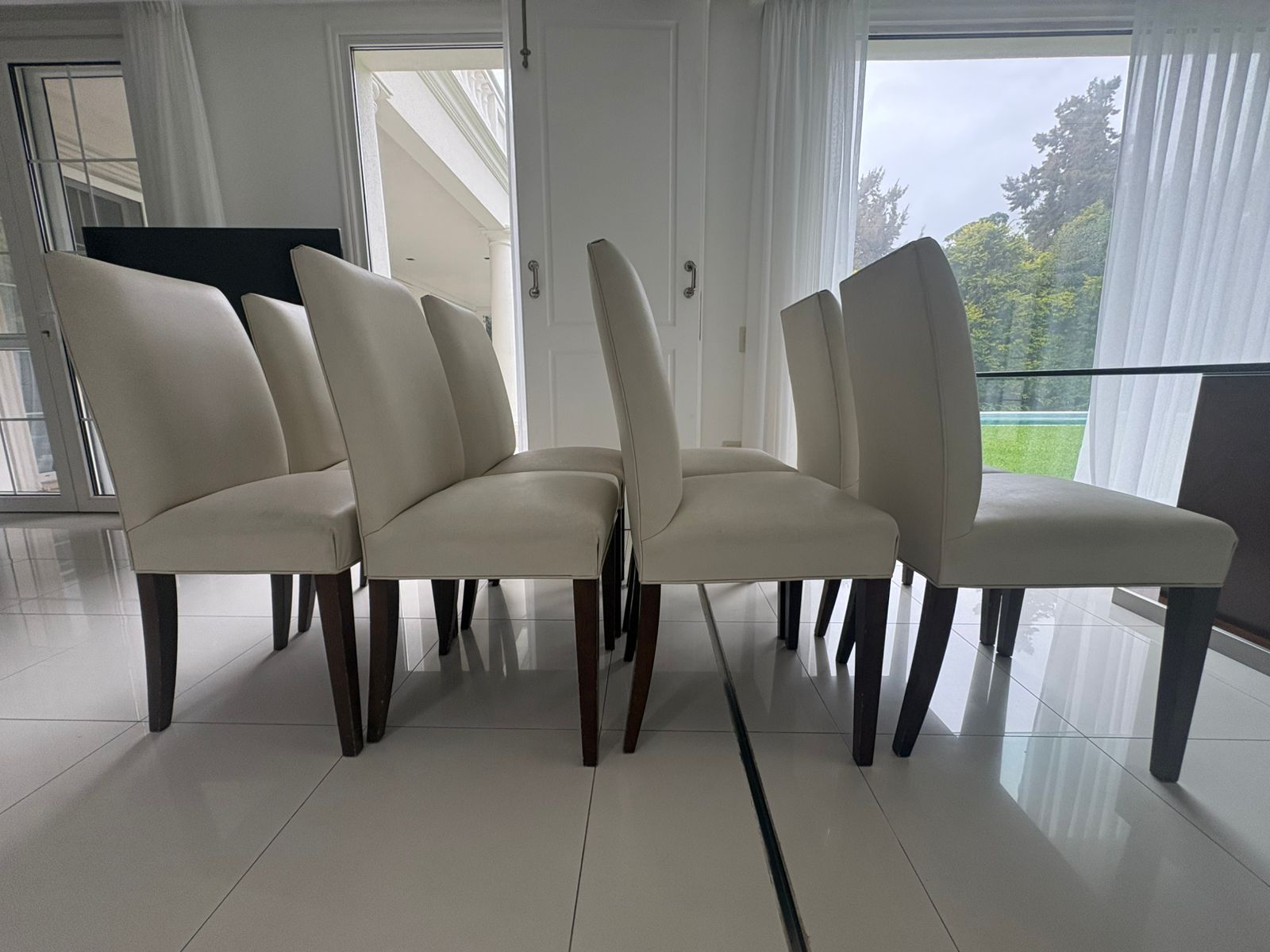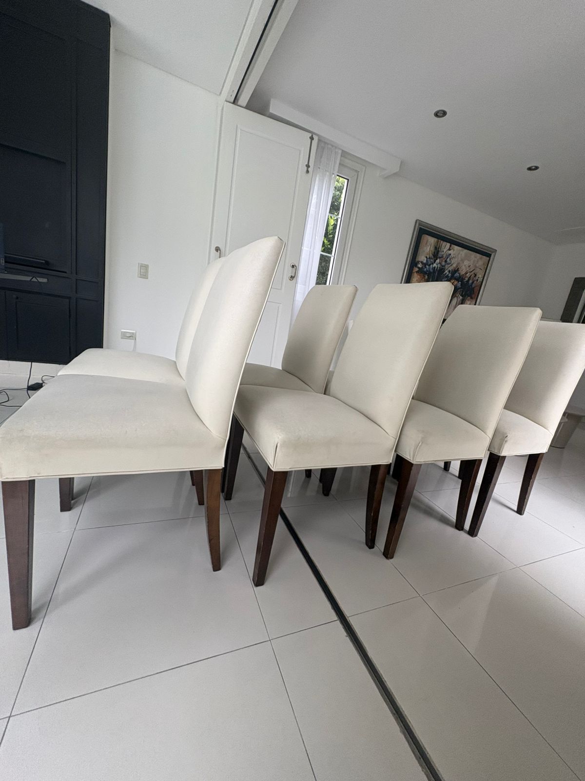 9 sillas de cuero con patas de madera de roble confeccionadas por Hebanista. Una de las sillas con detalles en tapizado, ver fotos. Medidas: 43 x 43 cm. Alt 94 cm