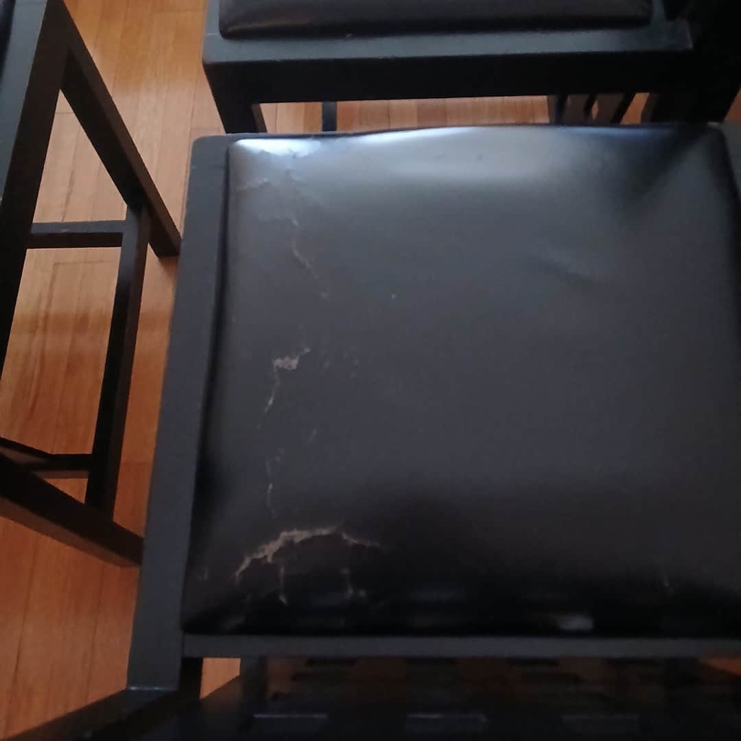 6 sillas de diseño de importante arquitecto argentino con incrustaciones en nácar y asiento en cuero (1 con avería. Sillas con detalles de uso. Ver fotos). 48 x 48 x 75 cm.