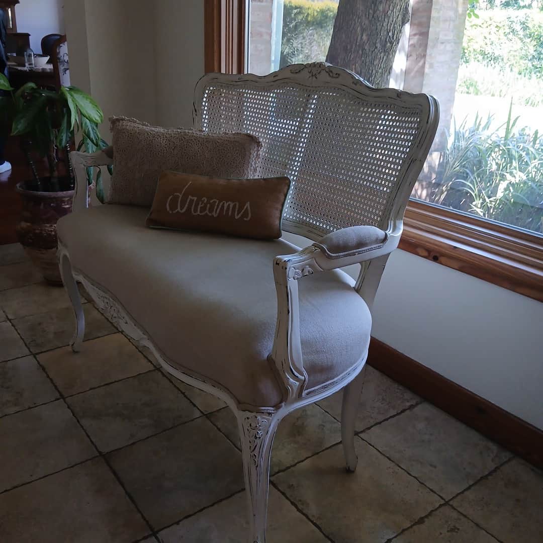 Sillón 2 cuerpos estilo francés con esterilla y asiento tapizado en lino color crudo. 108 x 500 cm.