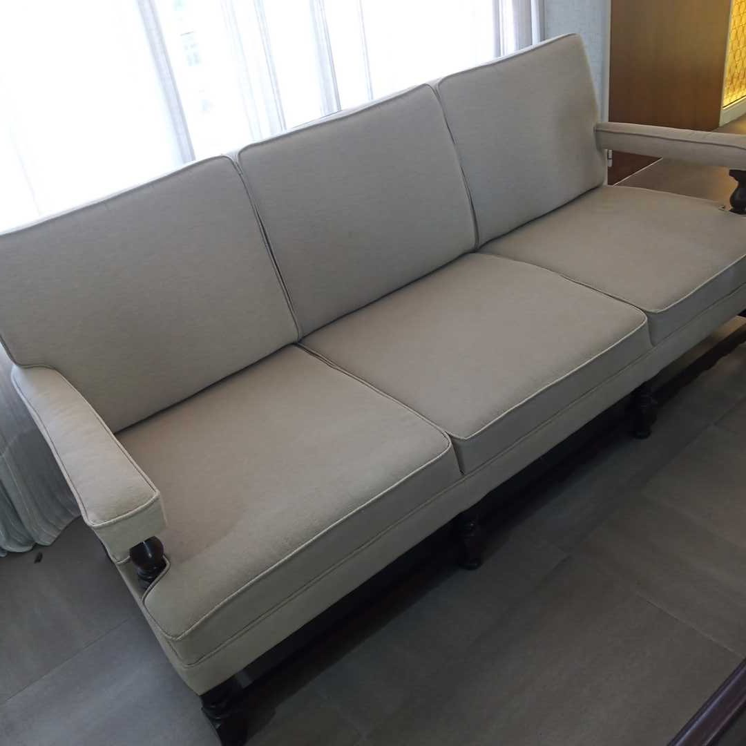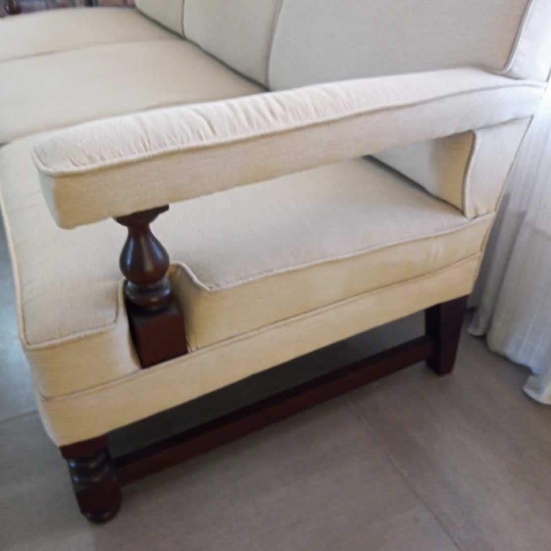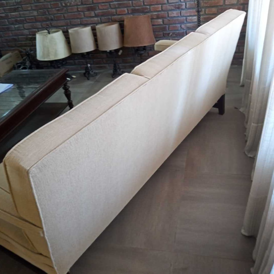 Sillón 3 cuerpos tapizado rústico en color natural/beige. Frente 195 cm. Alt respaldo 82 cm.