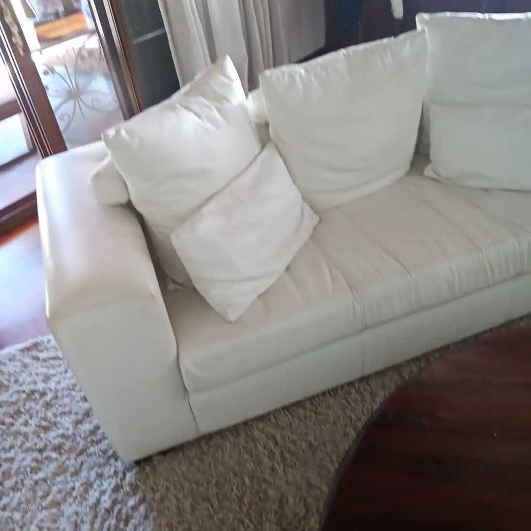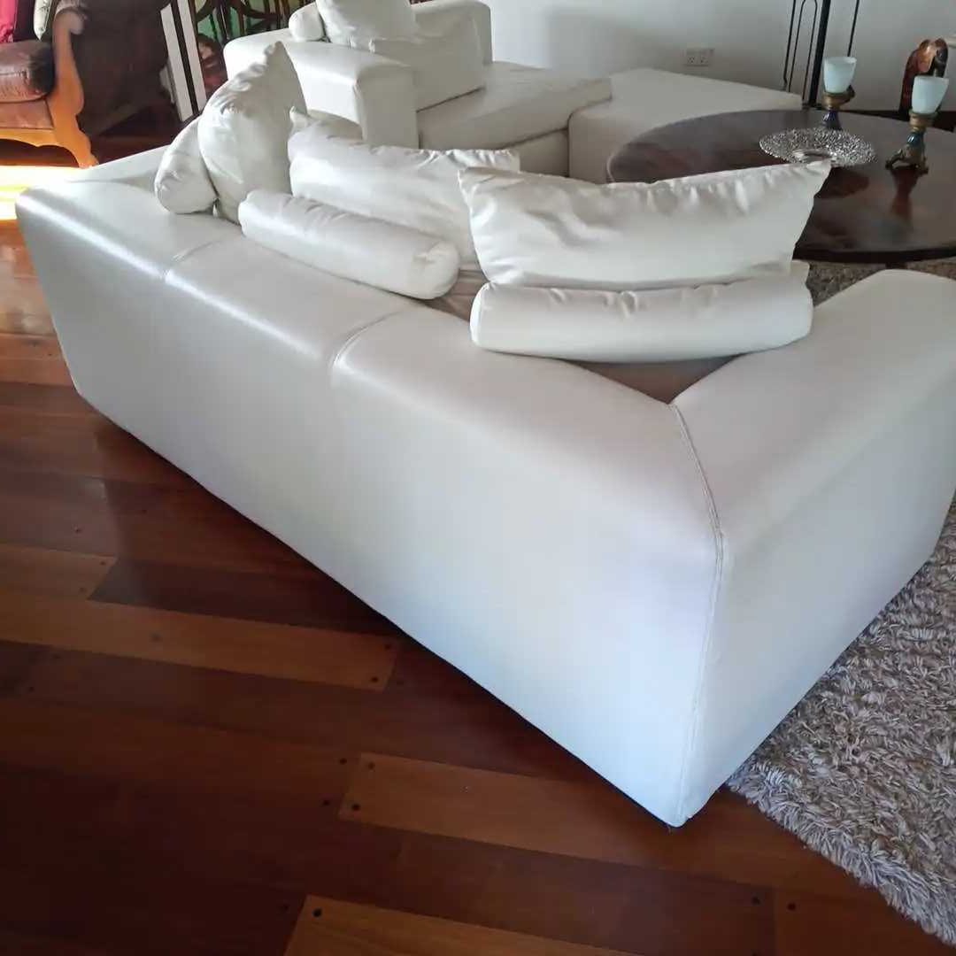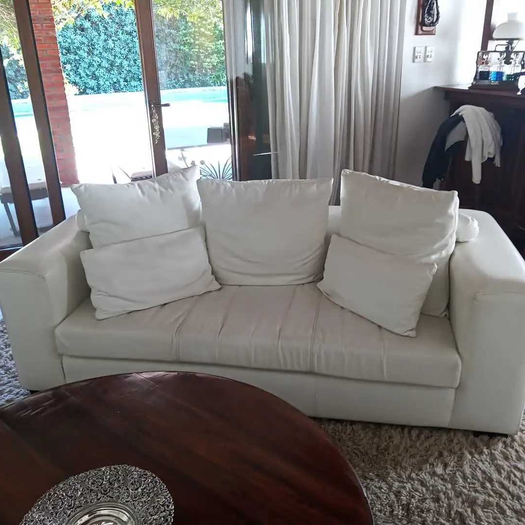 Sofá 3 cuerpos en cuero blanco + 5 almohadones con pespuntes. 205 x 90 cm. Alt 60 cm.