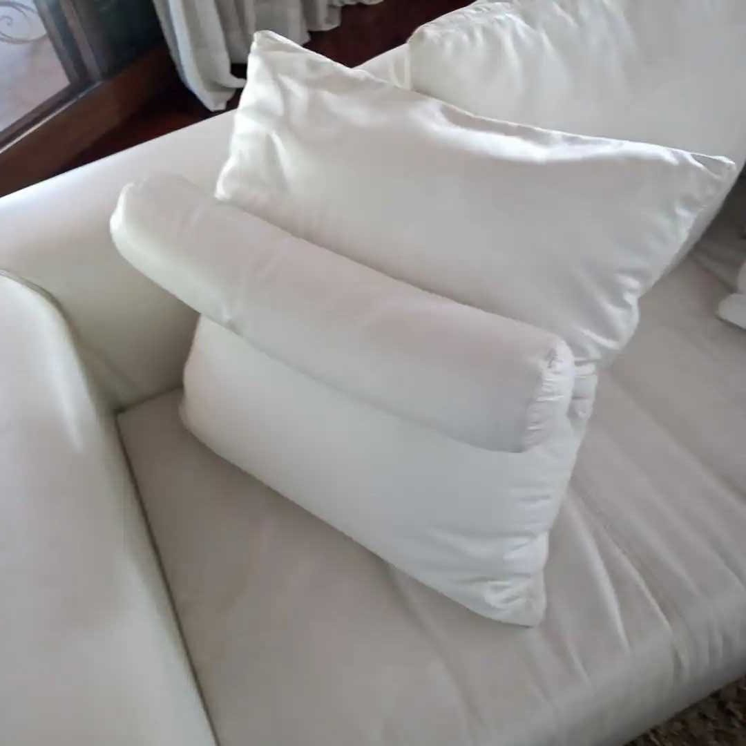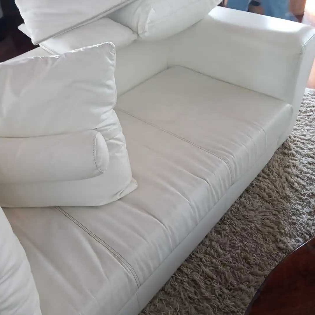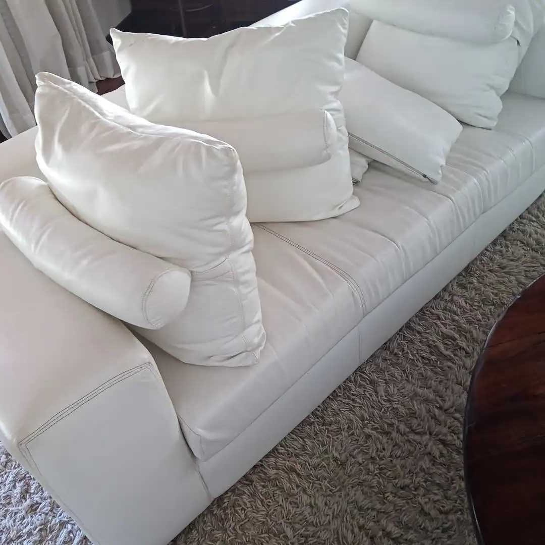 Sofá 3 cuerpos en cuero blanco + 5 almohadones con pespuntes. 205 x 90 cm. Alt 60 cm.