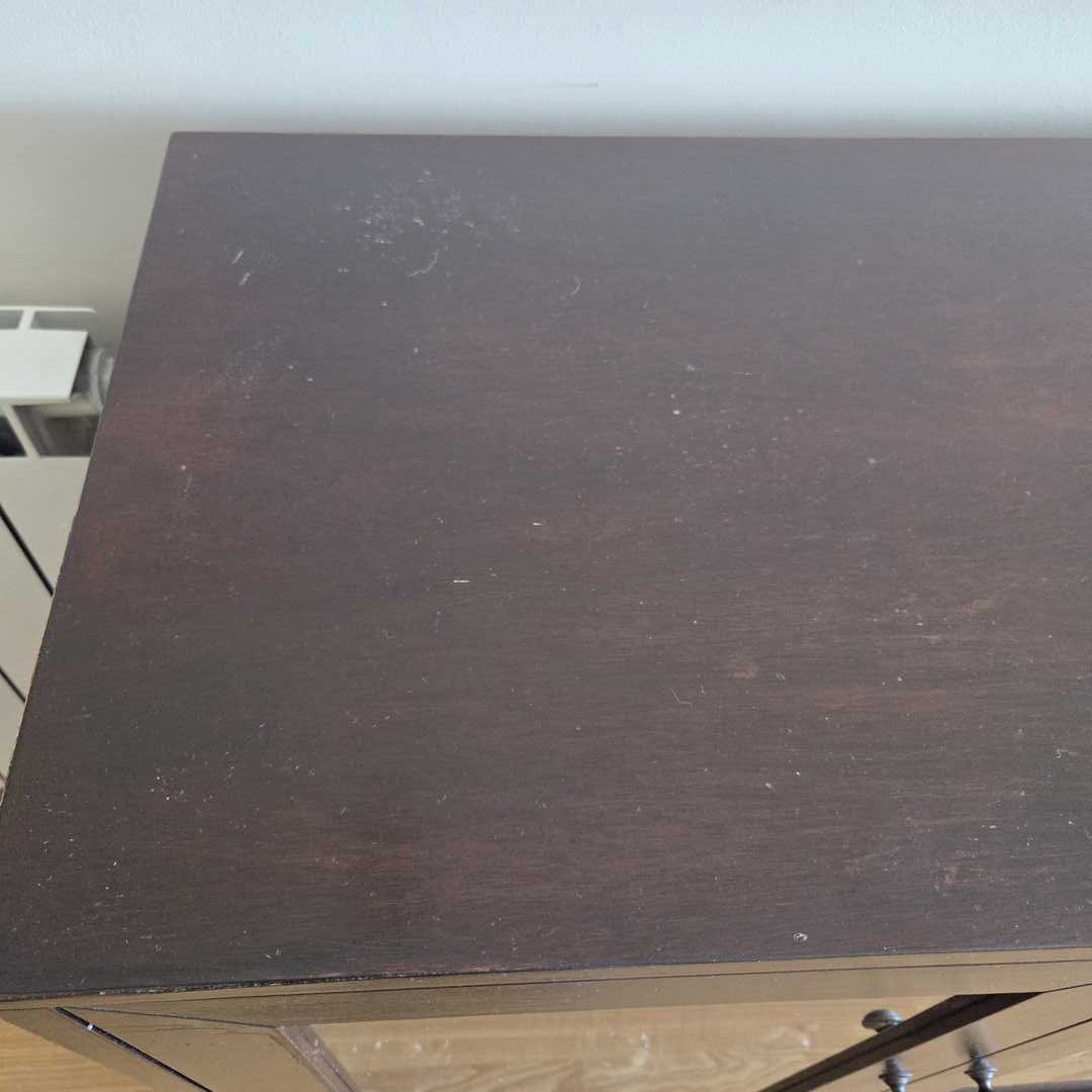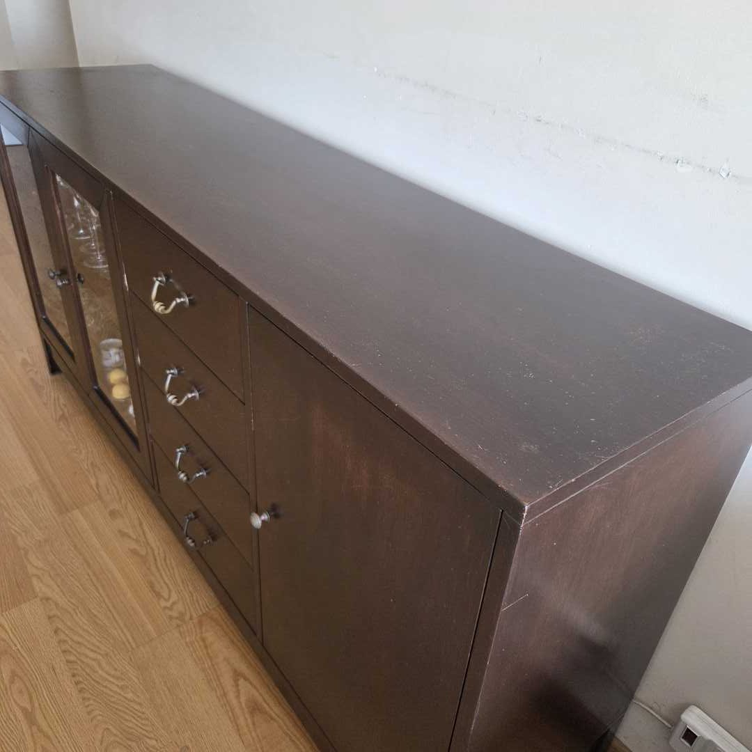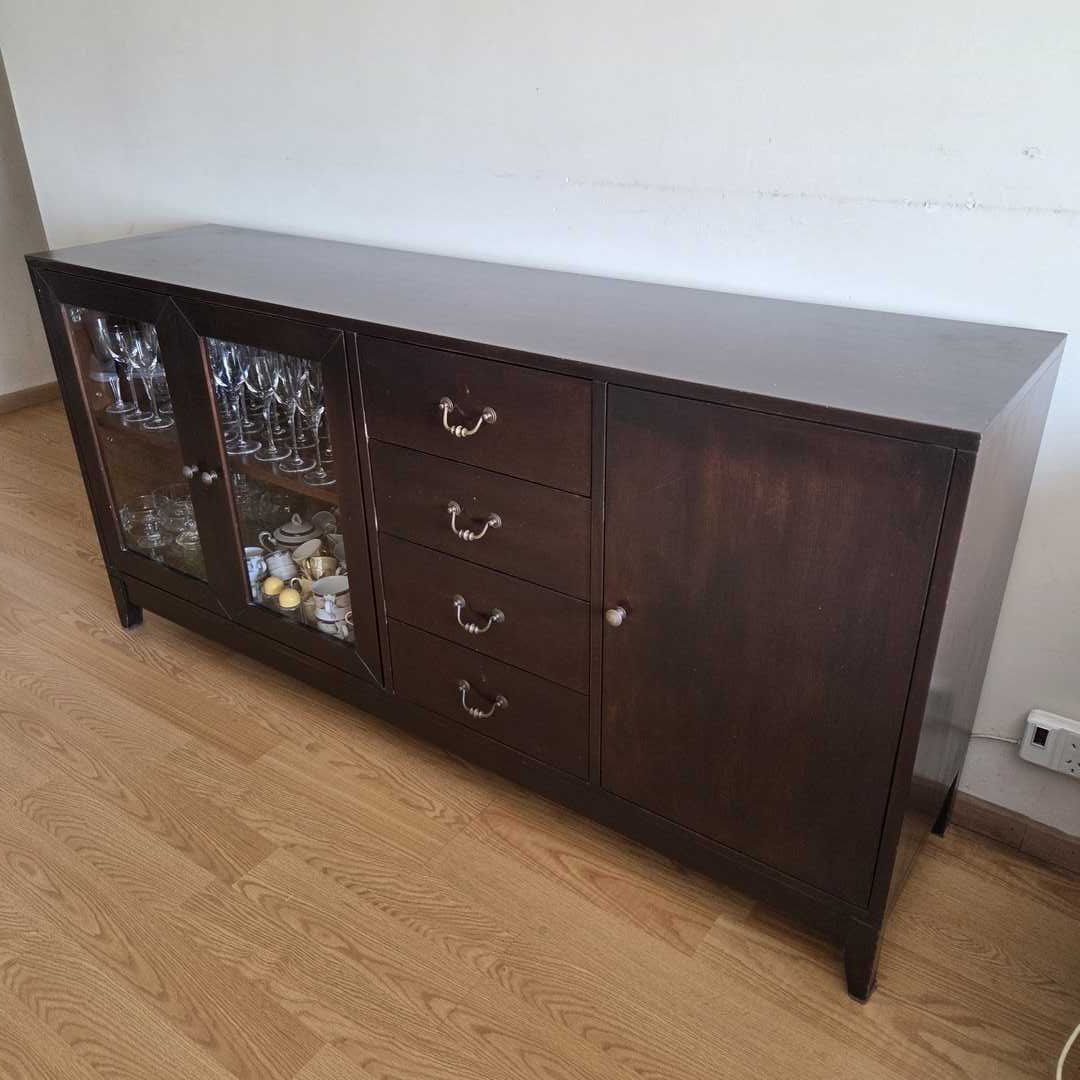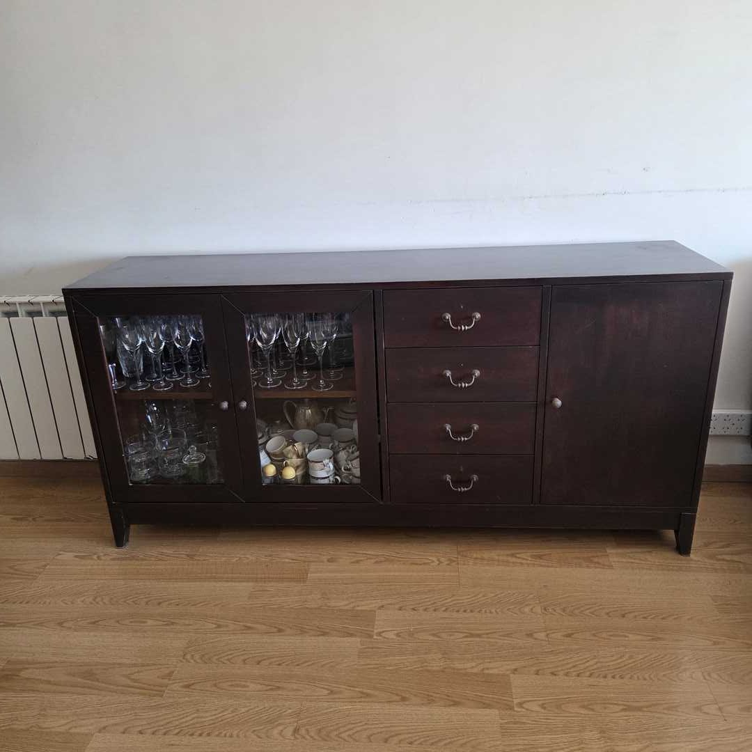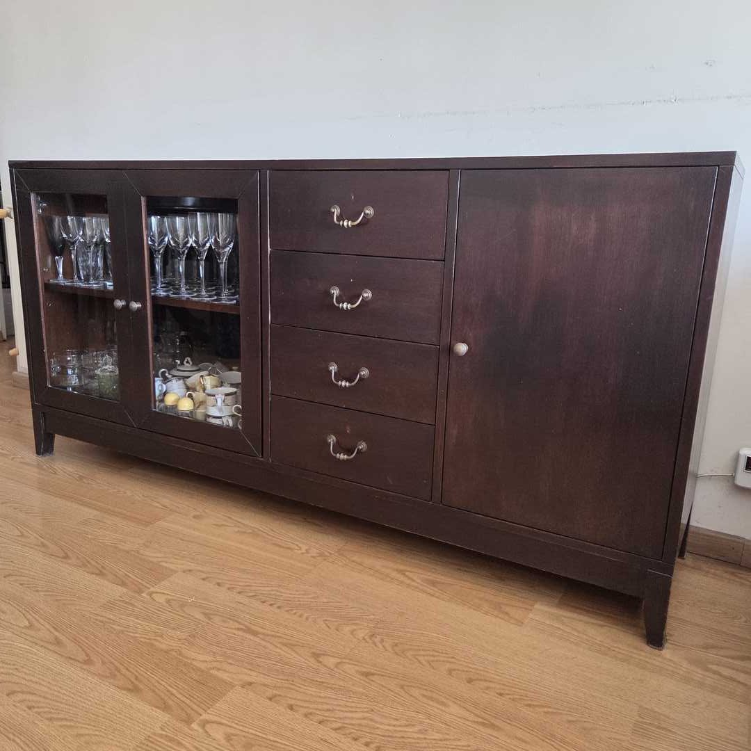 Vajillero en madera color wengue con 3 puertas y 4 cajones, con herrajes en bronce. Con desgaste de uso (ver fotos). No se incluye el contenido. Medidas: 170 x 42 x 82 cm alt. Atención: baja 6 pisos por escalera.