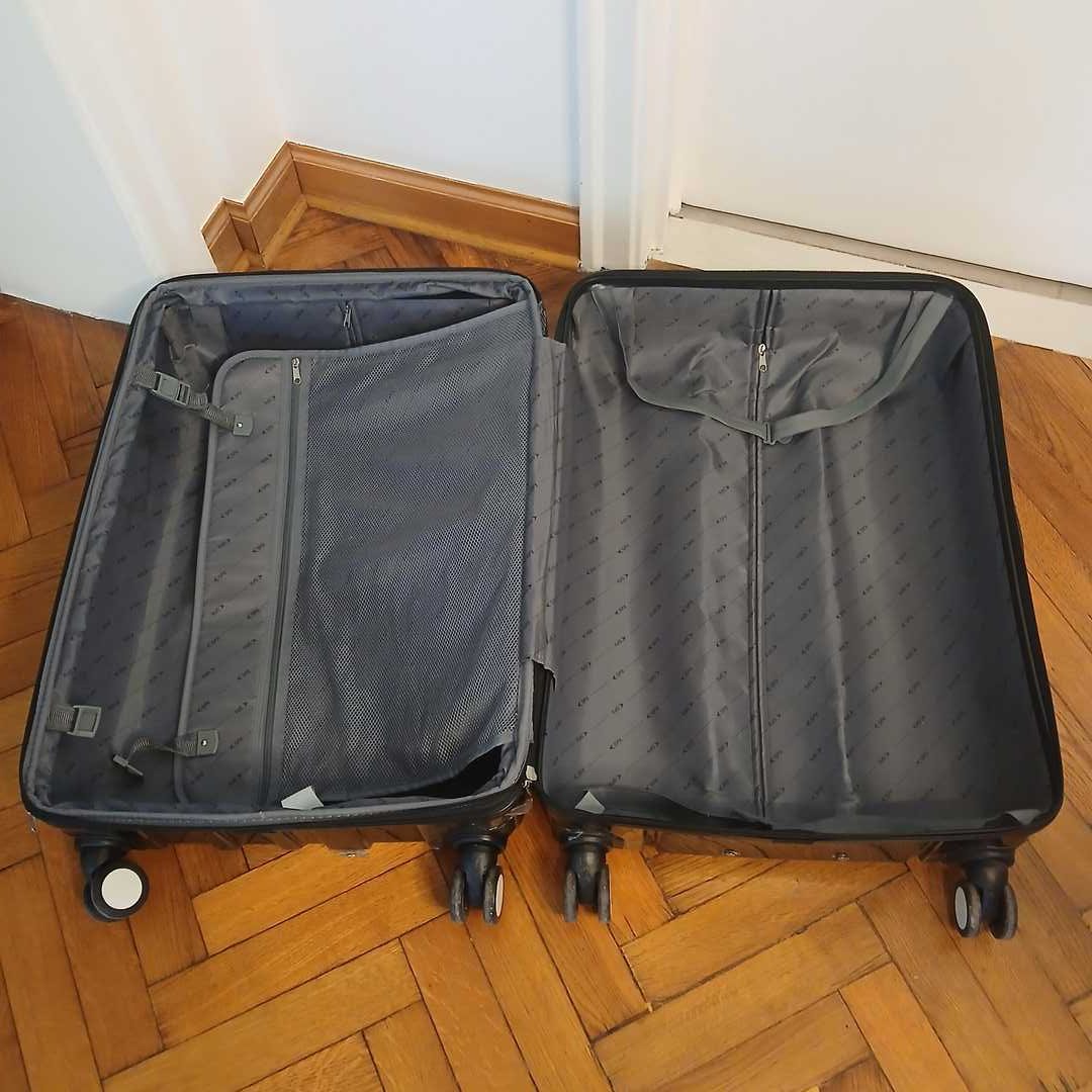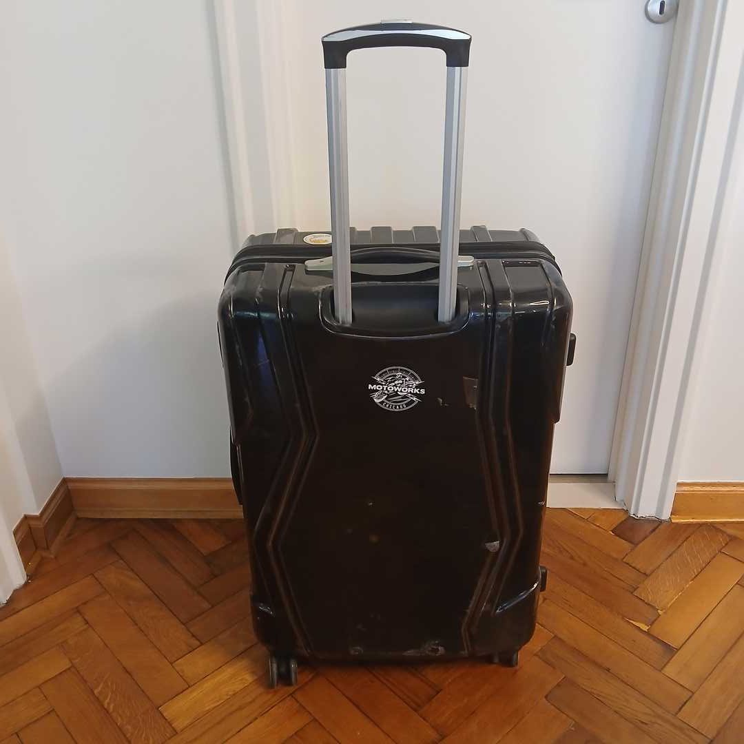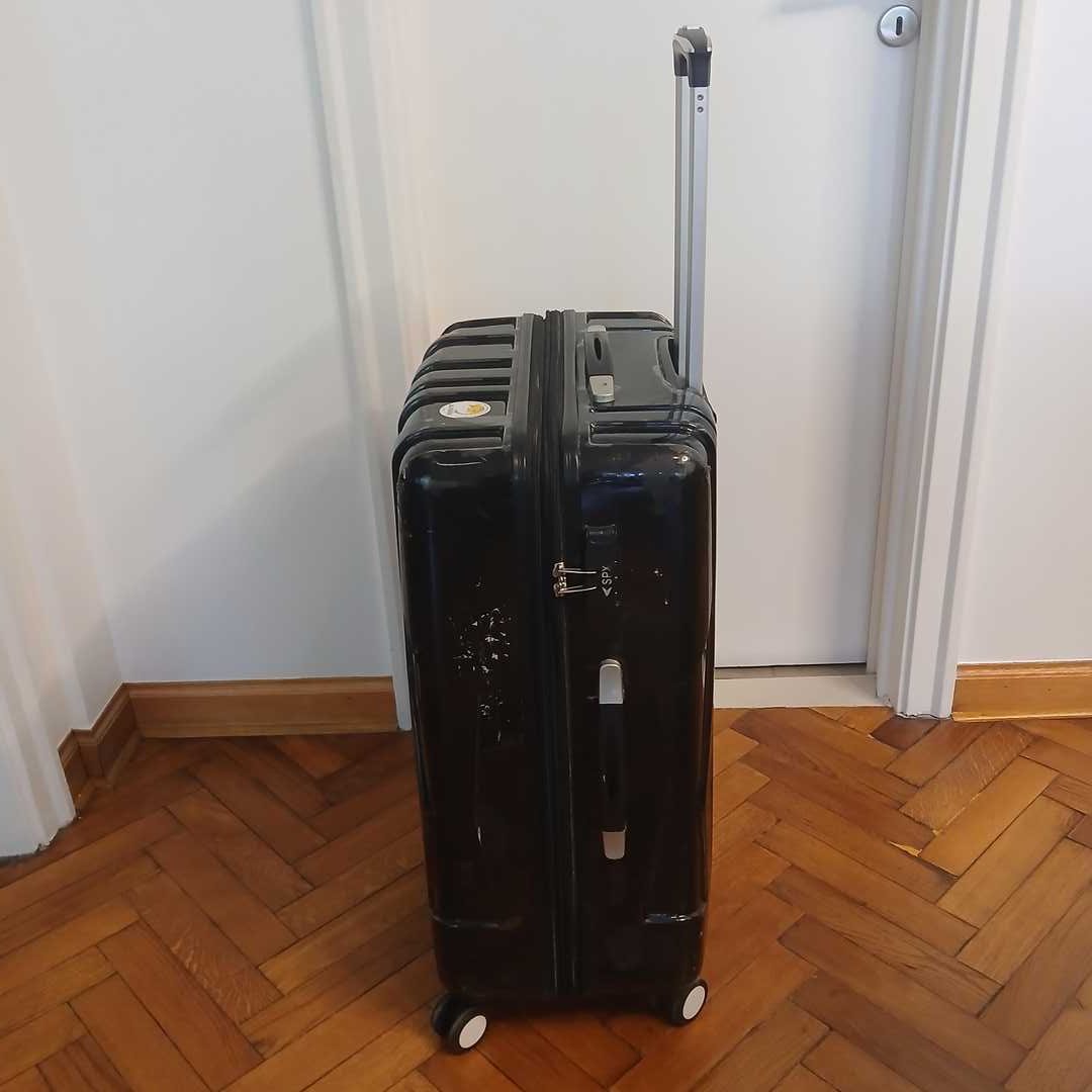 Valija con flor negra, con fuelle, 4 ruedas y candado numérico. Con desgaste de uso en el vinilo externo. Marca SPX. Retiro el miércoles 22/4 de 14 a 15 hs por Belgrano.