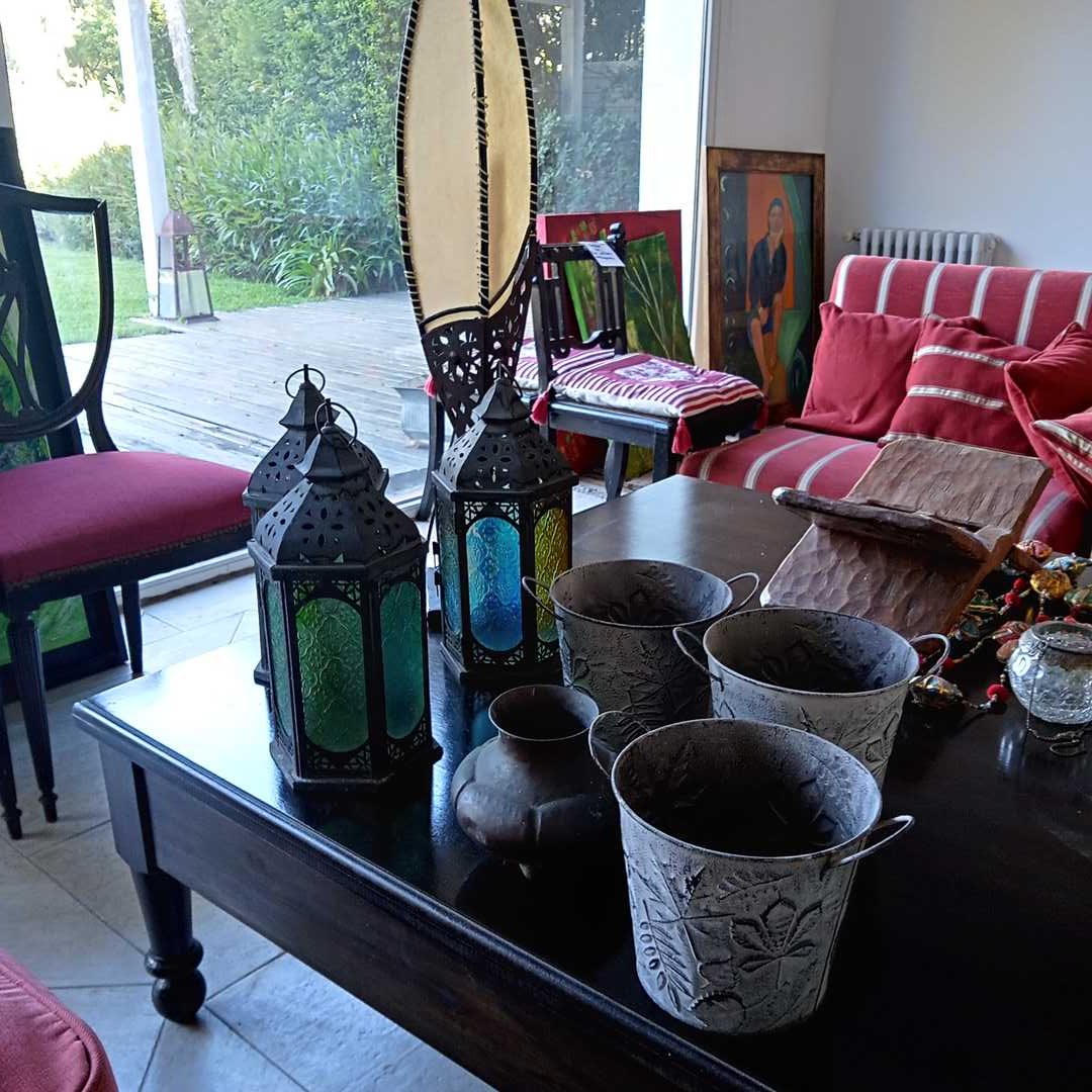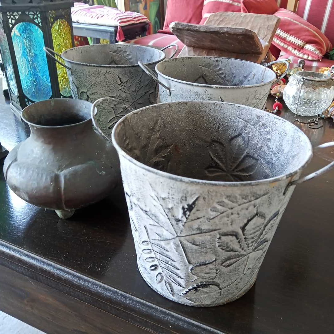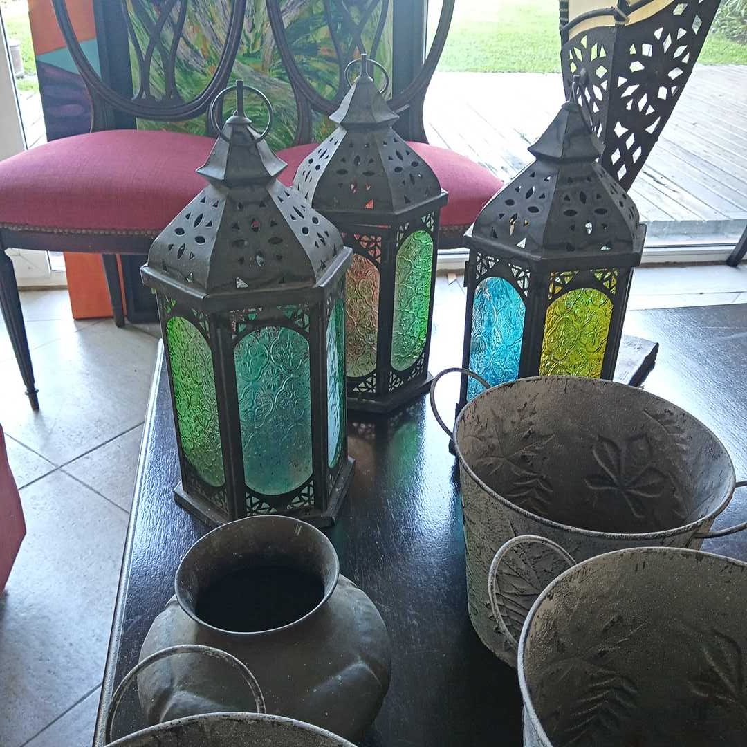8 piezas: iluminación y recipientes en chapa. Alt farol 32 cm.