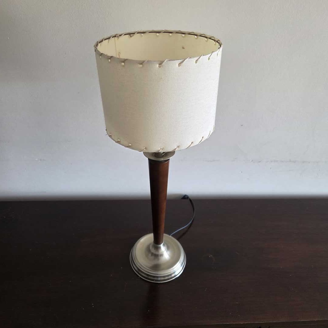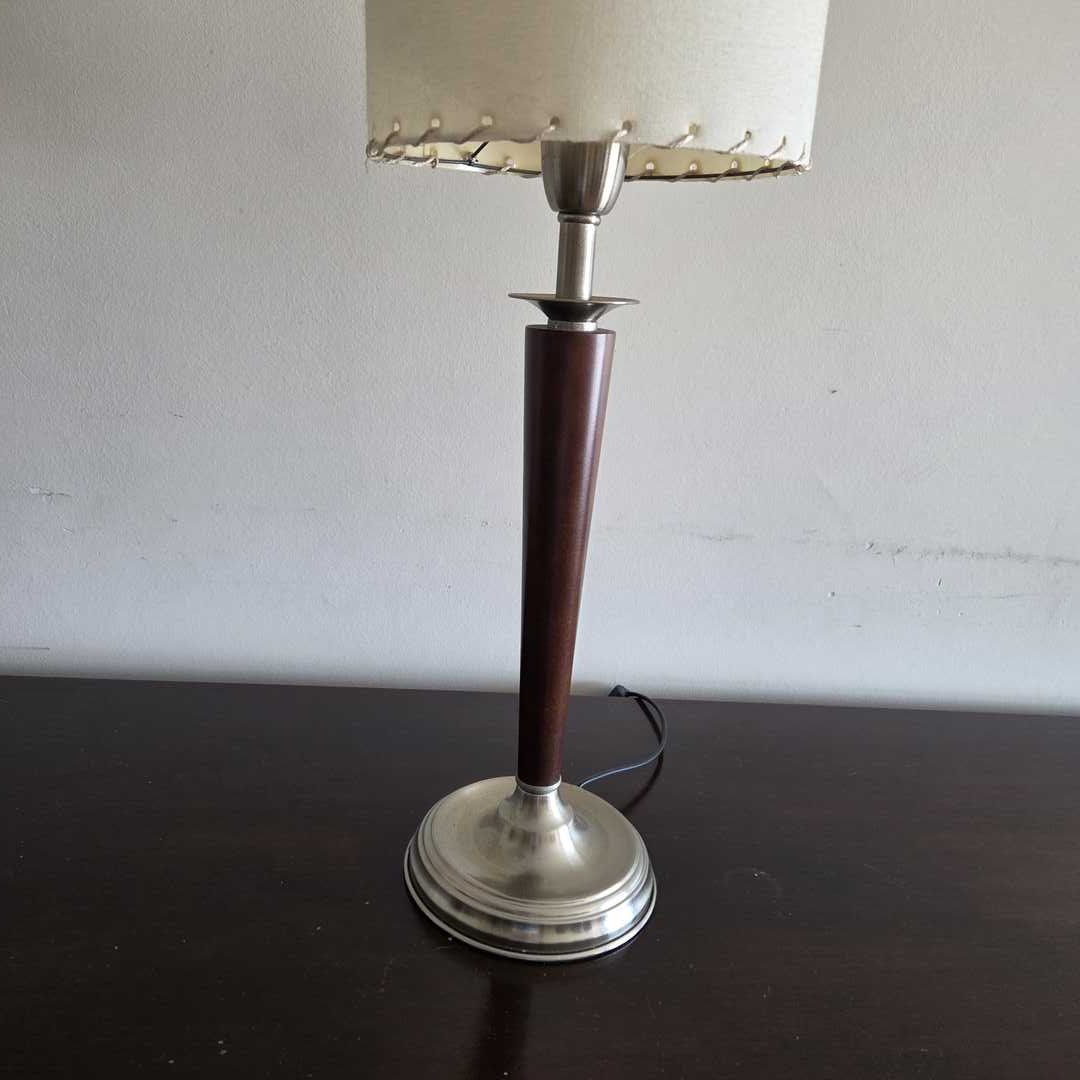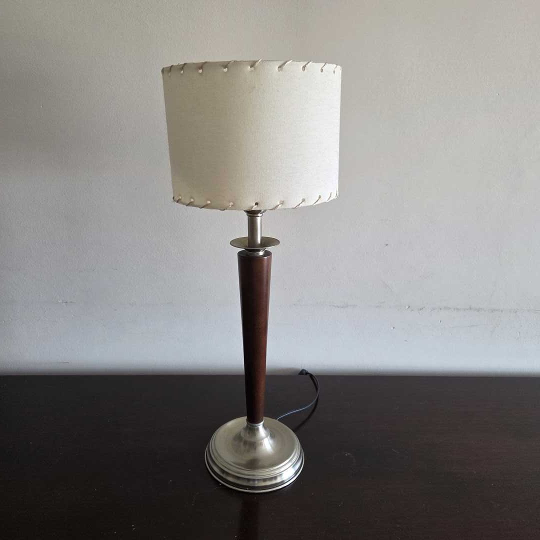 Velador con base cromada y estructura en madera. Diám base 14 cm. Alt 56 cm.