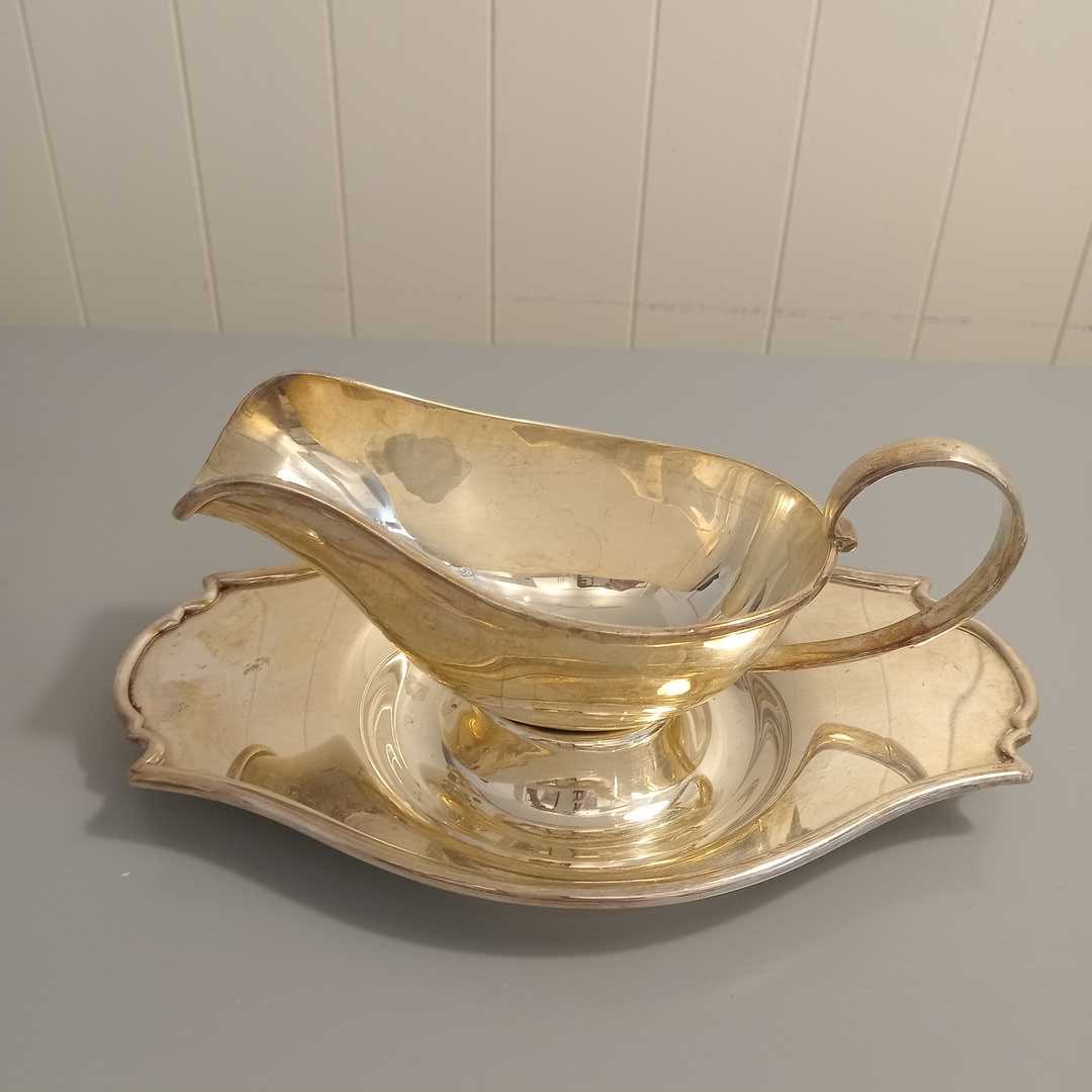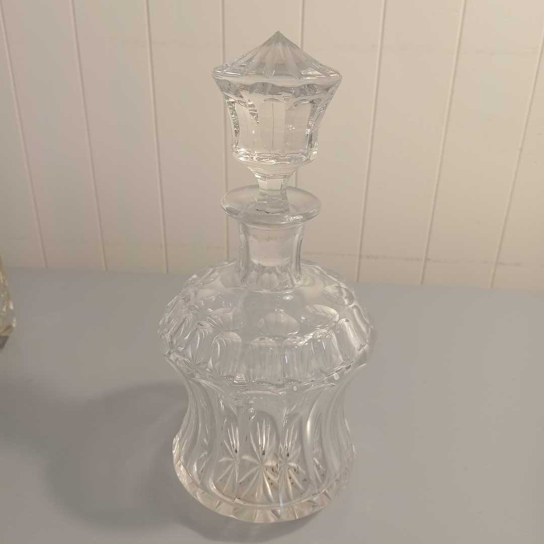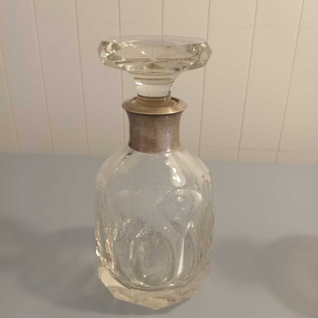 Botellón con virola en metal plateado, otro cristal tallado, 2 ensaladeras en cristal con virola en metal, salsera en metal plateado, centro en metal plateado, cubiertos de servir sueltos, bandeja rectangular con asas 38 x 29 cm (medida sin asas).