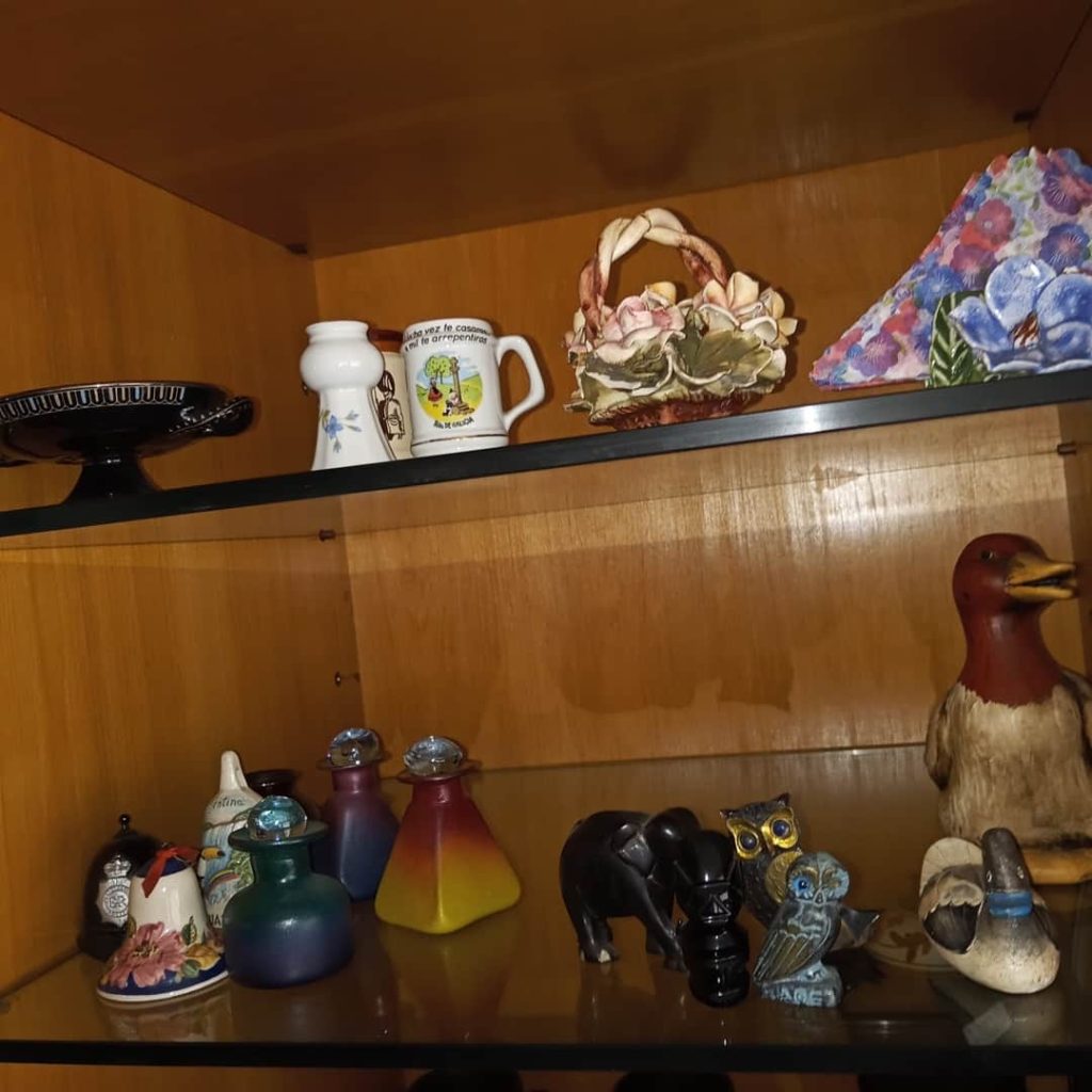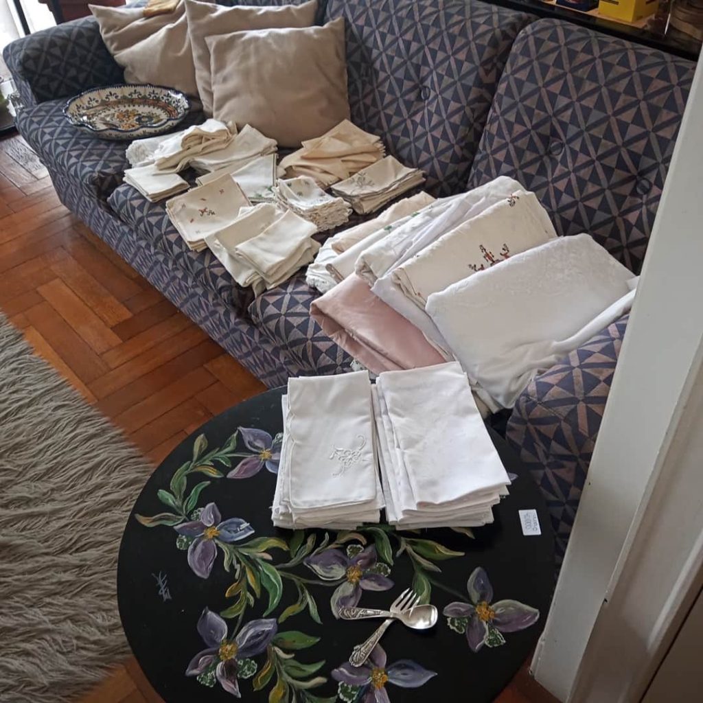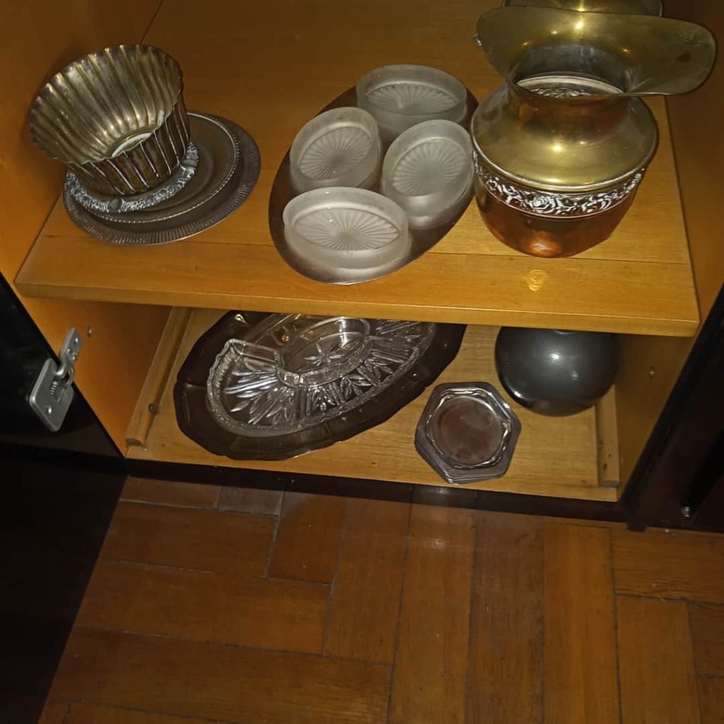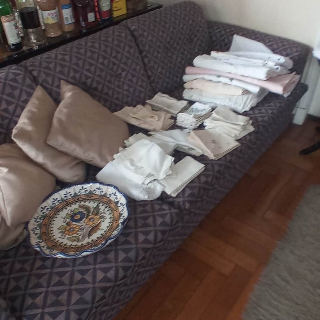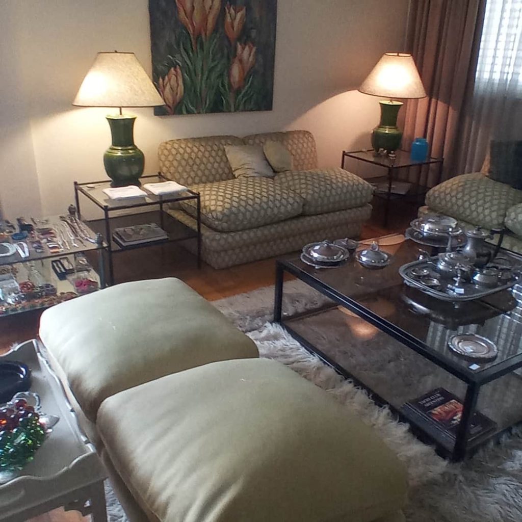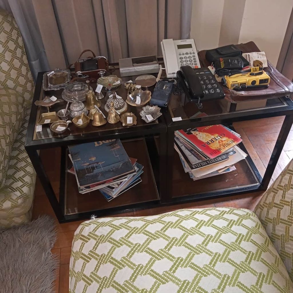 Sofá 4 cuerpos; sofá 1 cuerpo tapizado en pana; par butacones; par sillones 1 cuerpo estilo Francés; par sillas de sala con pata torneada; par butacones 2 cuerpos; butacón 3 cuerpos; 3 butacones 1 cuerpo; par banquetas puff; mesas auxiliares: 2 planos espejo y vítrea, diseño con estructura hierro y tapa vítrea, tapa redonda borde irregular, tapas redondas; consola diseño en hierro y vítrea; mueble auxiliar en madera lavada, tallada y patinada; comedor estilo Colonial Inglés laqueado en negro: mesa tapa oval y pie central con 10 sillas tapizado pana verde; vajillero laqueado en negro; cómoda estilo Inglés; cama con colchón; par mesas de luz estilo Inglés-Adornos y vajilla: juego de te en porcelana blanca Verbano; platos postre en porcelana europea; servicio de te en loza con guarda azul; servicio te en loza marrón; juego café en loza amarilla; tazas de te y café; servicio de mesa Microoven Brasilero con diseño botánico; servicio de mesa en porcelana Hartford con café y consomé; cristalería, juego copas talla flor y otras; par candeleros de vidrio prensado; copas talladas hialinas y verdes; botellones; hielera vintage; jarra con pico vertedor; caramelera de vidrio; lote de uvas vidrio; metal plateado, juego de cubiertos Plata Lappas Francés, con pescado; servicio de te y café; guisera y plato; lote cubiertos acero inoxidable; colección de cucharitas y cajitas; par gallos en bronce; reloj de mesa Alemán con números y agujas en bronce; “Perro” de bronce; óleos decorativos; espejo marco con espejitos, otros marco bronce, marco blanco, sol; araña estilo Holandés 2 niveles niquelada 12 luces; lámparas de mesa “Niño” en bronce, de cerámica degradé en violeta, de escritorio con pantalla de chapa, par de cerámica “Frutas”, par de cerámica verde oliva-Máquina de coser Singer; microondas Atma; pequeños electrodomésticos; enseres de cocina; jarra y copas en madera; bebidas; balcón: 2 silloncitos de hierro y mesa; atril antiguo y valija con elementos de pintura; libros; alfombras peludas; cortinas livianas y pesadas; almohadones, ropa de cama; manteles-Ropa mujer; accesorios, zapatos, carteras, bijoux y más…