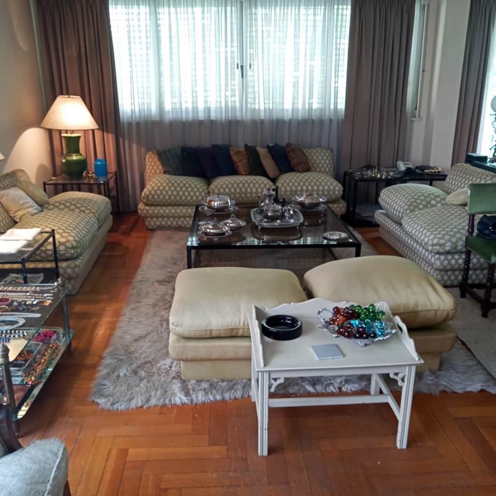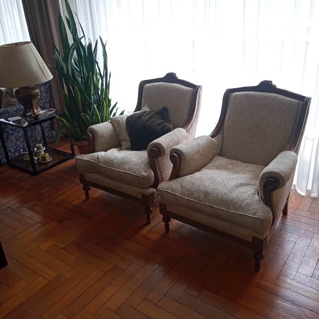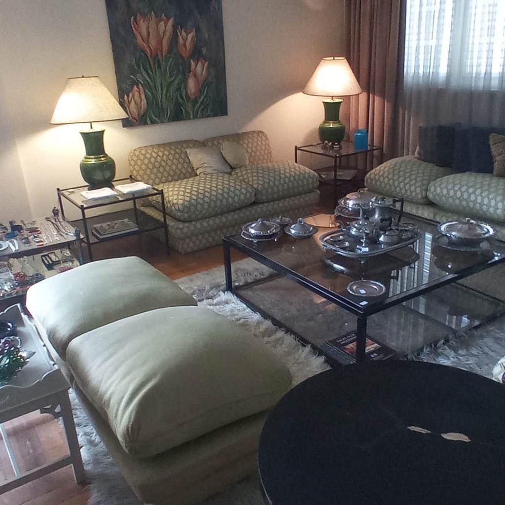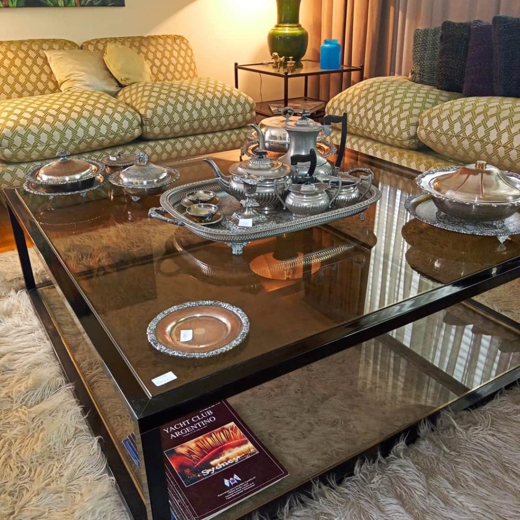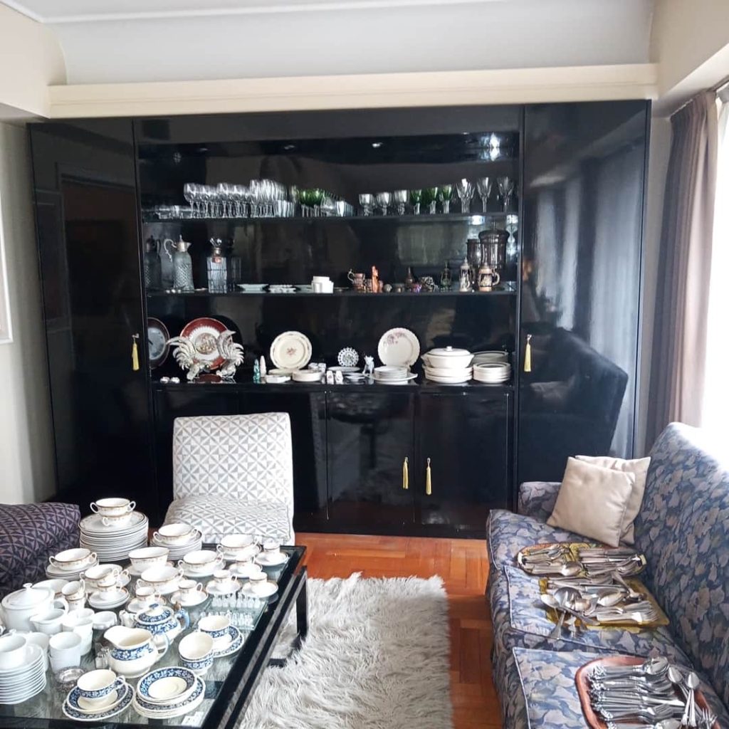 Sofá 4 cuerpos; sofá 1 cuerpo tapizado en pana; par butacones; par sillones 1 cuerpo estilo Francés; par sillas de sala con pata torneada; par butacones 2 cuerpos; butacón 3 cuerpos; 3 butacones 1 cuerpo; par banquetas puff; mesas auxiliares: 2 planos espejo y vítrea, diseño con estructura hierro y tapa vítrea, tapa redonda borde irregular, tapas redondas; consola diseño en hierro y vítrea; mueble auxiliar en madera lavada, tallada y patinada; comedor estilo Colonial Inglés laqueado en negro: mesa tapa oval y pie central con 10 sillas tapizado pana verde; vajillero laqueado en negro; cómoda estilo Inglés; cama con colchón; par mesas de luz estilo Inglés-Adornos y vajilla: juego de te en porcelana blanca Verbano; platos postre en porcelana europea; servicio de te en loza con guarda azul; servicio te en loza marrón; juego café en loza amarilla; tazas de te y café; servicio de mesa Microoven Brasilero con diseño botánico; servicio de mesa en porcelana Hartford con café y consomé; cristalería, juego copas talla flor y otras; par candeleros de vidrio prensado; copas talladas hialinas y verdes; botellones; hielera vintage; jarra con pico vertedor; caramelera de vidrio; lote de uvas vidrio; metal plateado, juego de cubiertos Plata Lappas Francés, con pescado; servicio de te y café; guisera y plato; lote cubiertos acero inoxidable; colección de cucharitas y cajitas; par gallos en bronce; reloj de mesa Alemán con números y agujas en bronce; “Perro” de bronce; óleos decorativos; espejo marco con espejitos, otros marco bronce, marco blanco, sol; araña estilo Holandés 2 niveles niquelada 12 luces; lámparas de mesa “Niño” en bronce, de cerámica degradé en violeta, de escritorio con pantalla de chapa, par de cerámica “Frutas”, par de cerámica verde oliva-Máquina de coser Singer; microondas Atma; pequeños electrodomésticos; enseres de cocina; jarra y copas en madera; bebidas; balcón: 2 silloncitos de hierro y mesa; atril antiguo y valija con elementos de pintura; libros; alfombras peludas; cortinas livianas y pesadas; almohadones, ropa de cama; manteles-Ropa mujer; accesorios, zapatos, carteras, bijoux y más…
