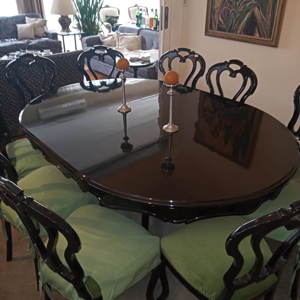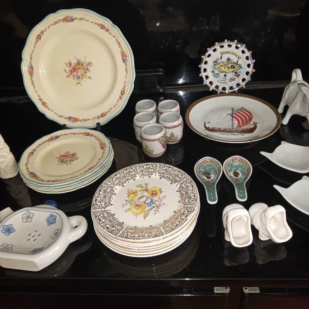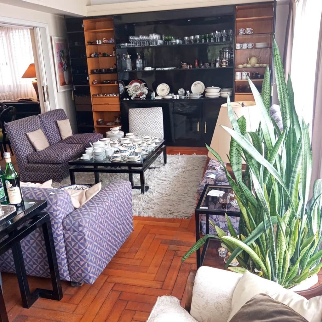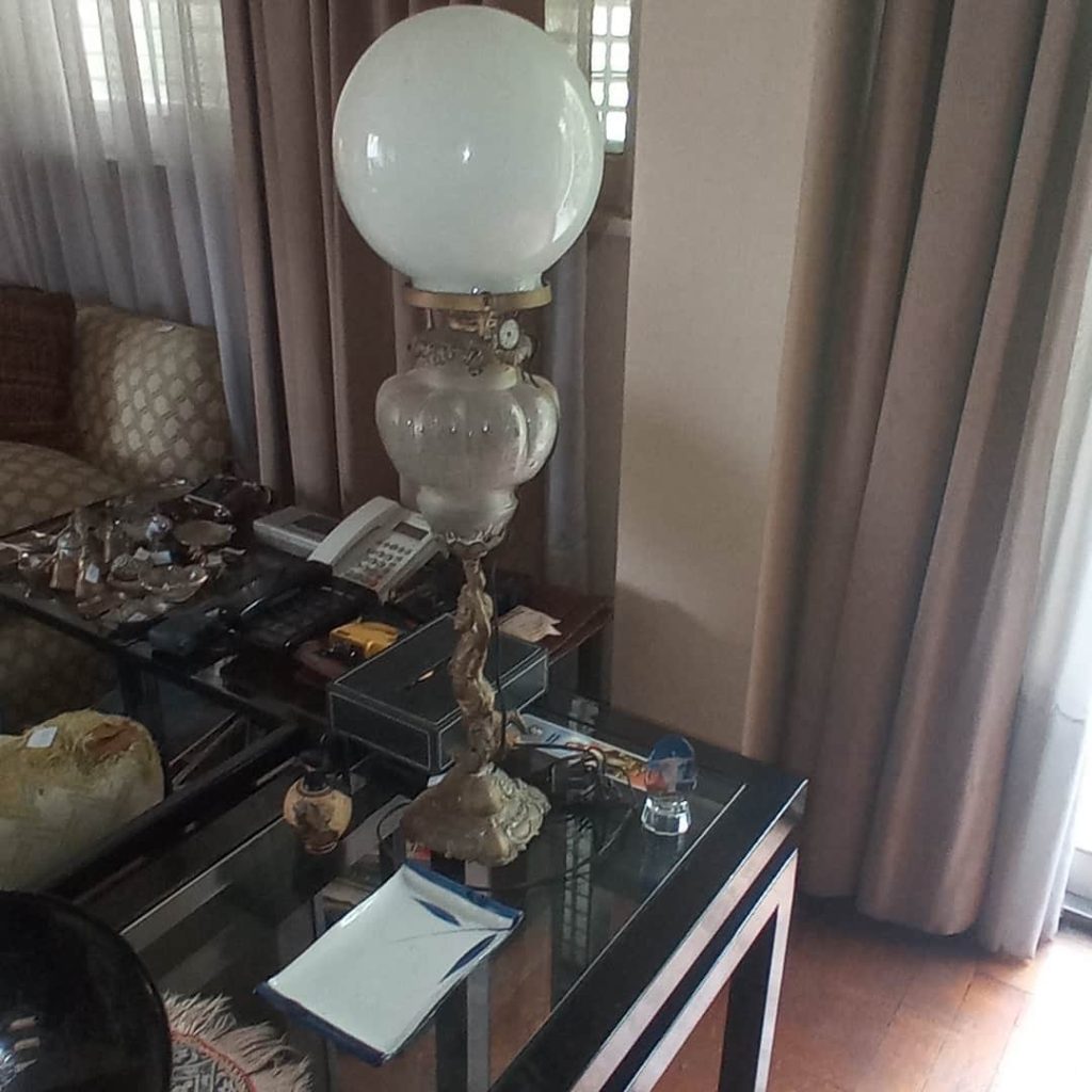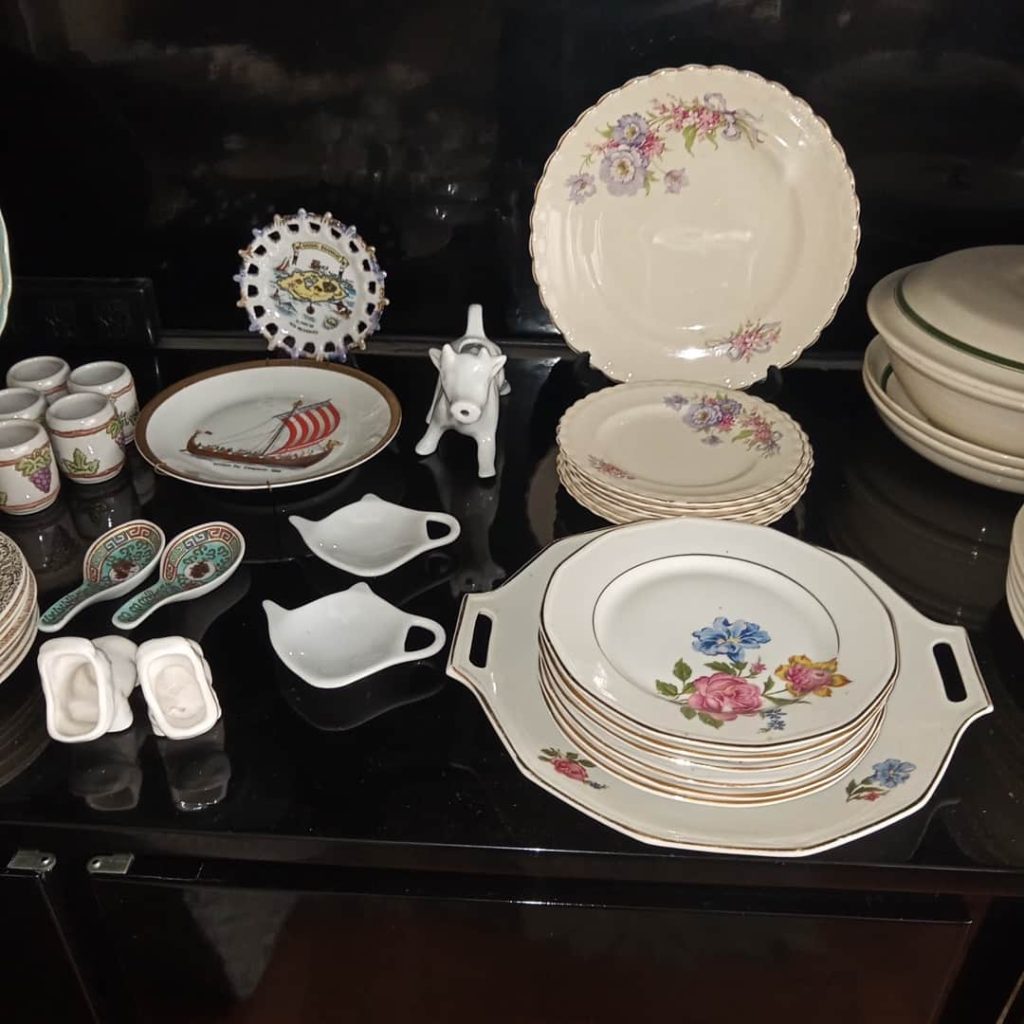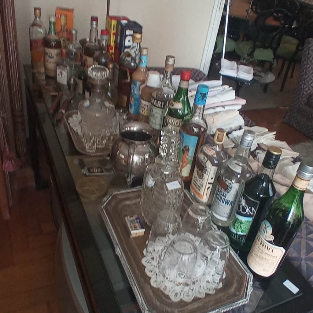 Sofá 4 cuerpos; sofá 1 cuerpo tapizado en pana; par butacones; par sillones 1 cuerpo estilo Francés; par sillas de sala con pata torneada; par butacones 2 cuerpos; butacón 3 cuerpos; 3 butacones 1 cuerpo; par banquetas puff; mesas auxiliares: 2 planos espejo y vítrea, diseño con estructura hierro y tapa vítrea, tapa redonda borde irregular, tapas redondas; consola diseño en hierro y vítrea; mueble auxiliar en madera lavada, tallada y patinada; comedor estilo Colonial Inglés laqueado en negro: mesa tapa oval y pie central con 10 sillas tapizado pana verde; vajillero laqueado en negro; cómoda estilo Inglés; cama con colchón; par mesas de luz estilo Inglés-Adornos y vajilla: juego de te en porcelana blanca Verbano; platos postre en porcelana europea; servicio de te en loza con guarda azul; servicio te en loza marrón; juego café en loza amarilla; tazas de te y café; servicio de mesa Microoven Brasilero con diseño botánico; servicio de mesa en porcelana Hartford con café y consomé; cristalería, juego copas talla flor y otras; par candeleros de vidrio prensado; copas talladas hialinas y verdes; botellones; hielera vintage; jarra con pico vertedor; caramelera de vidrio; lote de uvas vidrio; metal plateado, juego de cubiertos Plata Lappas Francés, con pescado; servicio de te y café; guisera y plato; lote cubiertos acero inoxidable; colección de cucharitas y cajitas; par gallos en bronce; reloj de mesa Alemán con números y agujas en bronce; “Perro” de bronce; óleos decorativos; espejo marco con espejitos, otros marco bronce, marco blanco, sol; araña estilo Holandés 2 niveles niquelada 12 luces; lámparas de mesa “Niño” en bronce, de cerámica degradé en violeta, de escritorio con pantalla de chapa, par de cerámica “Frutas”, par de cerámica verde oliva-Máquina de coser Singer; microondas Atma; pequeños electrodomésticos; enseres de cocina; jarra y copas en madera; bebidas; balcón: 2 silloncitos de hierro y mesa; atril antiguo y valija con elementos de pintura; libros; alfombras peludas; cortinas livianas y pesadas; almohadones, ropa de cama; manteles-Ropa mujer; accesorios, zapatos, carteras, bijoux y más…