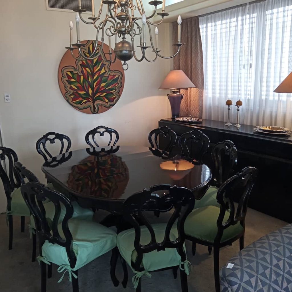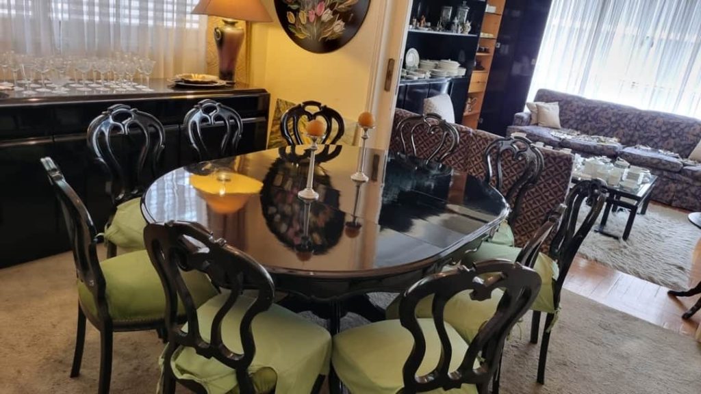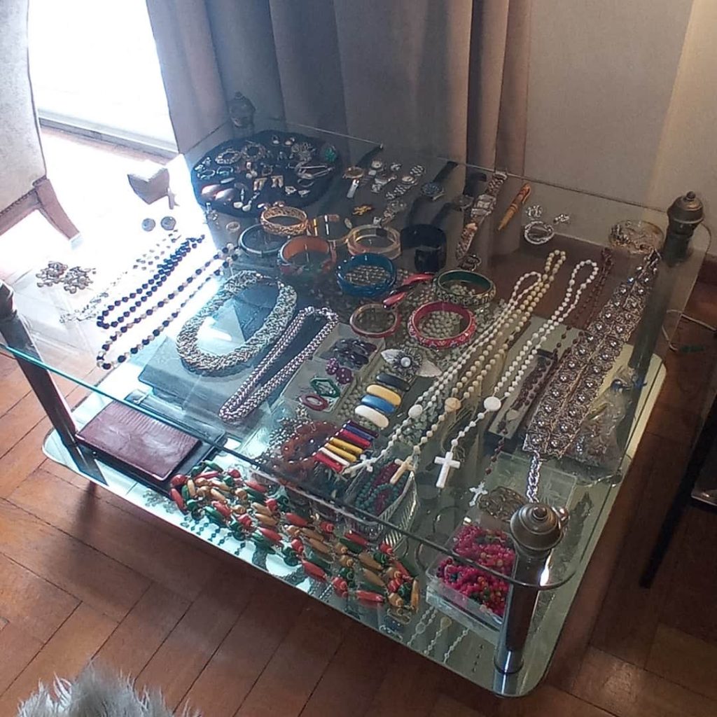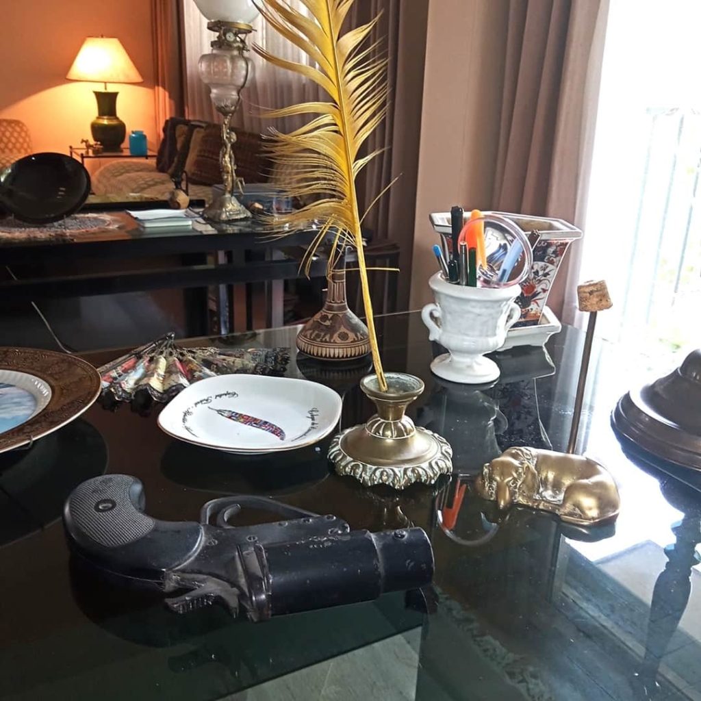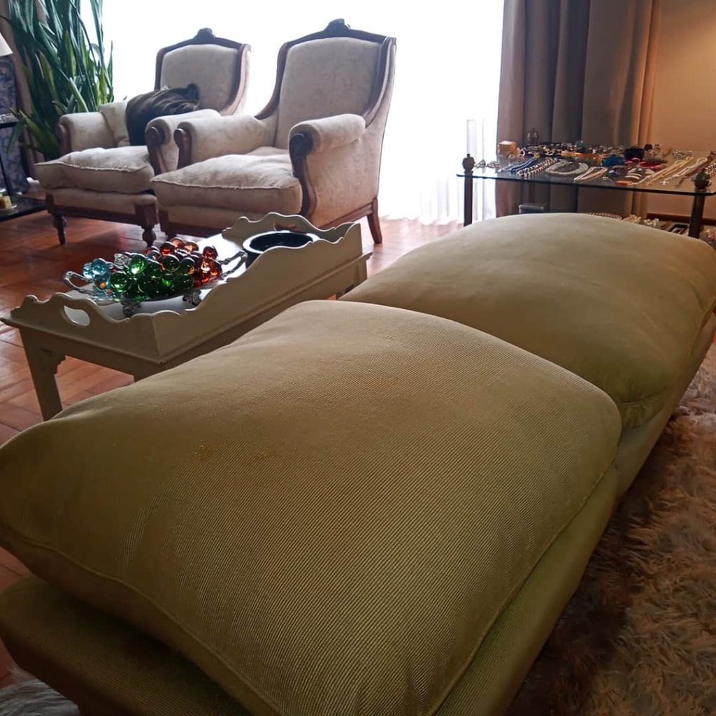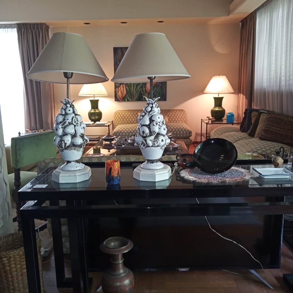 Sofá 4 cuerpos; sofá 1 cuerpo tapizado en pana; par butacones; par sillones 1 cuerpo estilo Francés; par sillas de sala con pata torneada; par butacones 2 cuerpos; butacón 3 cuerpos; 3 butacones 1 cuerpo; par banquetas puff; mesas auxiliares: 2 planos espejo y vítrea, diseño con estructura hierro y tapa vítrea, tapa redonda borde irregular, tapas redondas; consola diseño en hierro y vítrea; mueble auxiliar en madera lavada, tallada y patinada; comedor estilo Colonial Inglés laqueado en negro: mesa tapa oval y pie central con 10 sillas tapizado pana verde; vajillero laqueado en negro; cómoda estilo Inglés; cama con colchón; par mesas de luz estilo Inglés-Adornos y vajilla: juego de te en porcelana blanca Verbano; platos postre en porcelana europea; servicio de te en loza con guarda azul; servicio te en loza marrón; juego café en loza amarilla; tazas de te y café; servicio de mesa Microoven Brasilero con diseño botánico; servicio de mesa en porcelana Hartford con café y consomé; cristalería, juego copas talla flor y otras; par candeleros de vidrio prensado; copas talladas hialinas y verdes; botellones; hielera vintage; jarra con pico vertedor; caramelera de vidrio; lote de uvas vidrio; metal plateado, juego de cubiertos Plata Lappas Francés, con pescado; servicio de te y café; guisera y plato; lote cubiertos acero inoxidable; colección de cucharitas y cajitas; par gallos en bronce; reloj de mesa Alemán con números y agujas en bronce; “Perro” de bronce; óleos decorativos; espejo marco con espejitos, otros marco bronce, marco blanco, sol; araña estilo Holandés 2 niveles niquelada 12 luces; lámparas de mesa “Niño” en bronce, de cerámica degradé en violeta, de escritorio con pantalla de chapa, par de cerámica “Frutas”, par de cerámica verde oliva-Máquina de coser Singer; microondas Atma; pequeños electrodomésticos; enseres de cocina; jarra y copas en madera; bebidas; balcón: 2 silloncitos de hierro y mesa; atril antiguo y valija con elementos de pintura; libros; alfombras peludas; cortinas livianas y pesadas; almohadones, ropa de cama; manteles-Ropa mujer; accesorios, zapatos, carteras, bijoux y más…
