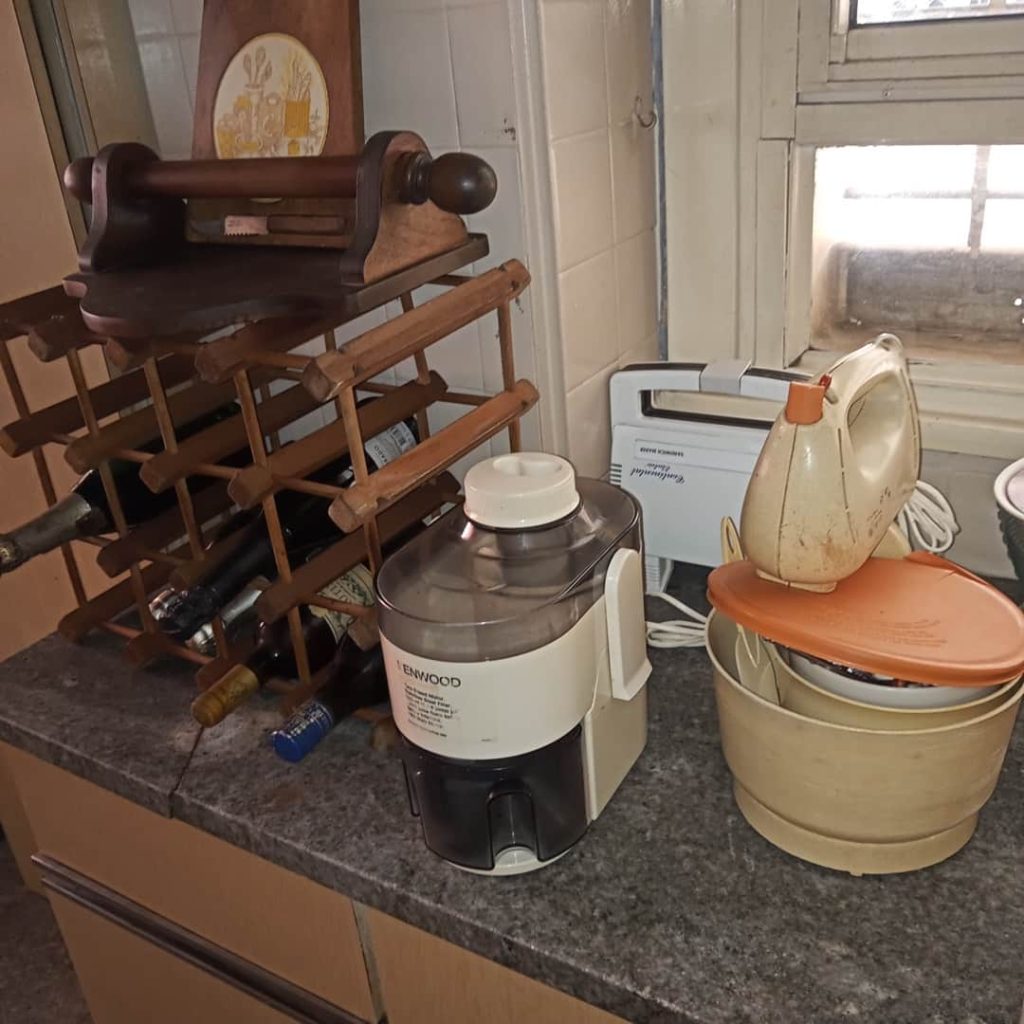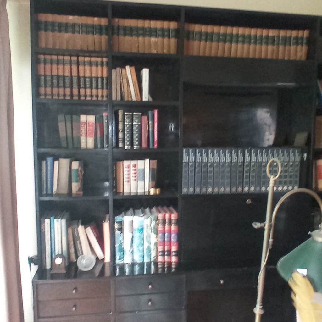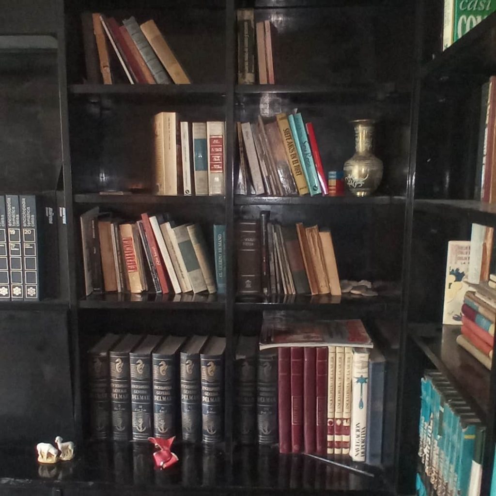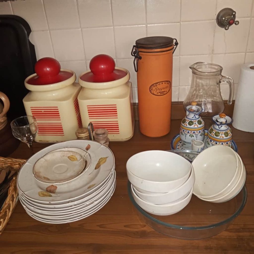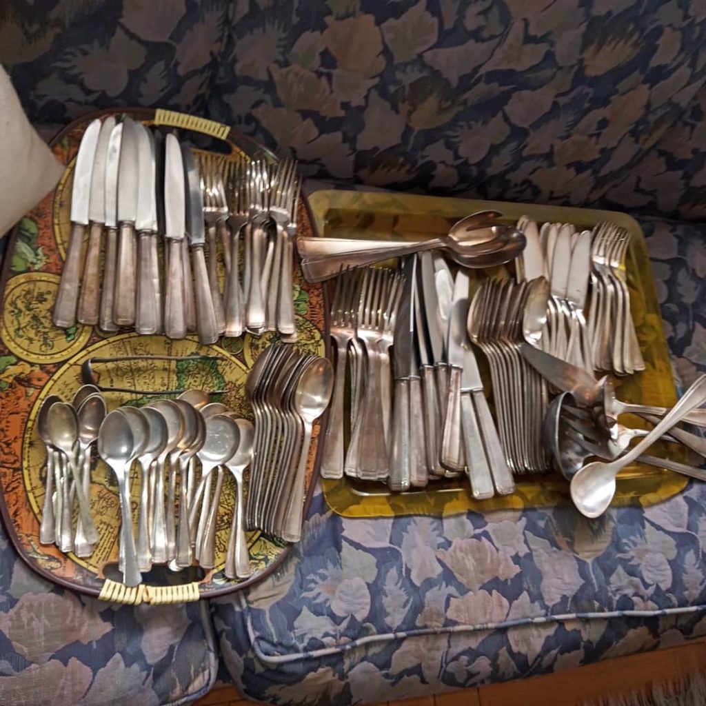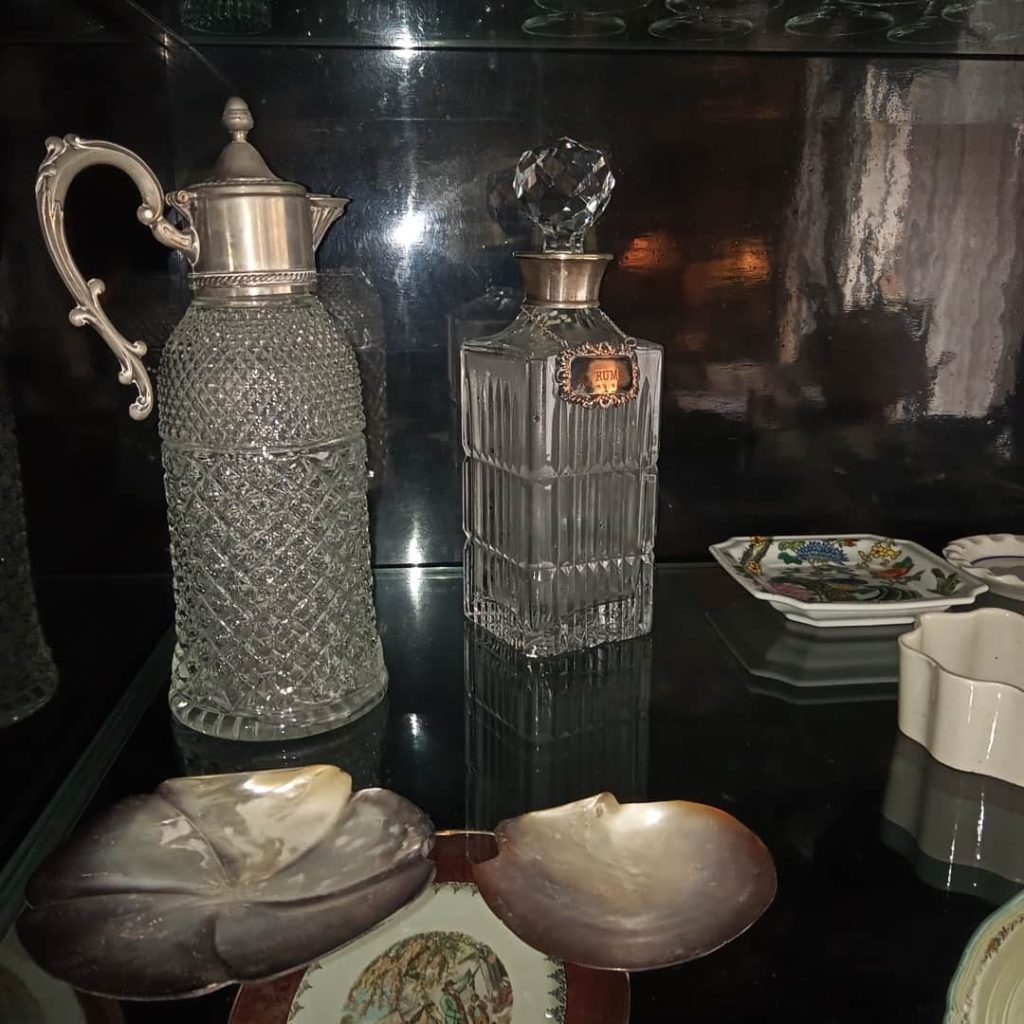 Sofá 4 cuerpos; sofá 1 cuerpo tapizado en pana; par butacones; par sillones 1 cuerpo estilo Francés; par sillas de sala con pata torneada; par butacones 2 cuerpos; butacón 3 cuerpos; 3 butacones 1 cuerpo; par banquetas puff; mesas auxiliares: 2 planos espejo y vítrea, diseño con estructura hierro y tapa vítrea, tapa redonda borde irregular, tapas redondas; consola diseño en hierro y vítrea; mueble auxiliar en madera lavada, tallada y patinada; comedor estilo Colonial Inglés laqueado en negro: mesa tapa oval y pie central con 10 sillas tapizado pana verde; vajillero laqueado en negro; cómoda estilo Inglés; cama con colchón; par mesas de luz estilo Inglés-Adornos y vajilla: juego de te en porcelana blanca Verbano; platos postre en porcelana europea; servicio de te en loza con guarda azul; servicio te en loza marrón; juego café en loza amarilla; tazas de te y café; servicio de mesa Microoven Brasilero con diseño botánico; servicio de mesa en porcelana Hartford con café y consomé; cristalería, juego copas talla flor y otras; par candeleros de vidrio prensado; copas talladas hialinas y verdes; botellones; hielera vintage; jarra con pico vertedor; caramelera de vidrio; lote de uvas vidrio; metal plateado, juego de cubiertos Plata Lappas Francés, con pescado; servicio de te y café; guisera y plato; lote cubiertos acero inoxidable; colección de cucharitas y cajitas; par gallos en bronce; reloj de mesa Alemán con números y agujas en bronce; “Perro” de bronce; óleos decorativos; espejo marco con espejitos, otros marco bronce, marco blanco, sol; araña estilo Holandés 2 niveles niquelada 12 luces; lámparas de mesa “Niño” en bronce, de cerámica degradé en violeta, de escritorio con pantalla de chapa, par de cerámica “Frutas”, par de cerámica verde oliva-Máquina de coser Singer; microondas Atma; pequeños electrodomésticos; enseres de cocina; jarra y copas en madera; bebidas; balcón: 2 silloncitos de hierro y mesa; atril antiguo y valija con elementos de pintura; libros; alfombras peludas; cortinas livianas y pesadas; almohadones, ropa de cama; manteles-Ropa mujer; accesorios, zapatos, carteras, bijoux y más…