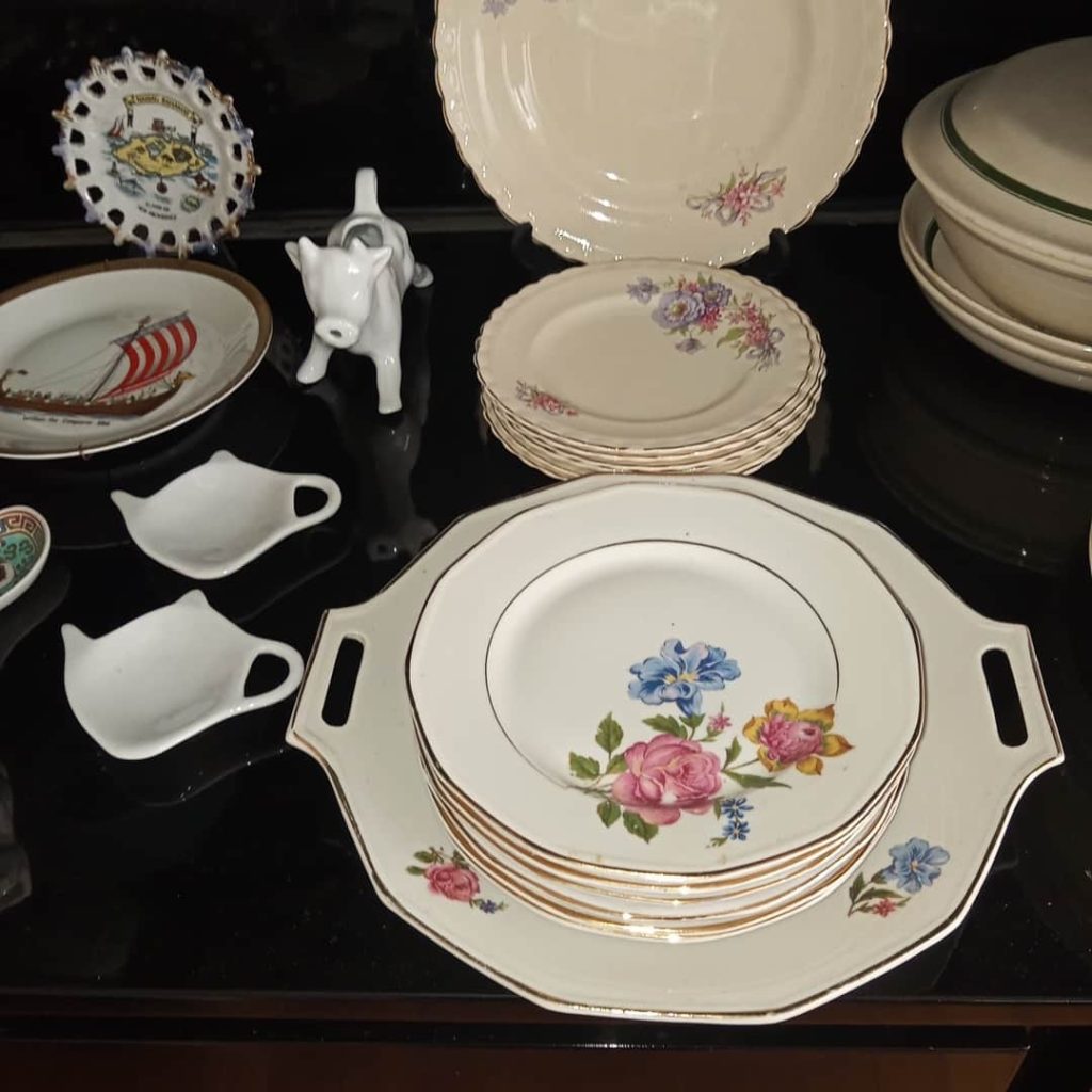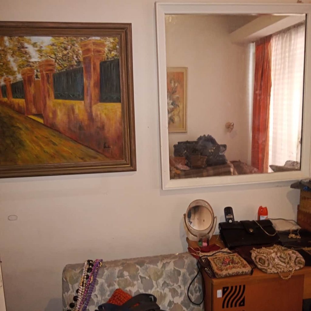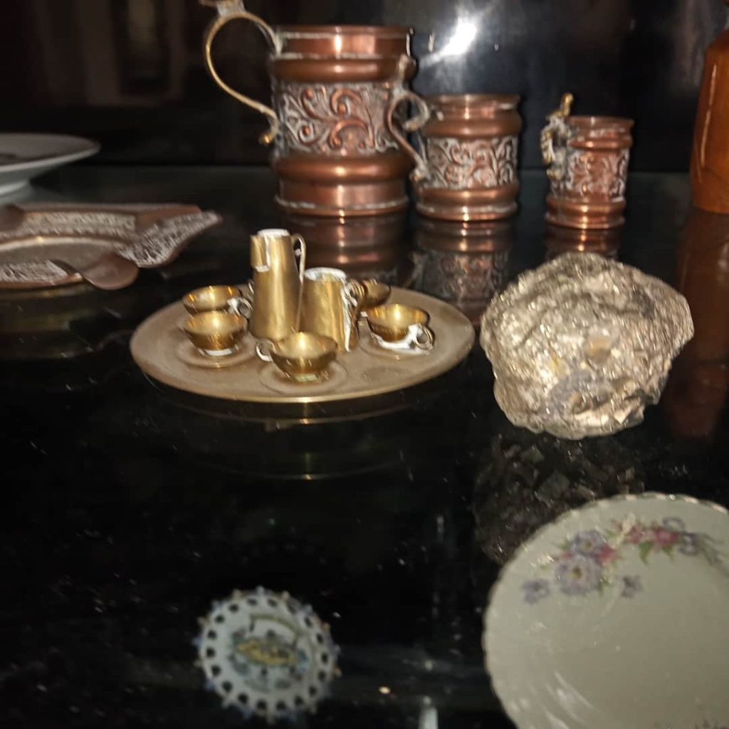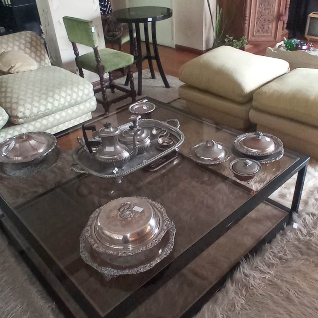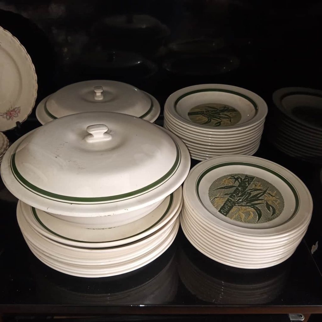Sofá 4 cuerpos; sofá 1 cuerpo tapizado en pana; par butacones; par sillones 1 cuerpo estilo Francés; par sillas de sala con pata torneada; par butacones 2 cuerpos; butacón 3 cuerpos; 3 butacones 1 cuerpo; par banquetas puff; mesas auxiliares: 2 planos espejo y vítrea, diseño con estructura hierro y tapa vítrea, tapa redonda borde irregular, tapas redondas; consola diseño en hierro y vítrea; mueble auxiliar en madera lavada, tallada y patinada; comedor estilo Colonial Inglés laqueado en negro: mesa tapa oval y pie central con 10 sillas tapizado pana verde; vajillero laqueado en negro; cómoda estilo Inglés; cama con colchón; par mesas de luz estilo Inglés-Adornos y vajilla: juego de te en porcelana blanca Verbano; platos postre en porcelana europea; servicio de te en loza con guarda azul; servicio te en loza marrón; juego café en loza amarilla; tazas de te y café; servicio de mesa Microoven Brasilero con diseño botánico; servicio de mesa en porcelana Hartford con café y consomé; cristalería, juego copas talla flor y otras; par candeleros de vidrio prensado; copas talladas hialinas y verdes; botellones; hielera vintage; jarra con pico vertedor; caramelera de vidrio; lote de uvas vidrio; metal plateado, juego de cubiertos Plata Lappas Francés, con pescado; servicio de te y café; guisera y plato; lote cubiertos acero inoxidable; colección de cucharitas y cajitas; par gallos en bronce; reloj de mesa Alemán con números y agujas en bronce; “Perro” de bronce; óleos decorativos; espejo marco con espejitos, otros marco bronce, marco blanco, sol; araña estilo Holandés 2 niveles niquelada 12 luces; lámparas de mesa “Niño” en bronce, de cerámica degradé en violeta, de escritorio con pantalla de chapa, par de cerámica “Frutas”, par de cerámica verde oliva-Máquina de coser Singer; microondas Atma; pequeños electrodomésticos; enseres de cocina; jarra y copas en madera; bebidas; balcón: 2 silloncitos de hierro y mesa; atril antiguo y valija con elementos de pintura; libros; alfombras peludas; cortinas livianas y pesadas; almohadones, ropa de cama; manteles-Ropa mujer; accesorios, zapatos, carteras, bijoux y más…